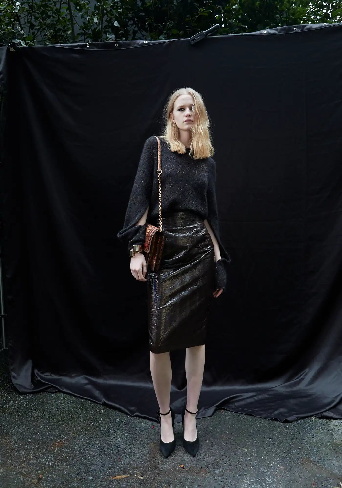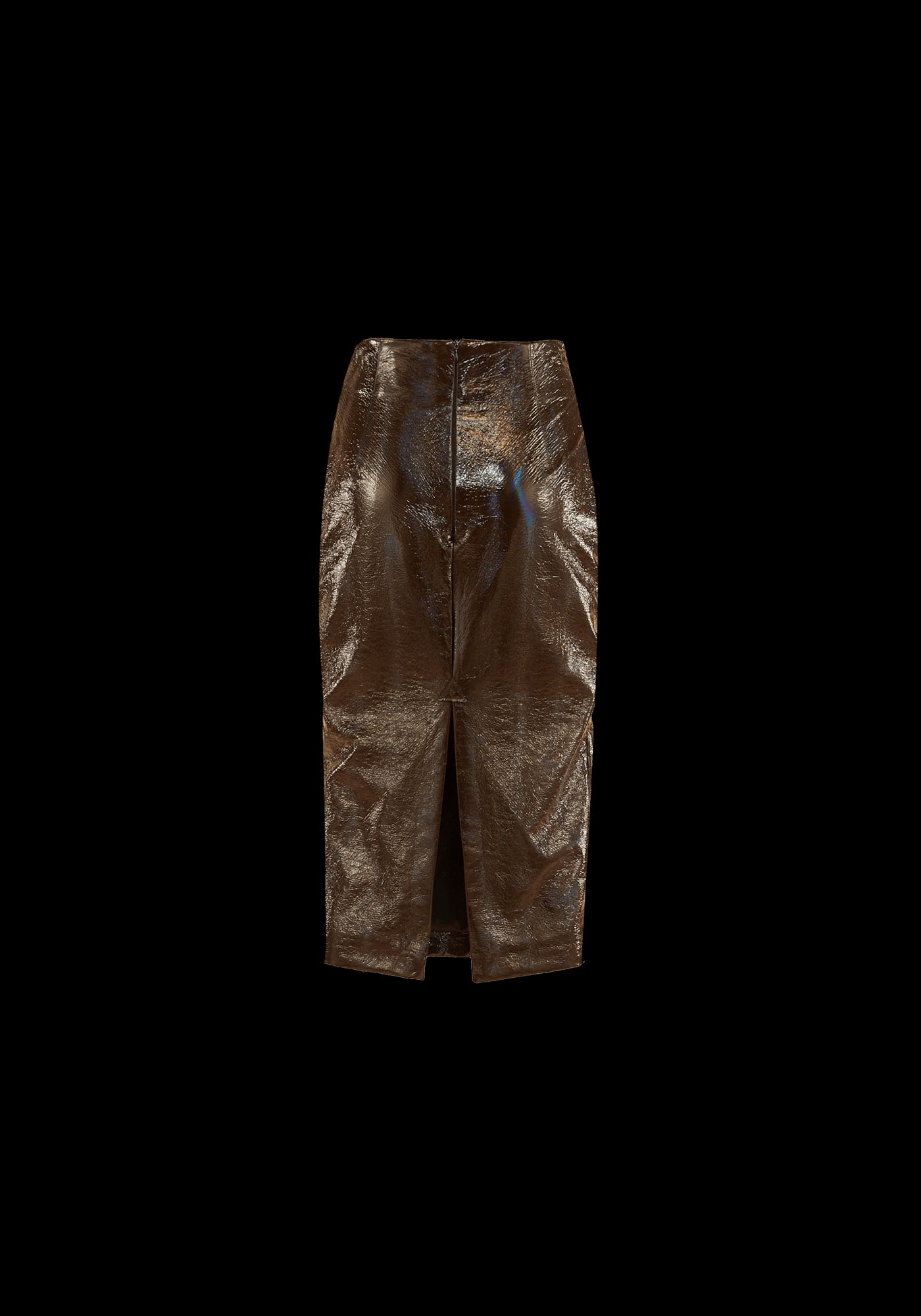 The Alena Skirt combines a sleek silhouette with a high-shine finish, creating a look that is both modern and sophisticated. Designed to sit at the natural waist, this midi-length skirt offers a flattering fit that elongates the figure. Its textured surface adds depth and dimension, adding a touch of bold style.