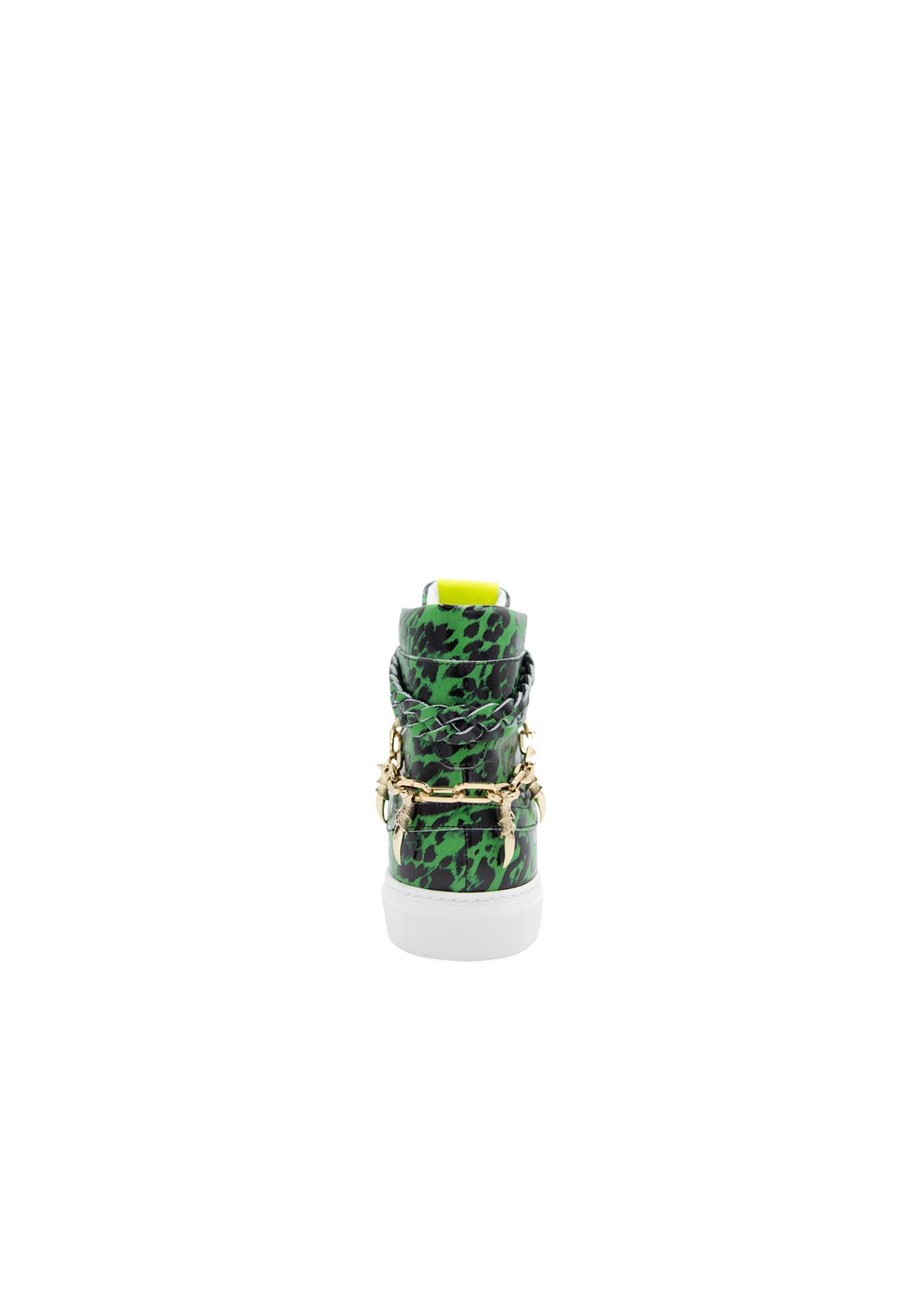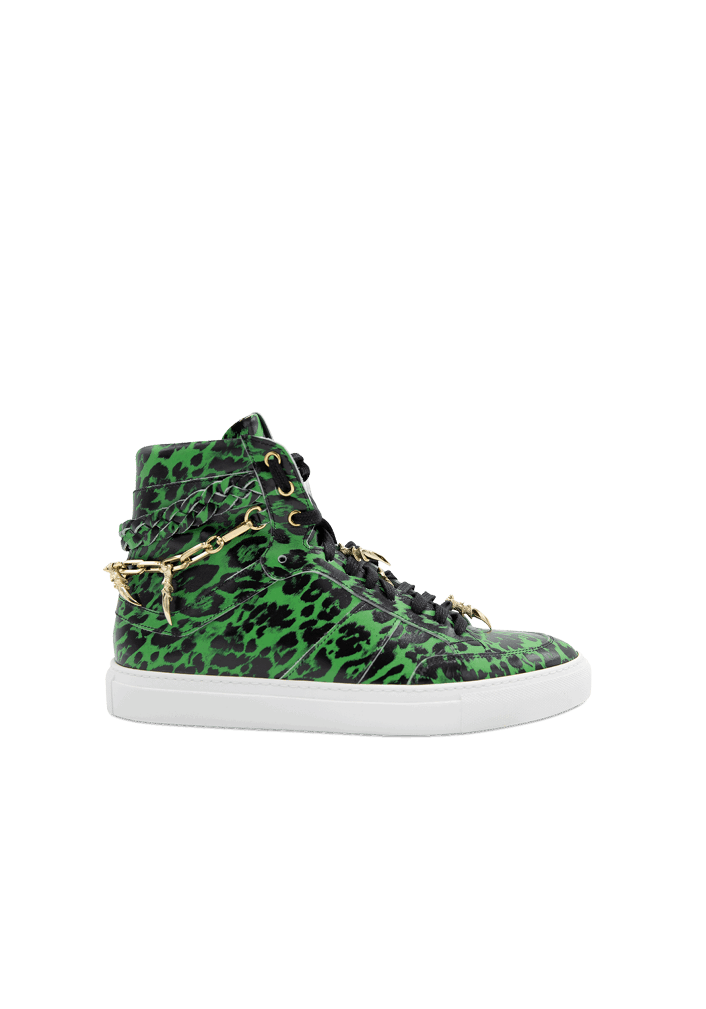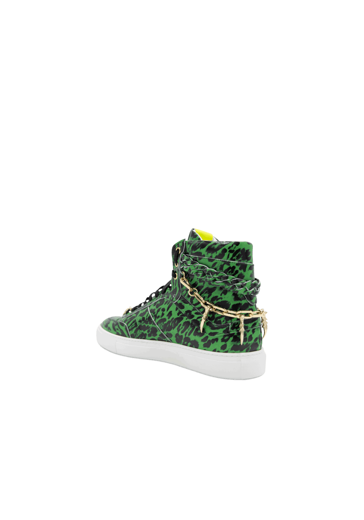 The Andy Woo sneakers express eccentricty and style through a green/black leopard pattern, a roped strap and a back golden chain. The high white platform elevates the garment contrasting with its daring aggressive look.