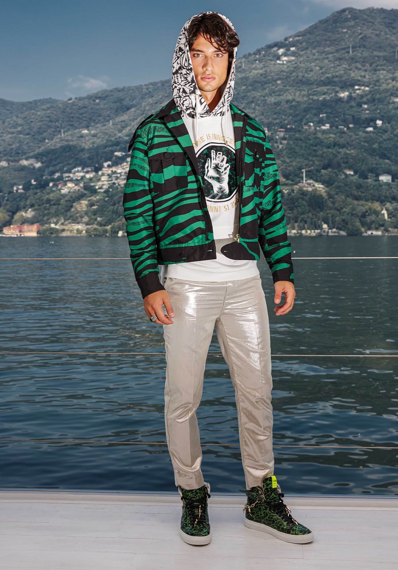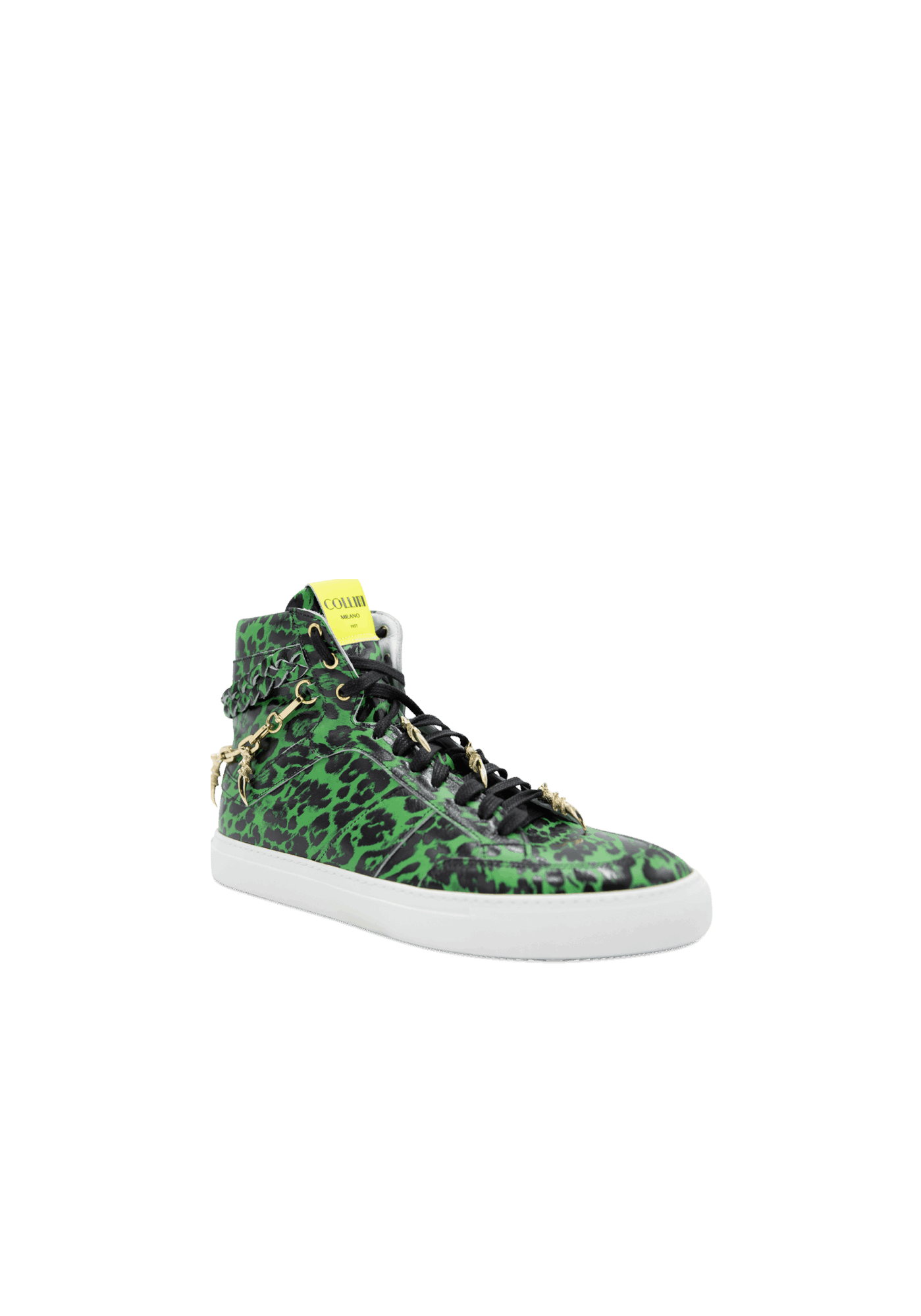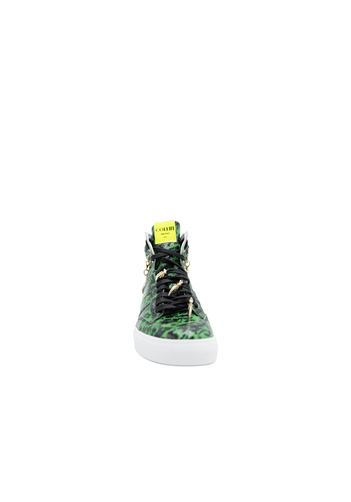 The Andy Woo sneakers express eccentricty and style through a green/black leopard pattern, a roped strap and a back golden chain. The high white platform elevates the garment contrasting with its daring aggressive look.