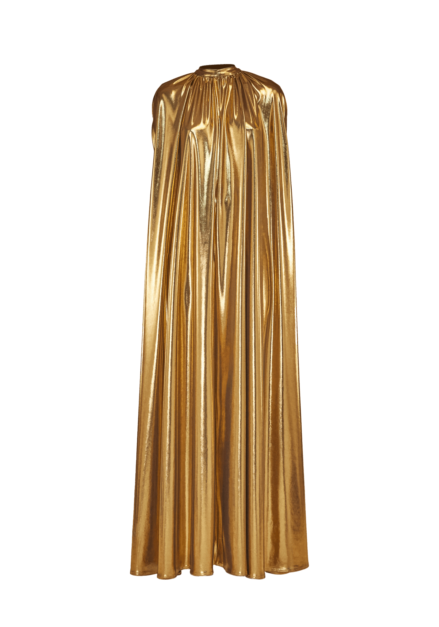 The Ava cape gown exudes elegance and sophistication. Crafted from a luxurious fabric with a mirrored finish, its flowing design can be styled in versatile ways. Cinched at the waist with a belt to create a defined silhouette, or left loose for a soft, effortless drape. The reflective sheen of the fabric adds a modern touch to the timeless silhouette, making this dress an ideal choice for any formal occasion, offering both comfort and style.