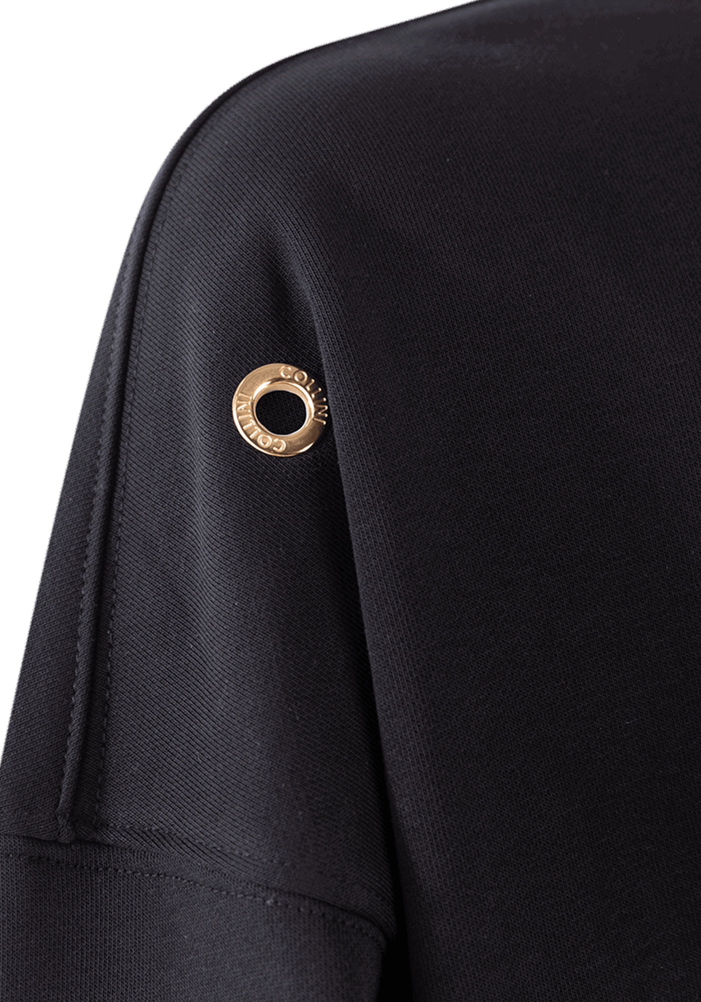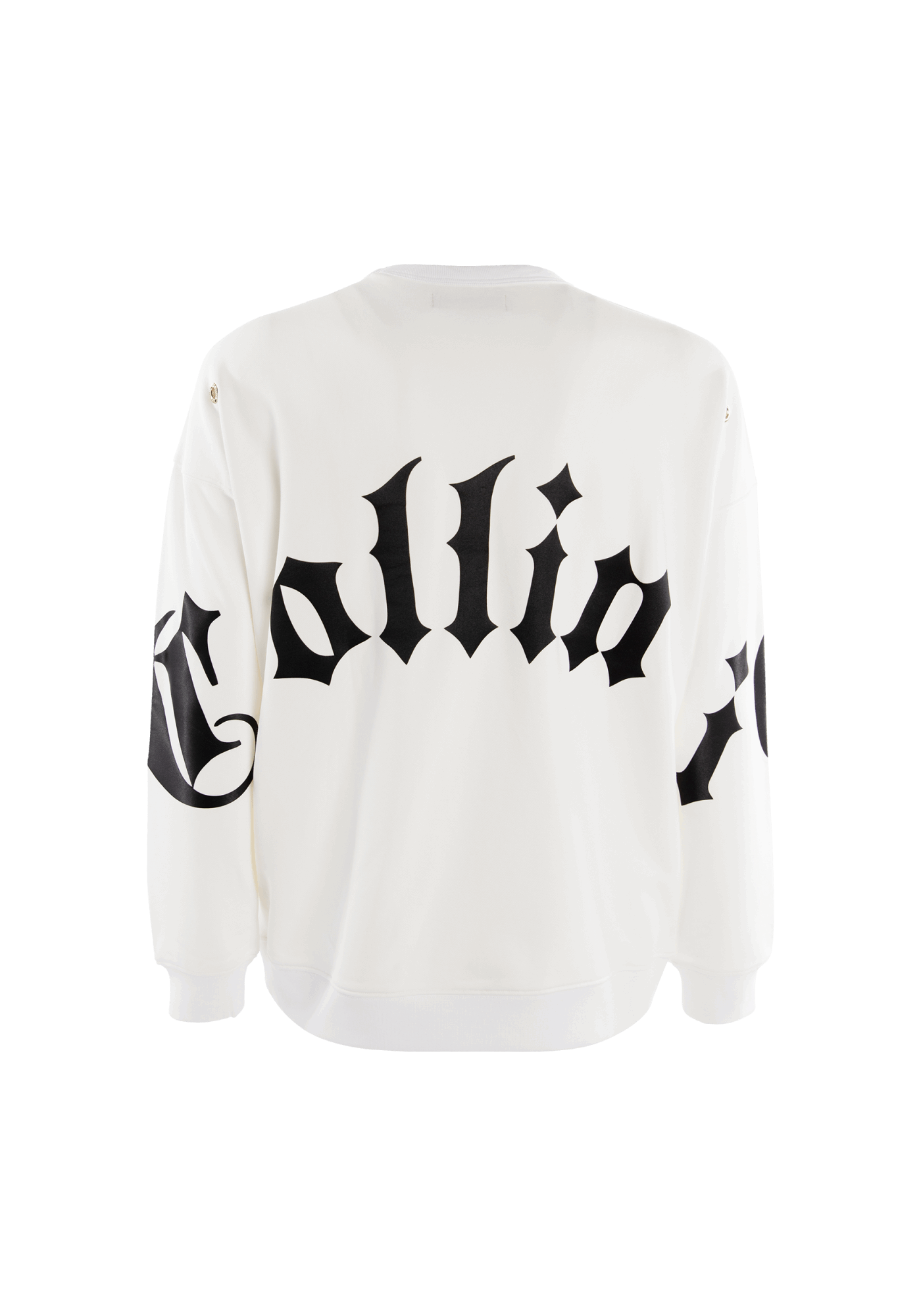The Banshee sweatshirt features the Collini name in gothic letters. Above are placed golden rings suitable to attach golden chains and spikes for a more aggressive and provocative look.