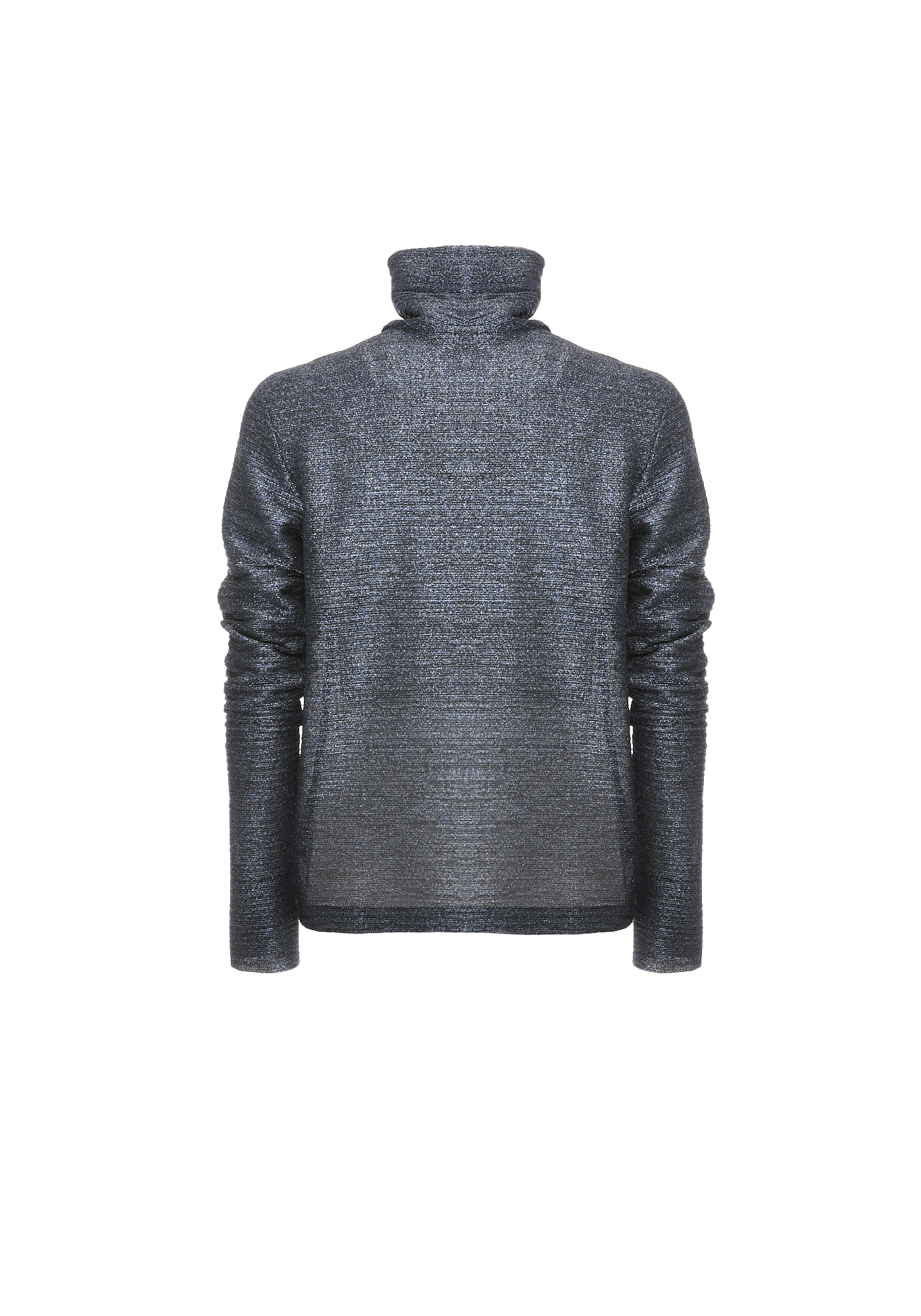 Knitted jumper featuring long sleeves and high collar. Crafted from intricate sheer yarns enriched with lurex, this top shimmers while ensuring warmth.