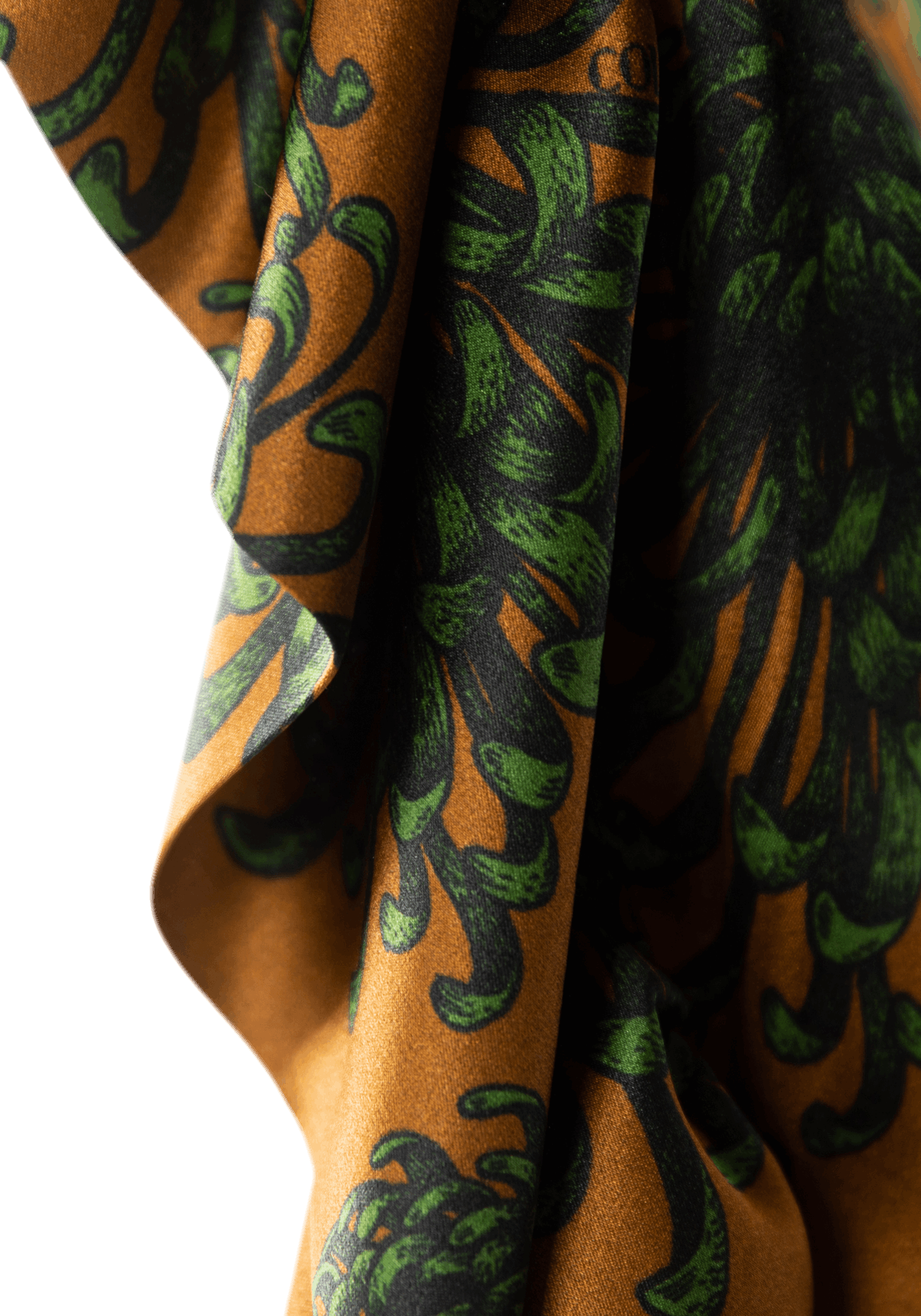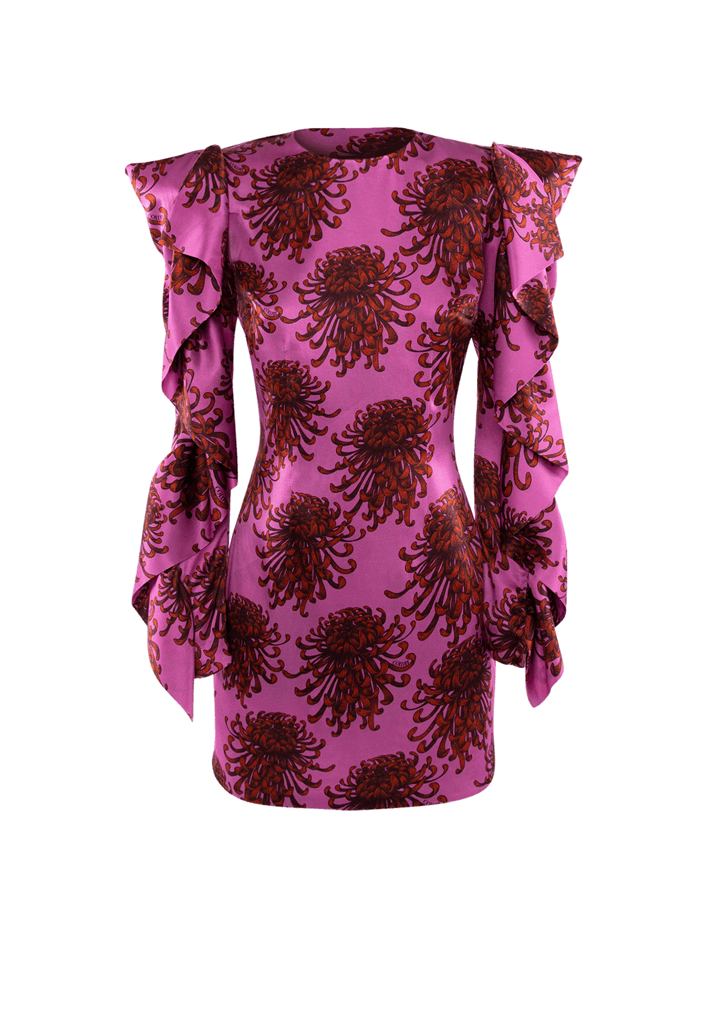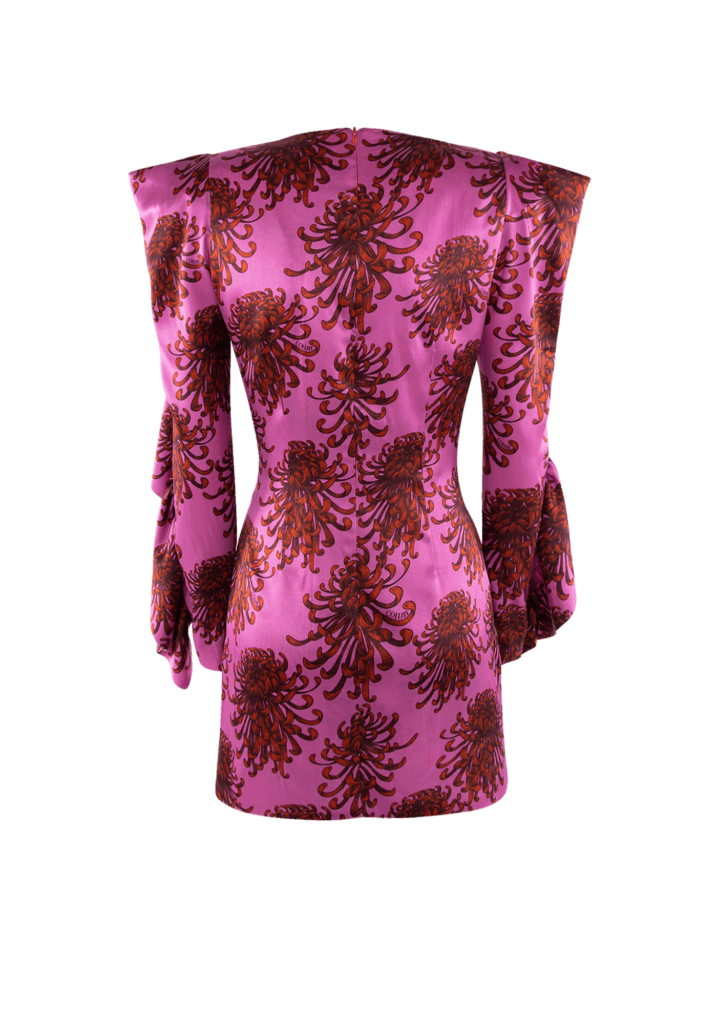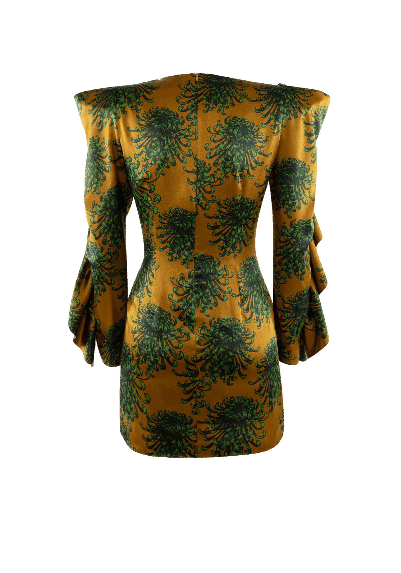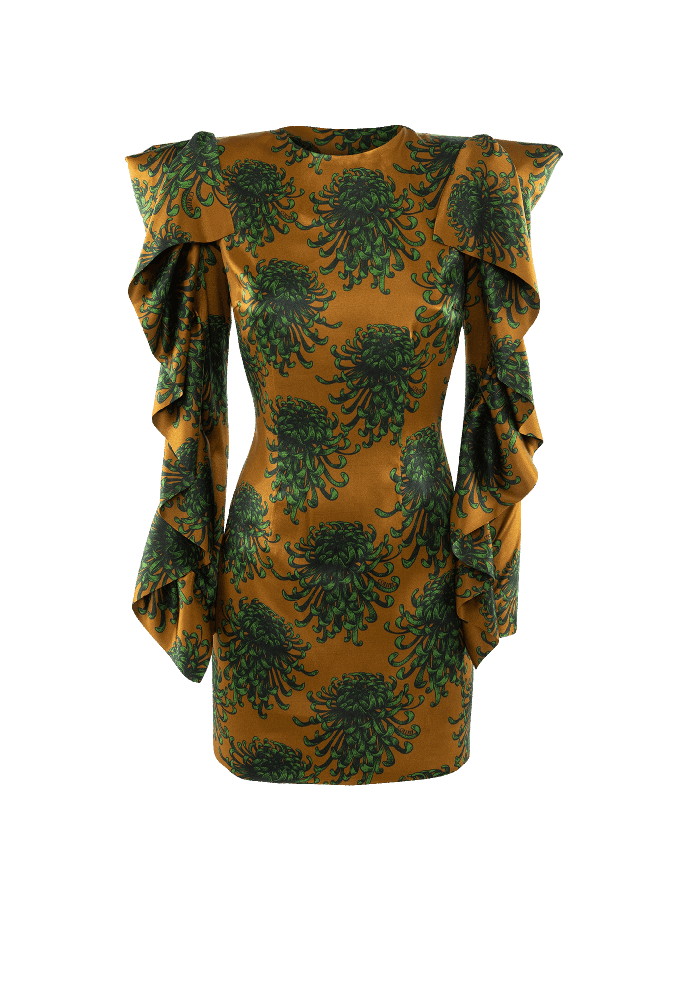 The flattering Betty dress adorned with an extravagantly designed pattern, brings out a sense of delicate femininity highlighted by fabric extensions flowing down the sleeves, contrasting with the formality of the garment's core shape.