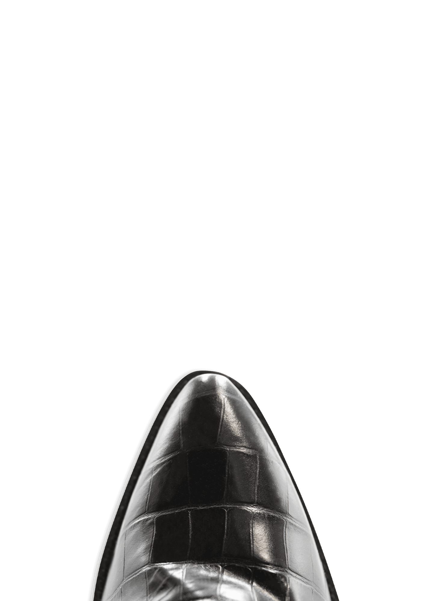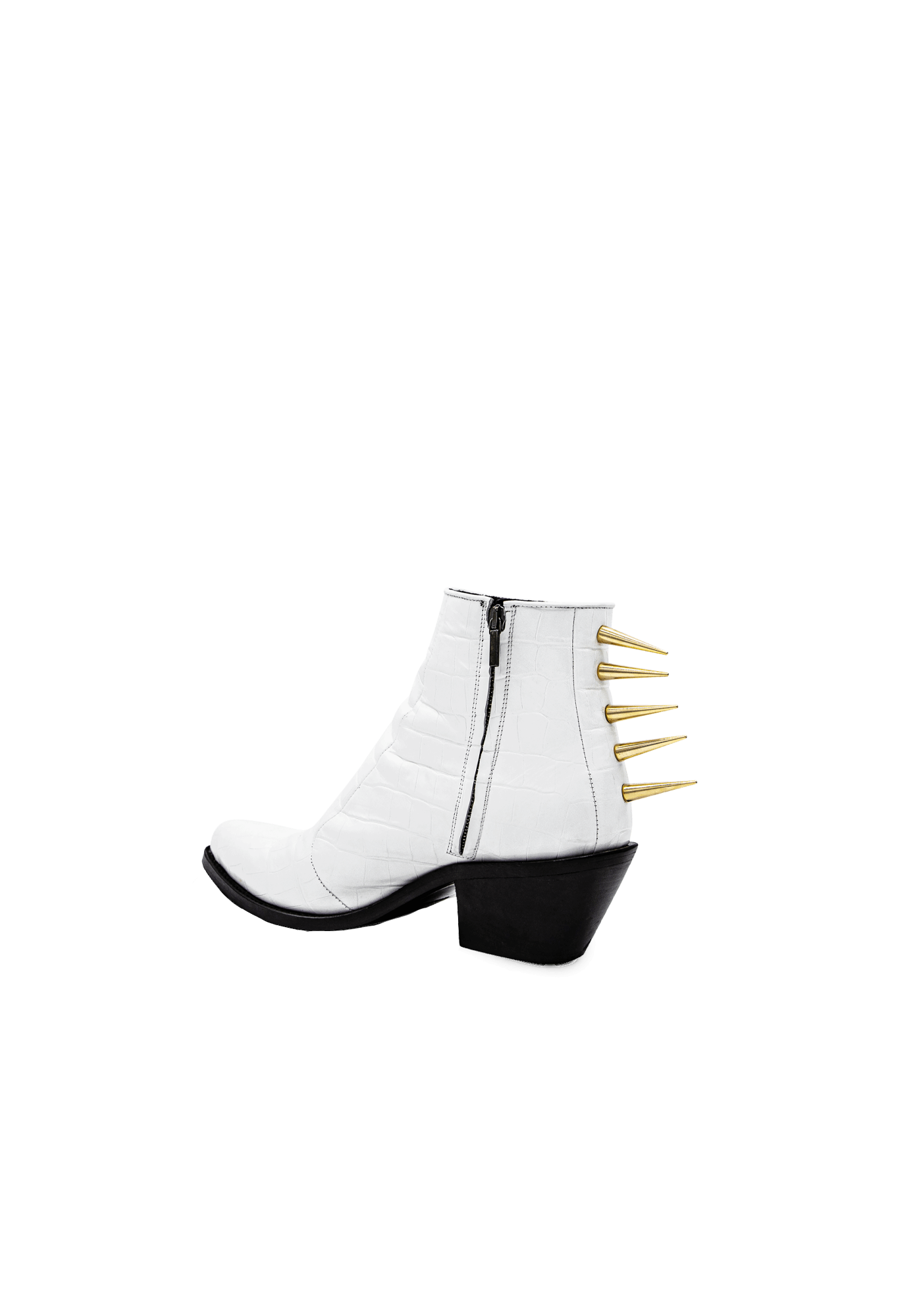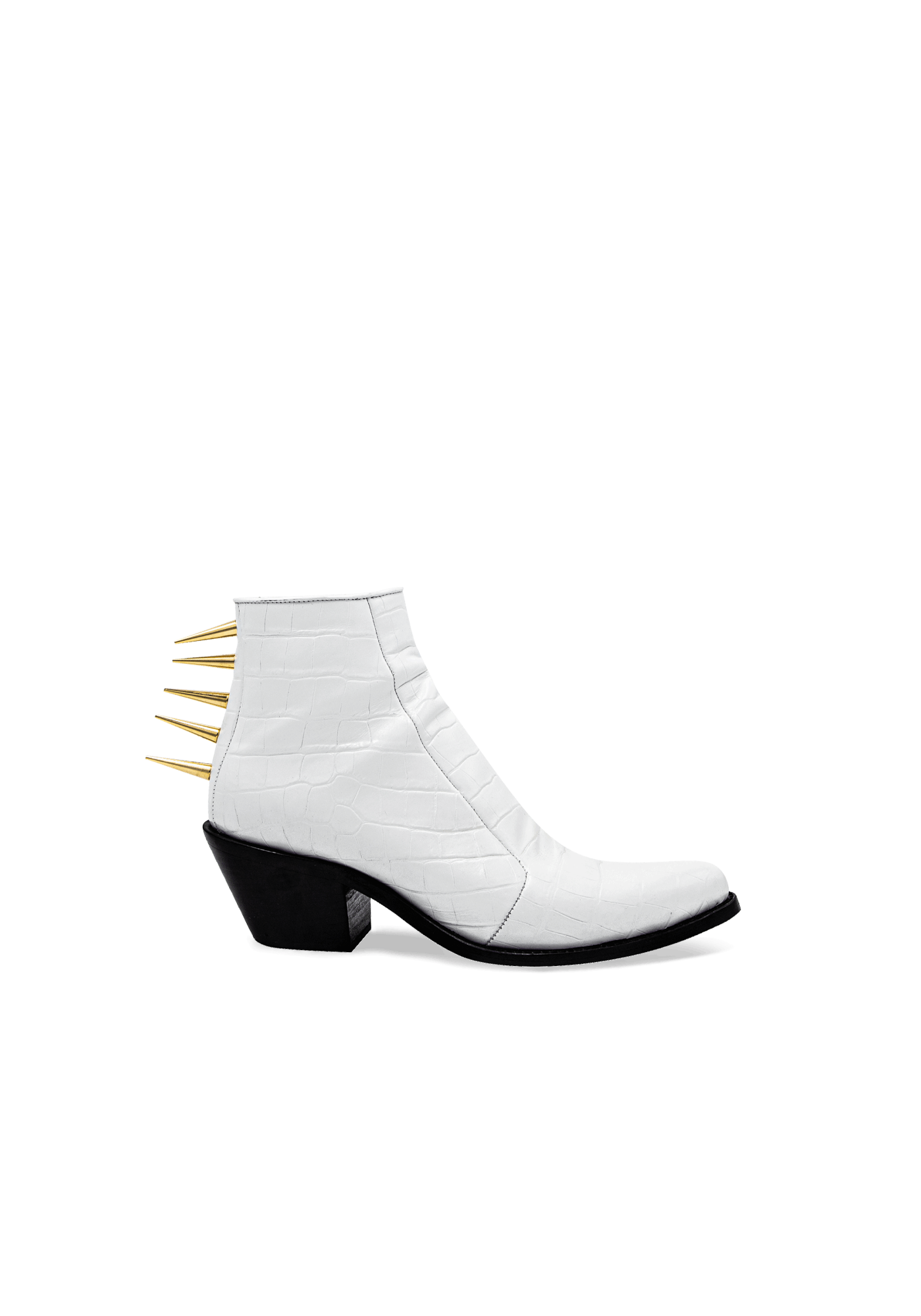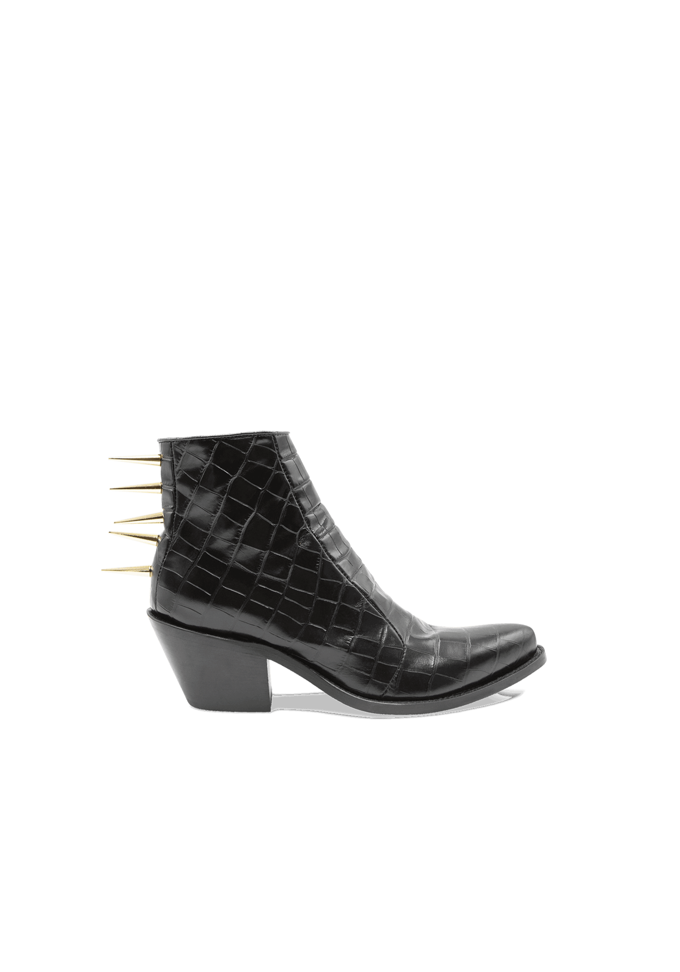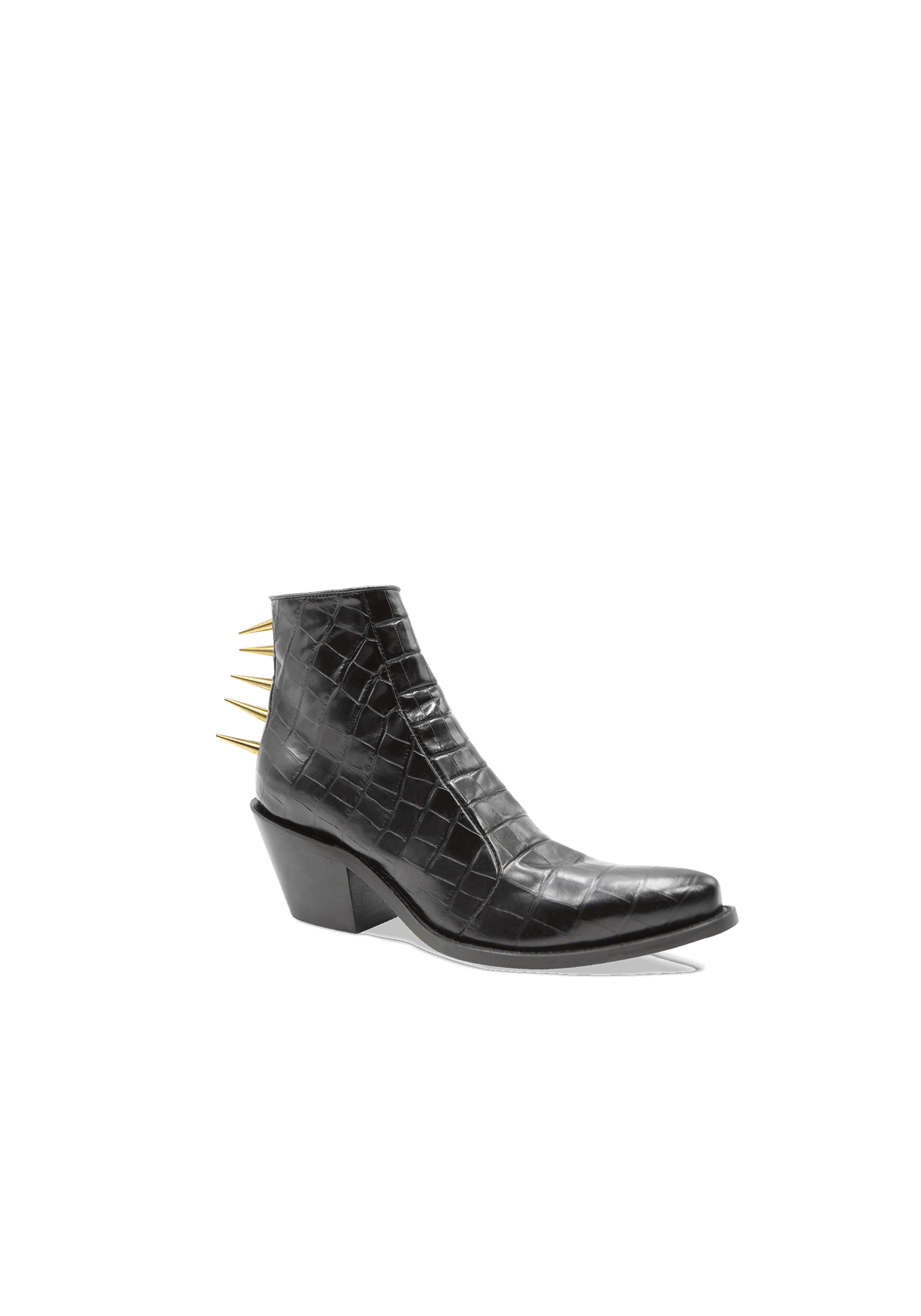 The Bruce mid-heeled leather façon ‘Croco’ ankle boots represent one of the key items of the brand. The extravagant and provocative golden spikes are attached to the back of the shoe shouting standing out singularity.