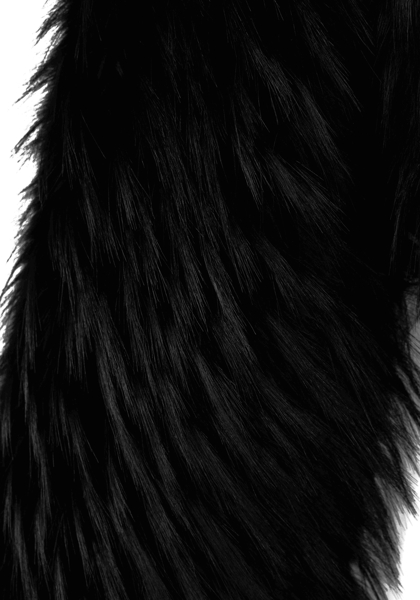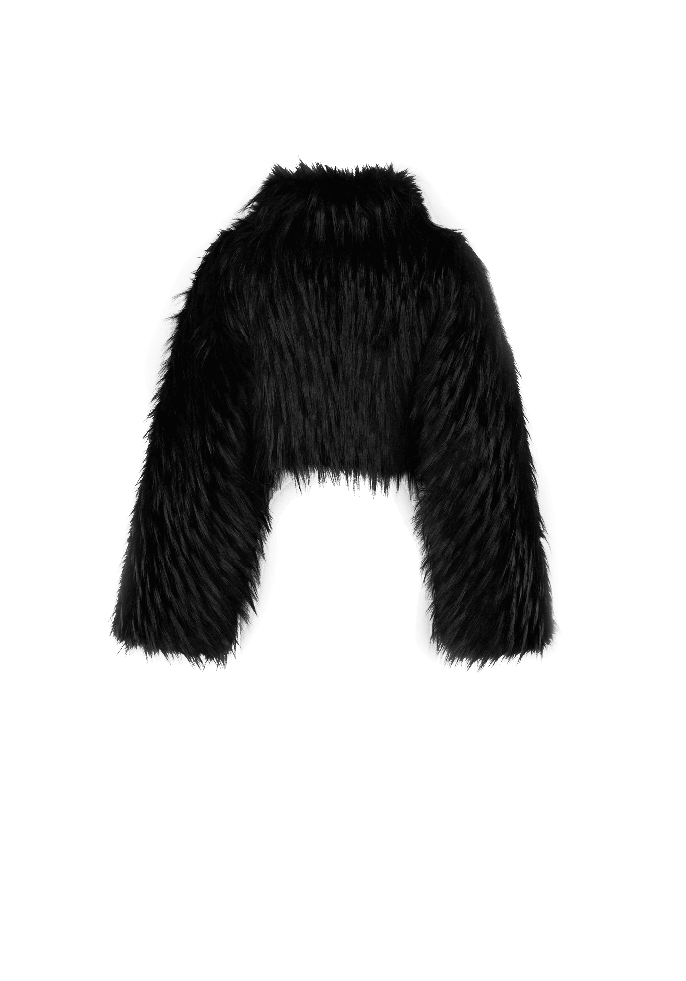 The Byron faux fur coat offers a luxurious and realistic texture, designed to replicate the richness of real fur. Its cropped design and structured shoulders create a contemporary shape, while the voluminous high collar enhances its sophisticated appeal. This piece features a seamless front with a concealed closure, adding to its sleek and refined look.