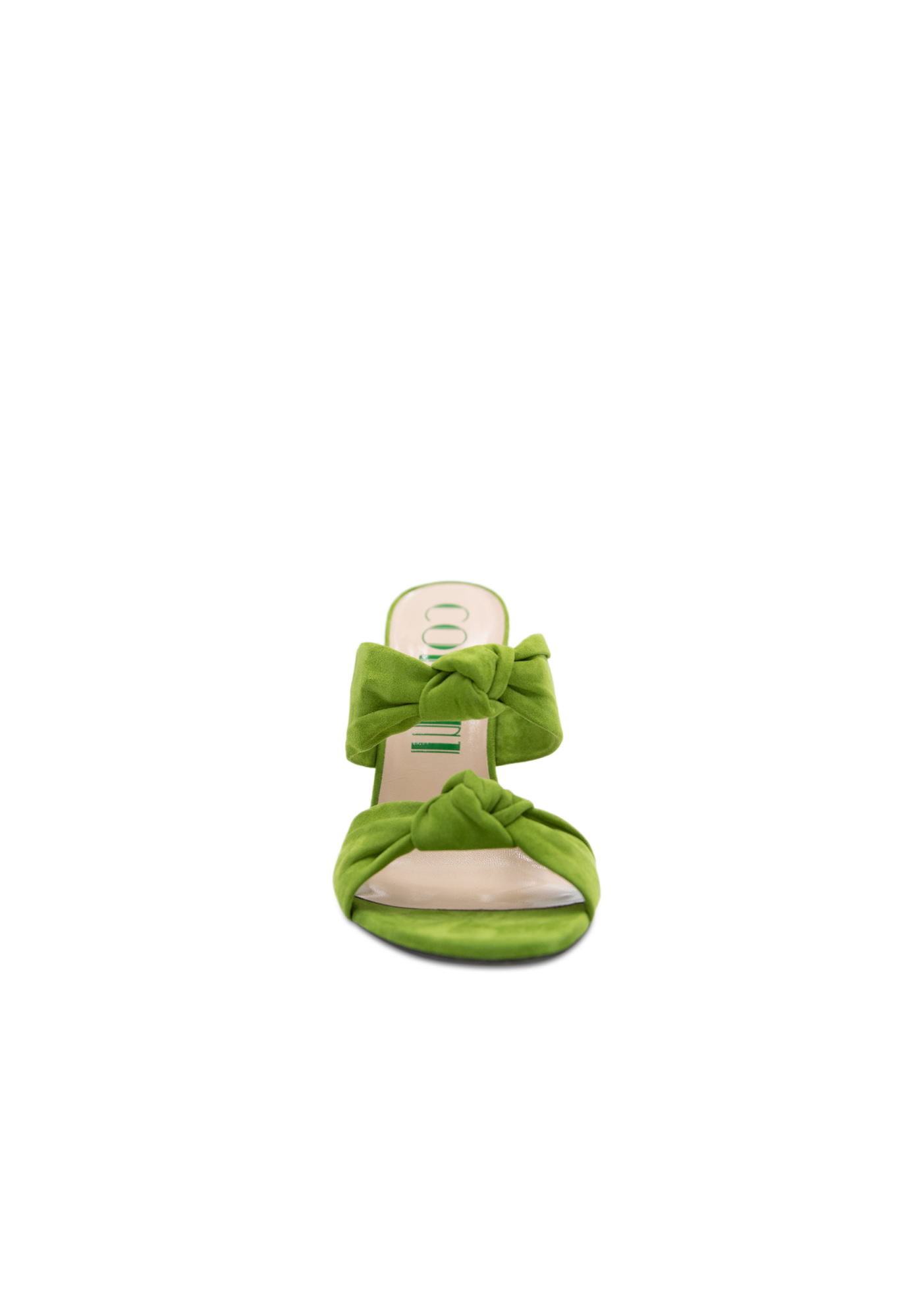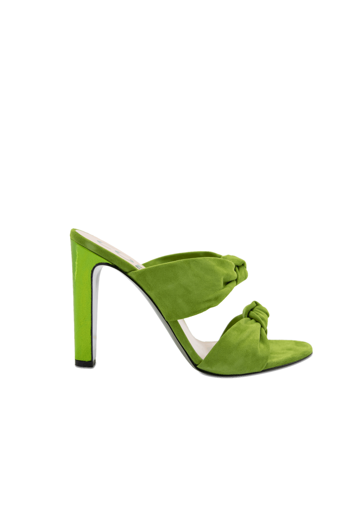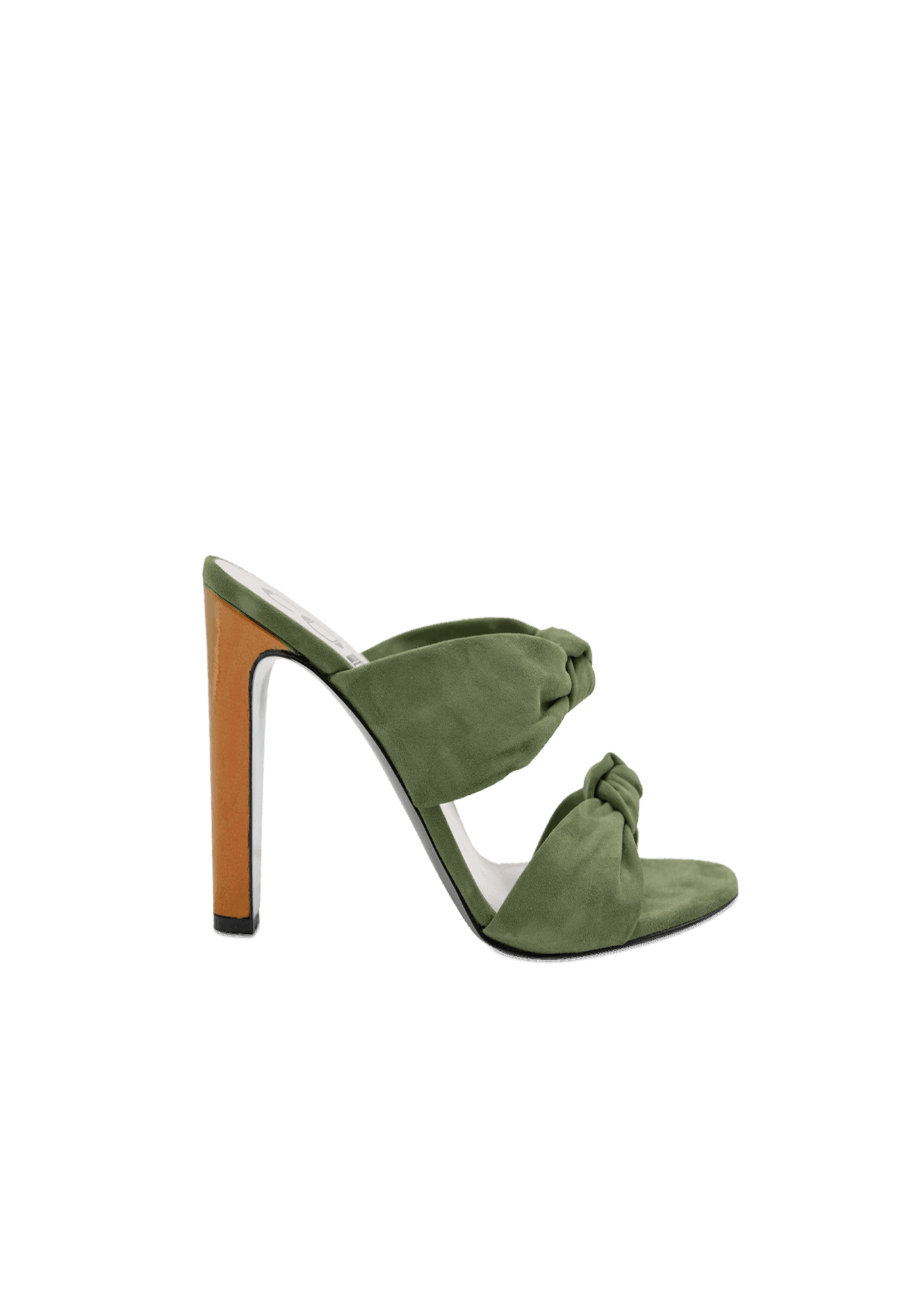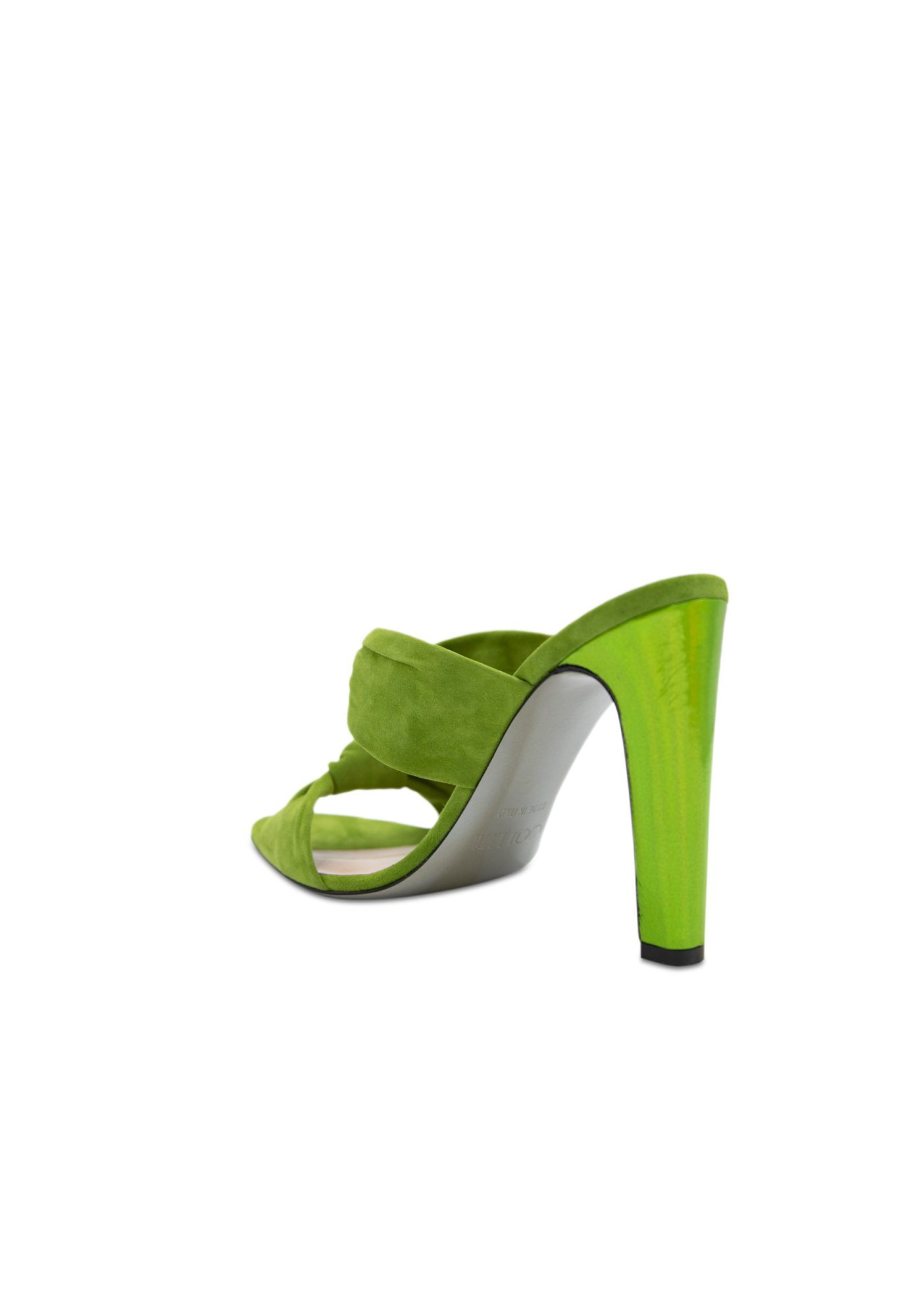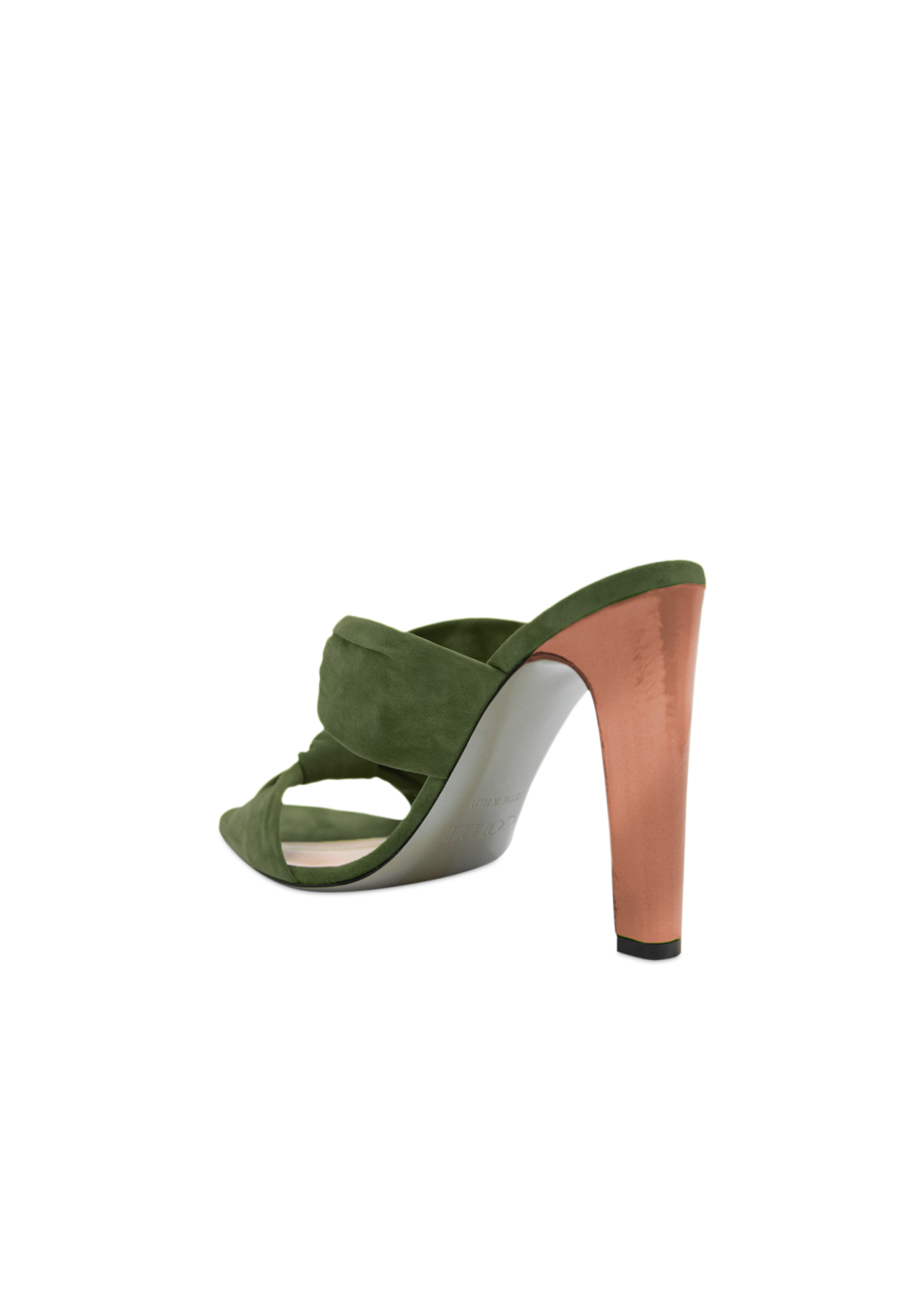 The Carrie mid-heeled sandal brings a feminine touch mixing eccentricity and lightness through a shiny bronze heel and a deep green solid coating.