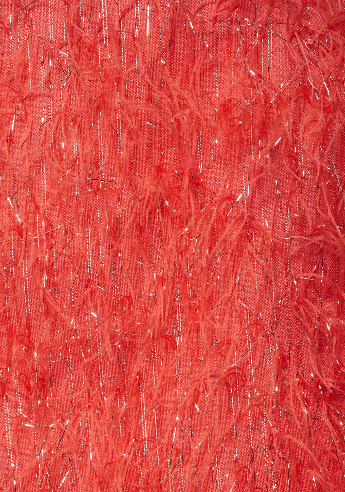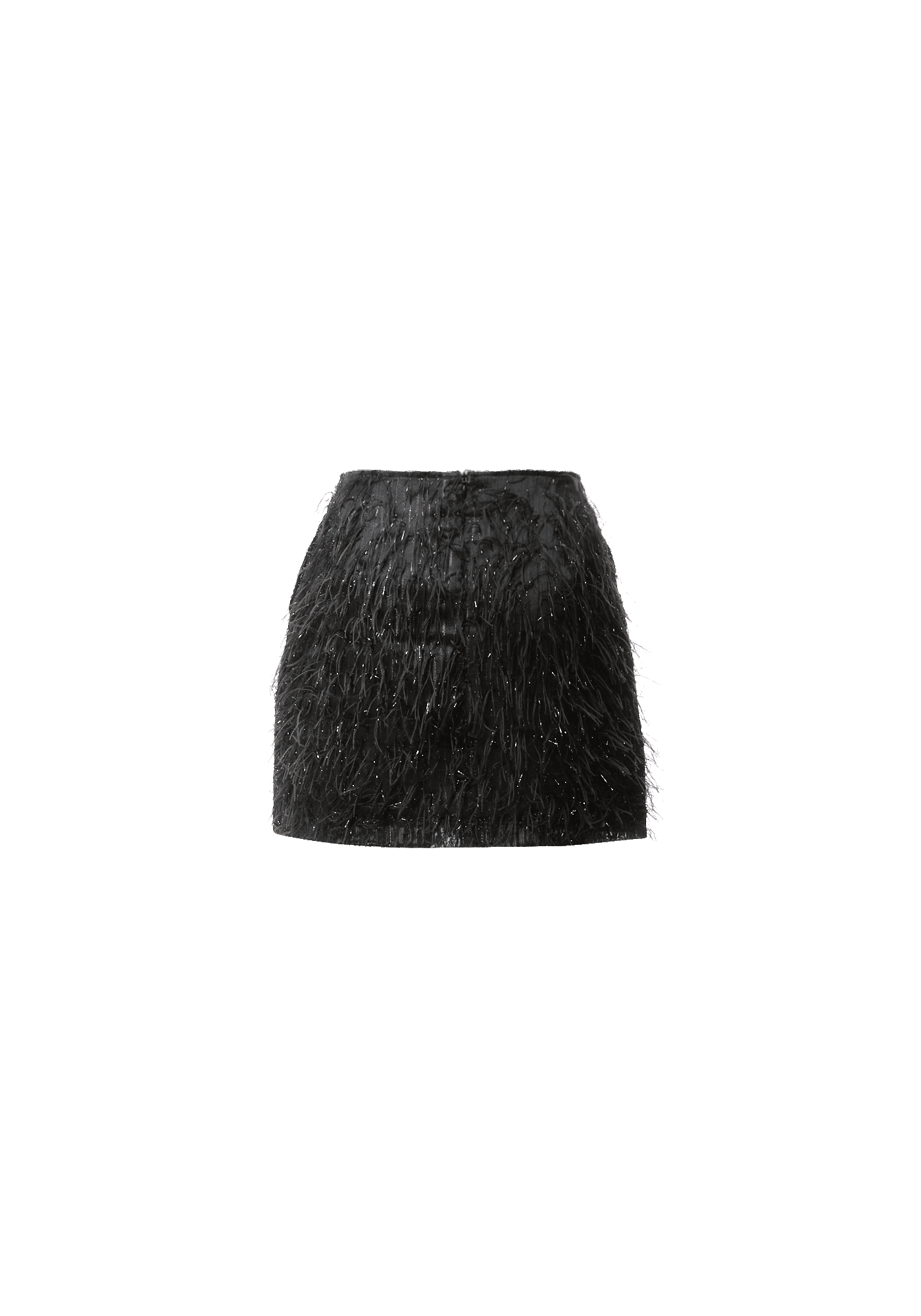 Playful glamorous orange mini skirt adorned with feathers, a sartorial delight. The lively hue radiates energy, while the flirtatious mini length adds a dash of sass to your ensemble.