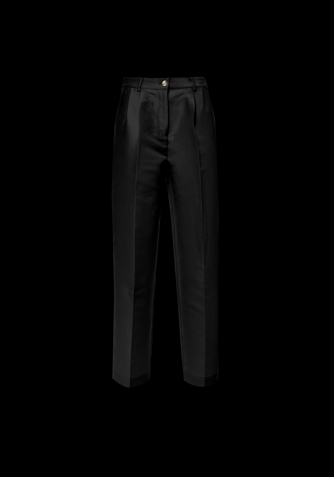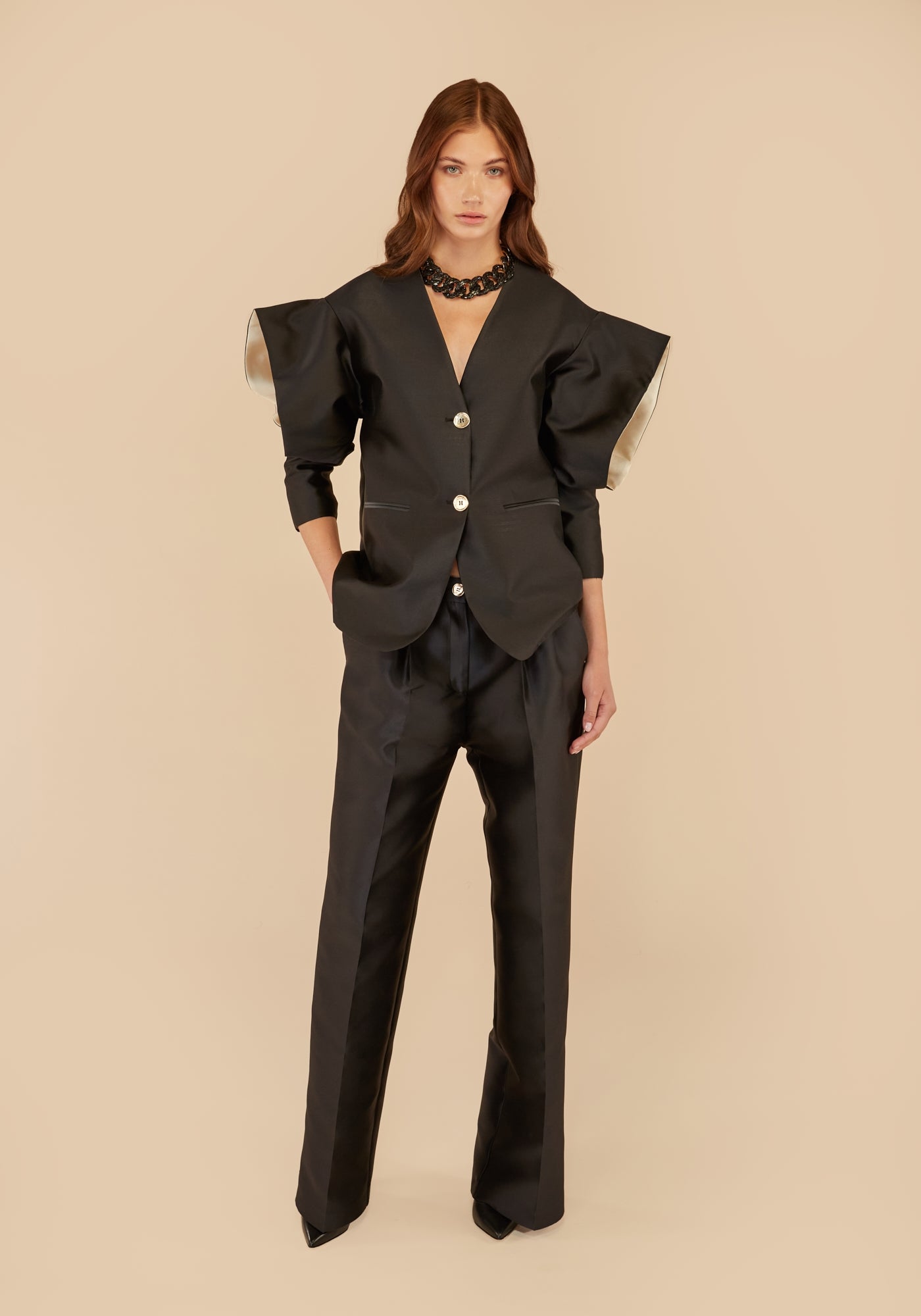 Embrace the epitome of chic sophistication with these black wide-leg pants, crafted in the divine texture of mikado fabric. These pants are a harmonious blend of comfort and couture, embodying the essence of refined style for the discerning fashion enthusiast.