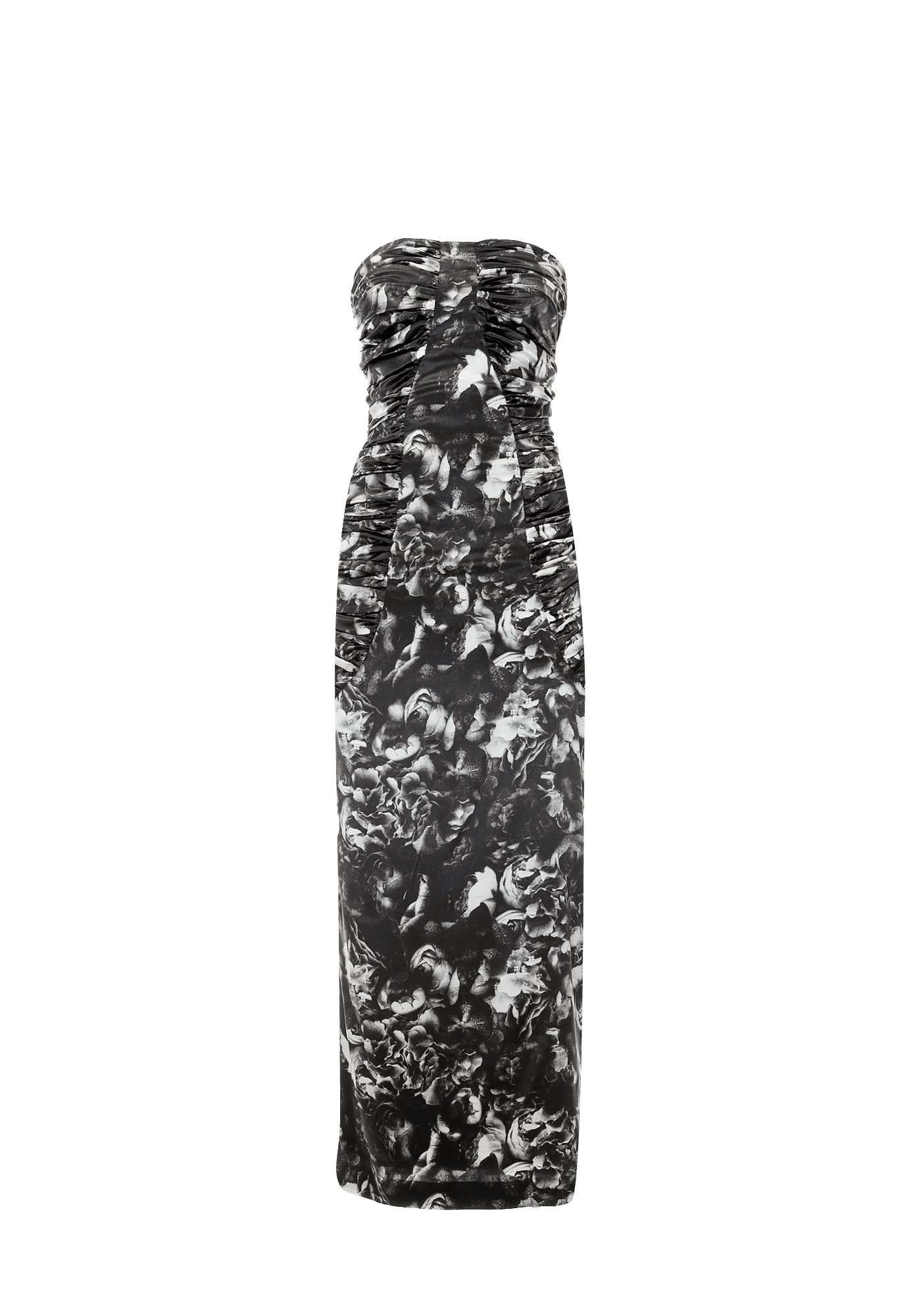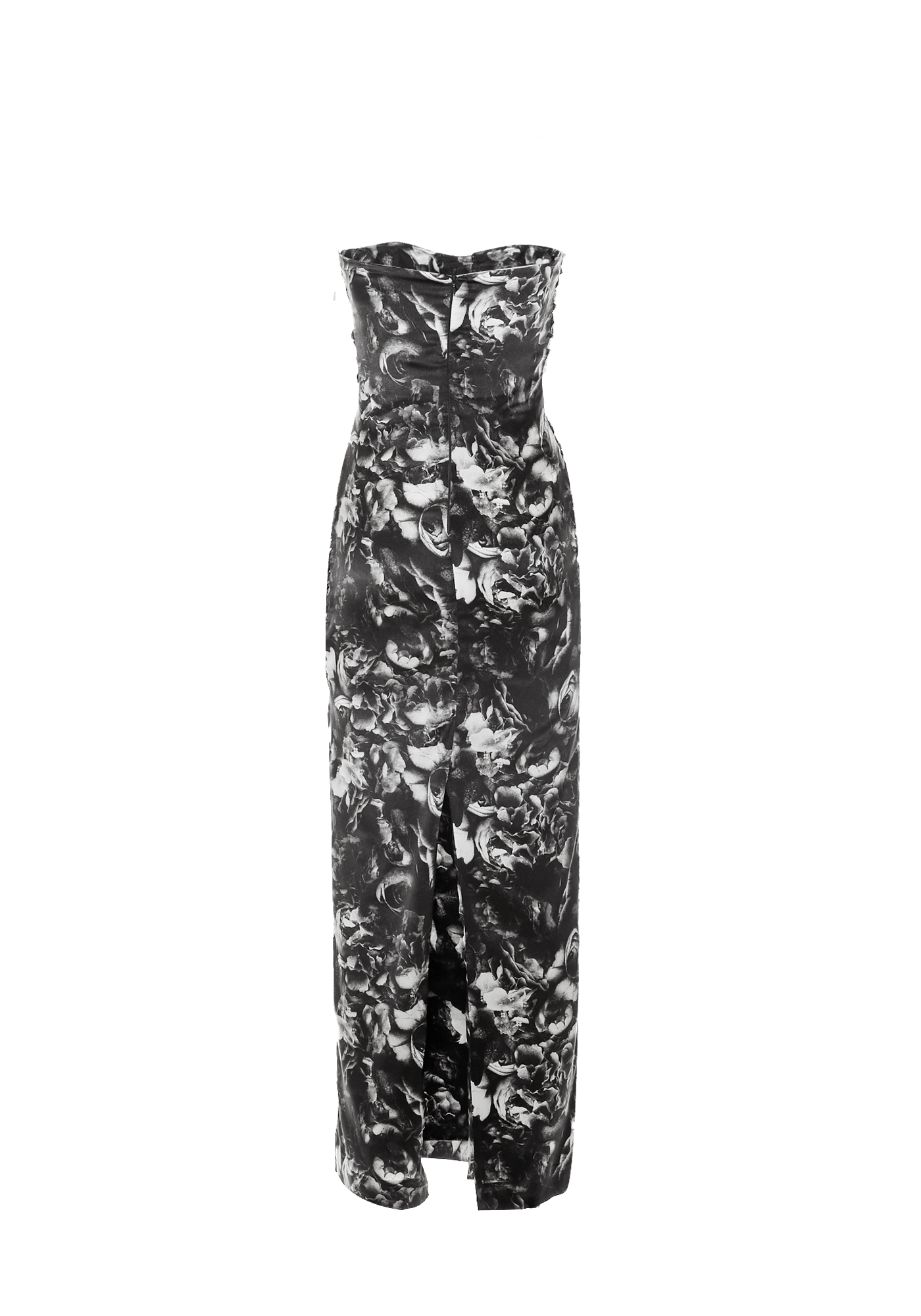 Strapless long dress designed to showcase your figure with its tight-fitting silhouette. Its silky, flowery fabric and delicate side drapes add a touch of elegance and sophistication .