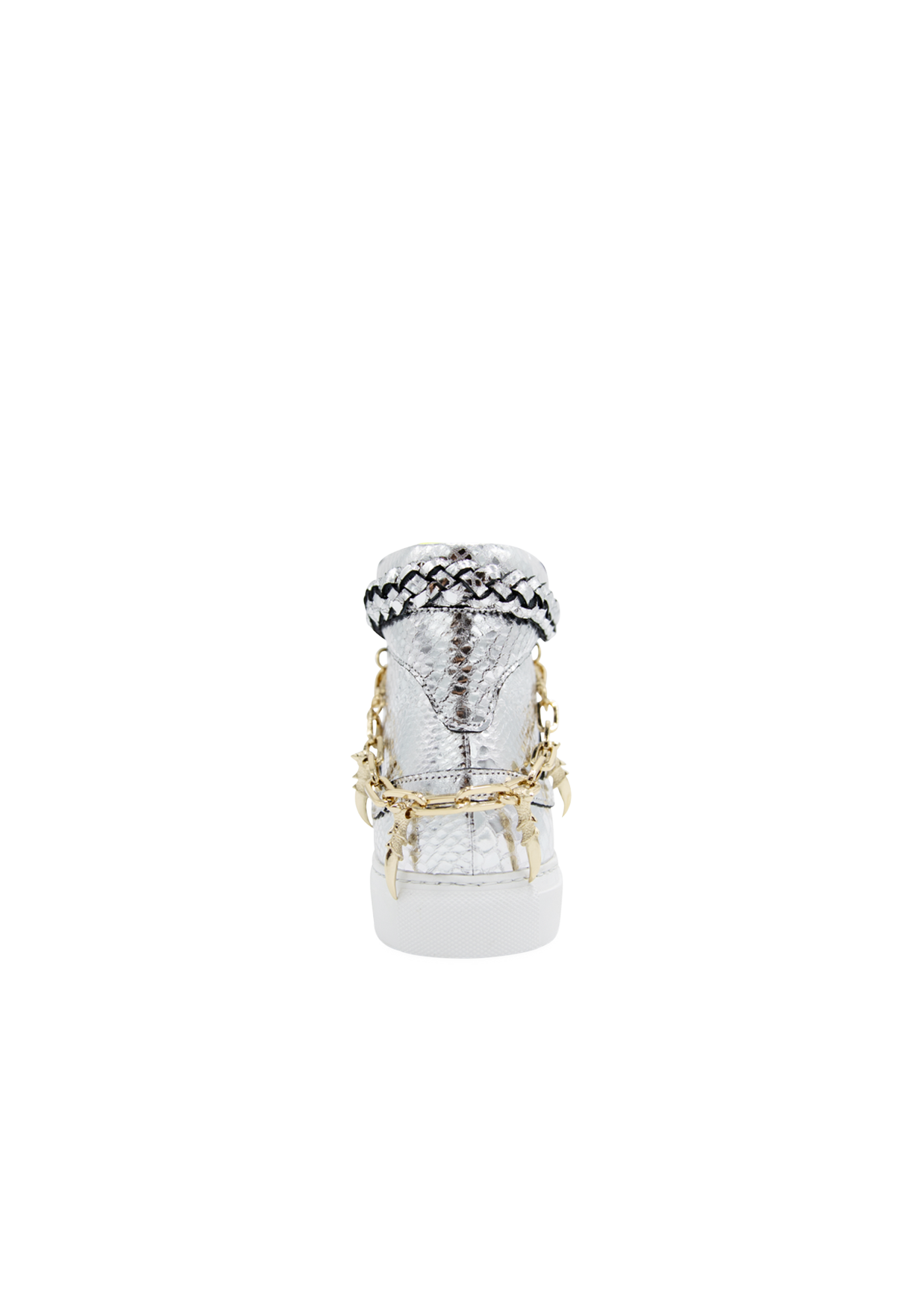 The Gomez sneakers express eccentricity and style through a silver reptile pattern, a roped strap, and a back golden chain. The high white platform elevated the garment contrasting with its daring aggressive look.
