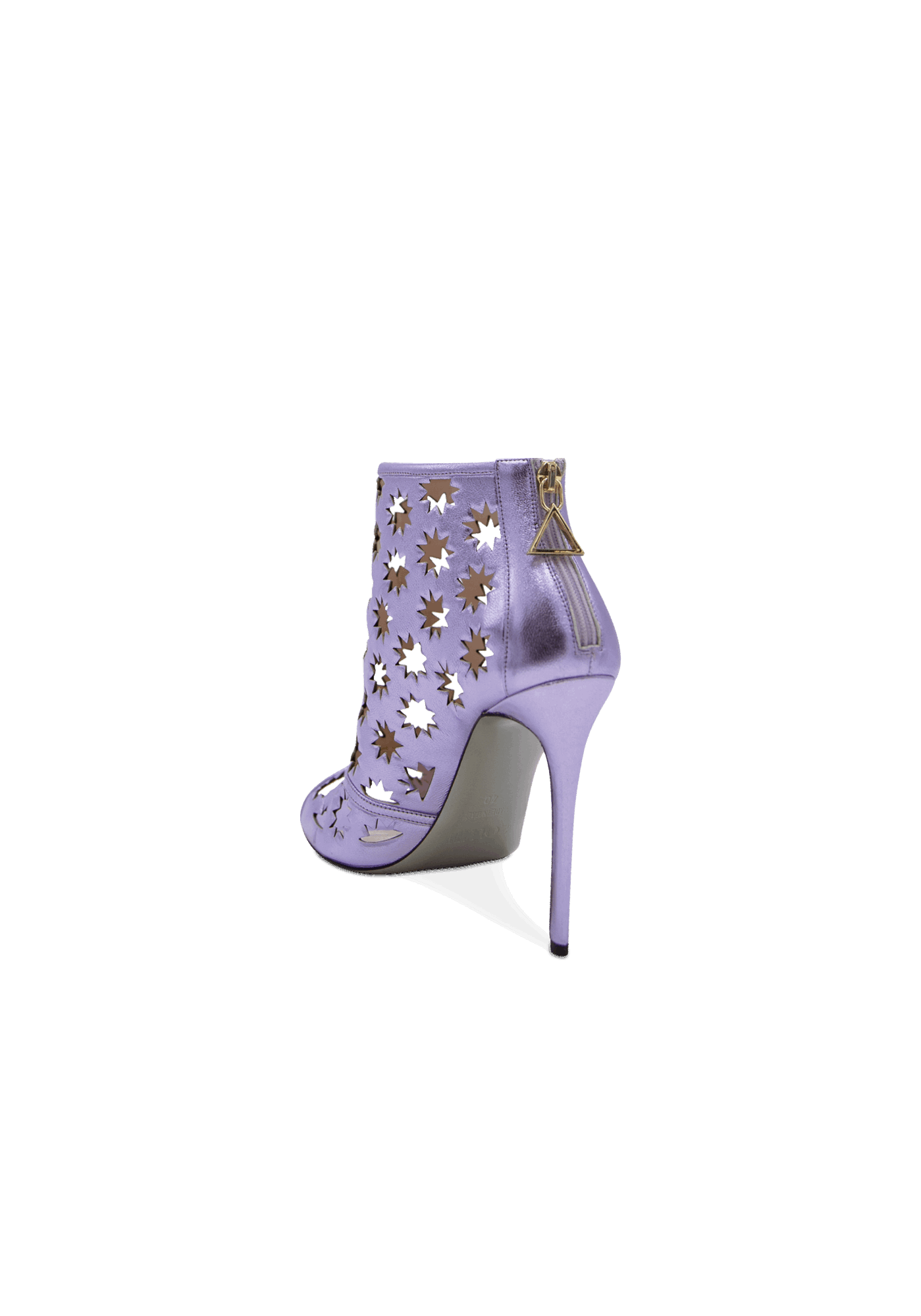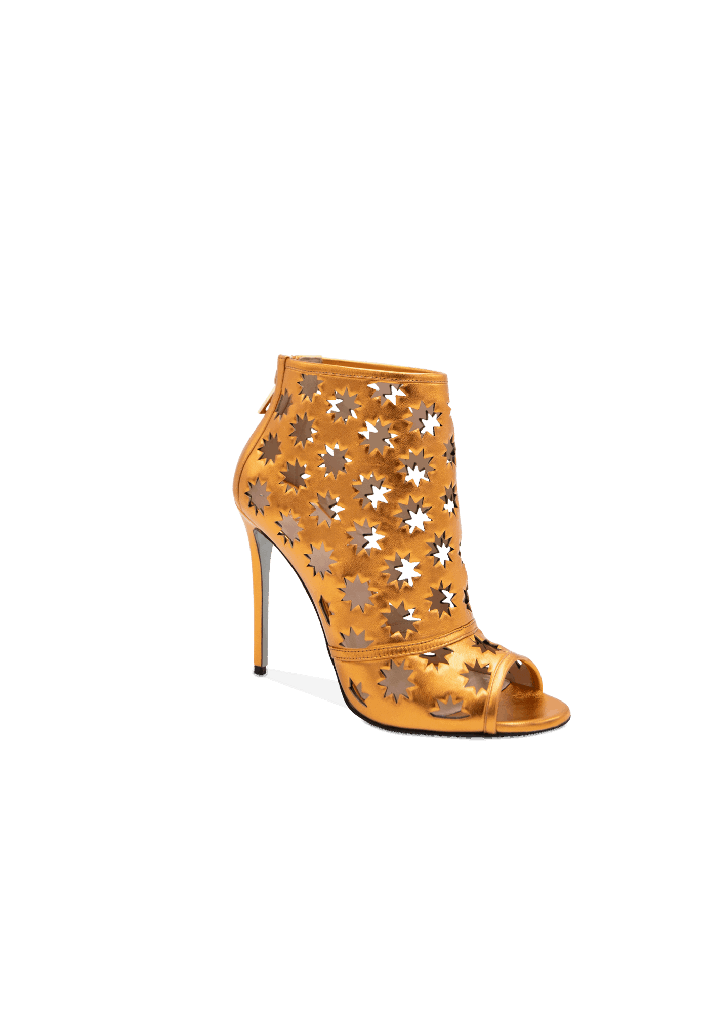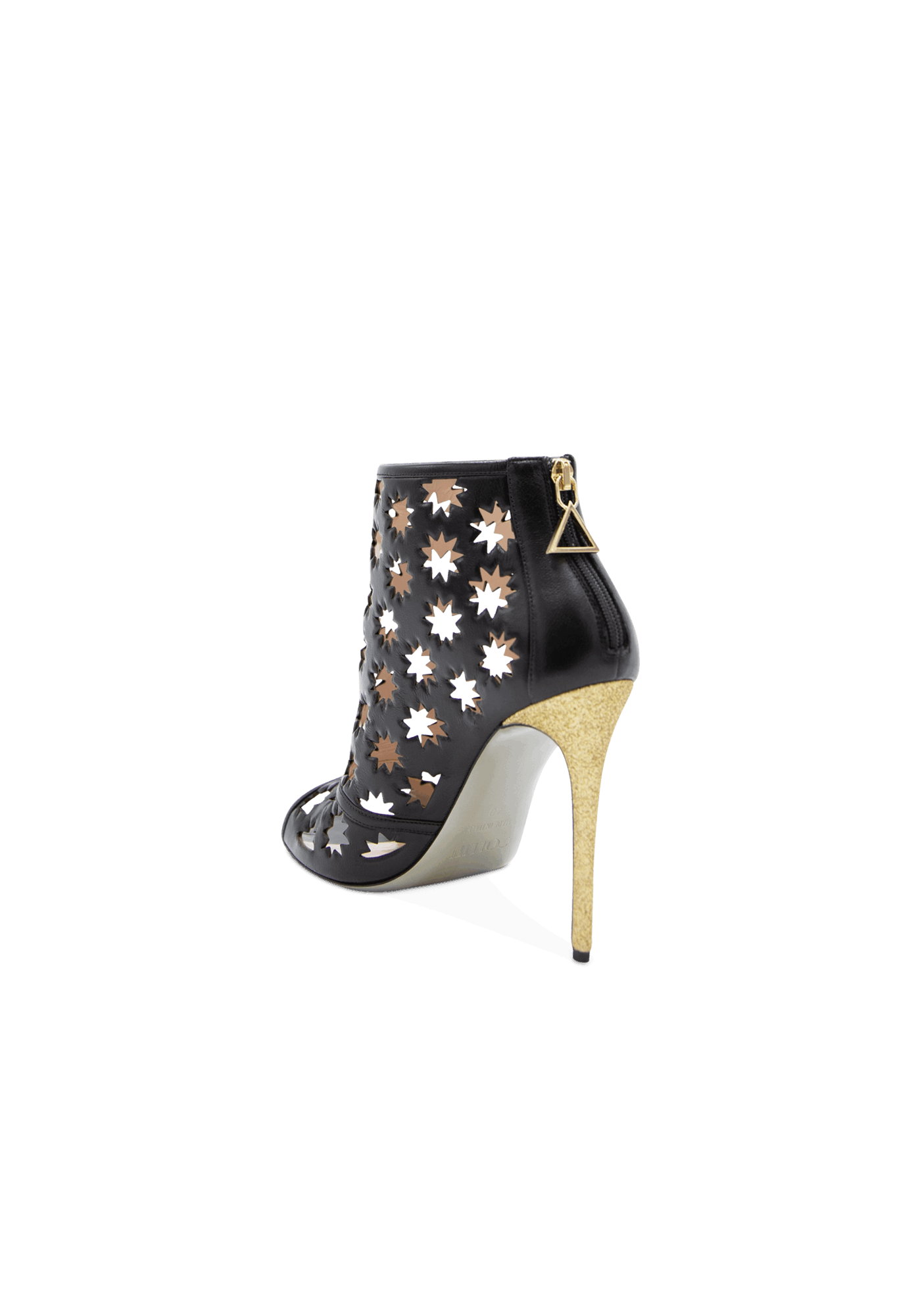 The daring Hollywood high-heeled ankle leather boots shout extravagance and uniqueness. The creative design featuring cut-out iconic Collini stars offers a delicate open shoe with an open toe and a golden back zipper for a sophisticated look.