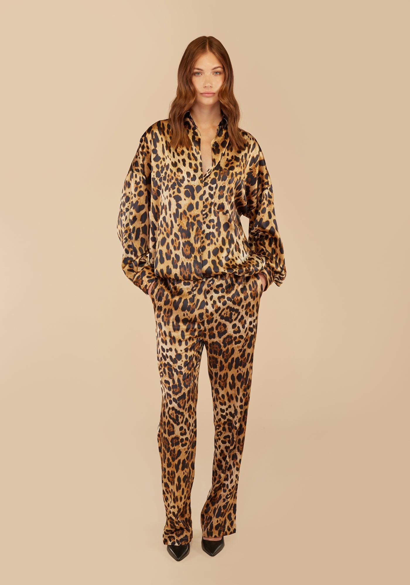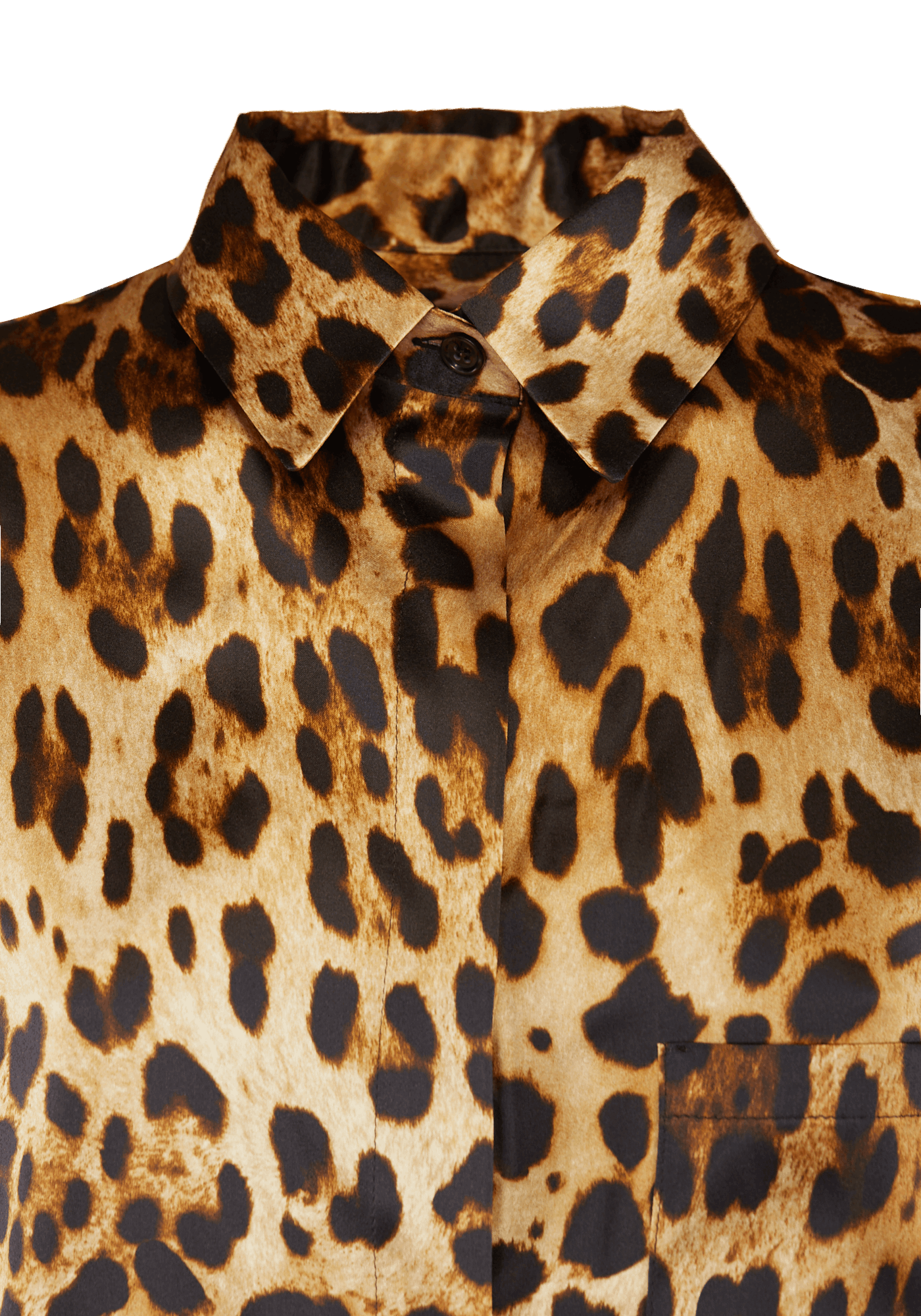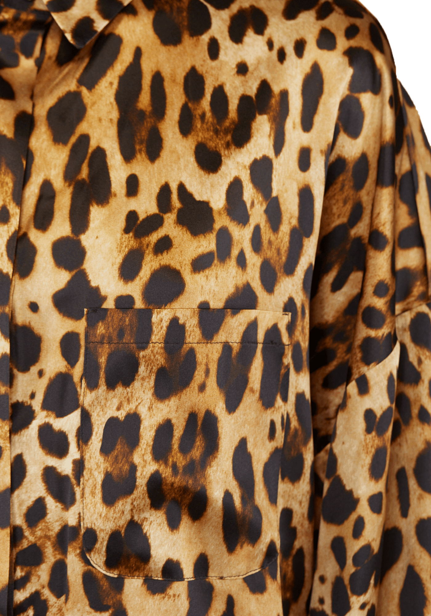 ​This oversized silk shirt adorned in fierce leopard prints. A statement of bold elegance. The oversized silhouette brings an effortless cool, creating a chic and relaxed vibe. The silk fabric adds a touch of luxury, making it the ideal companion for a day-to-night transition.