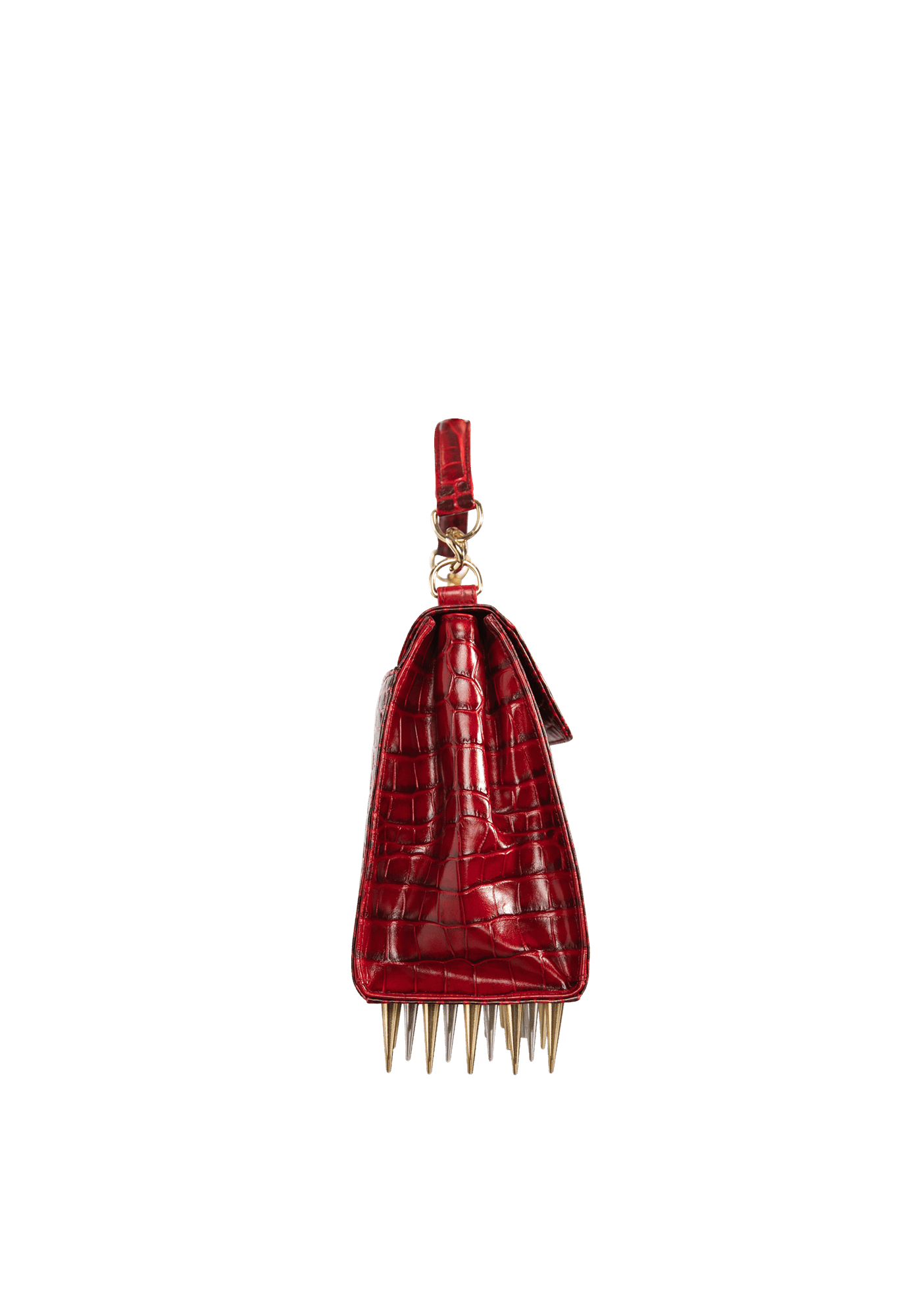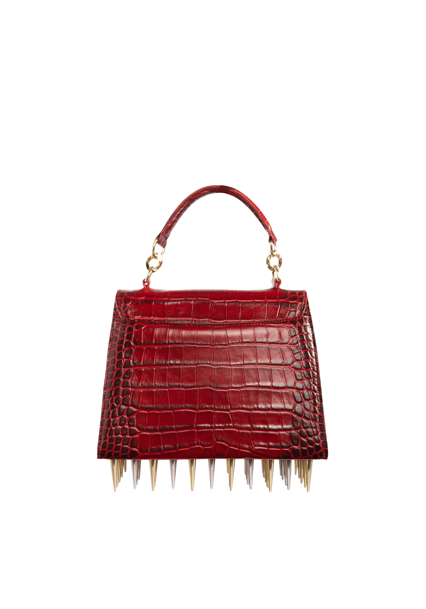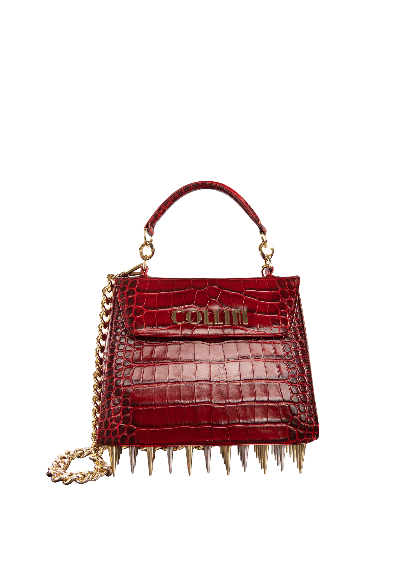 The outstanding façon ‘Croco’ Killer shoulder bag reunites all key elements to a perfect Collini look through daring shapes and details. The deep black design and pattern highlight the golden and sliver spikes in an extraordinary combination of sensuality, sexiness, and power.