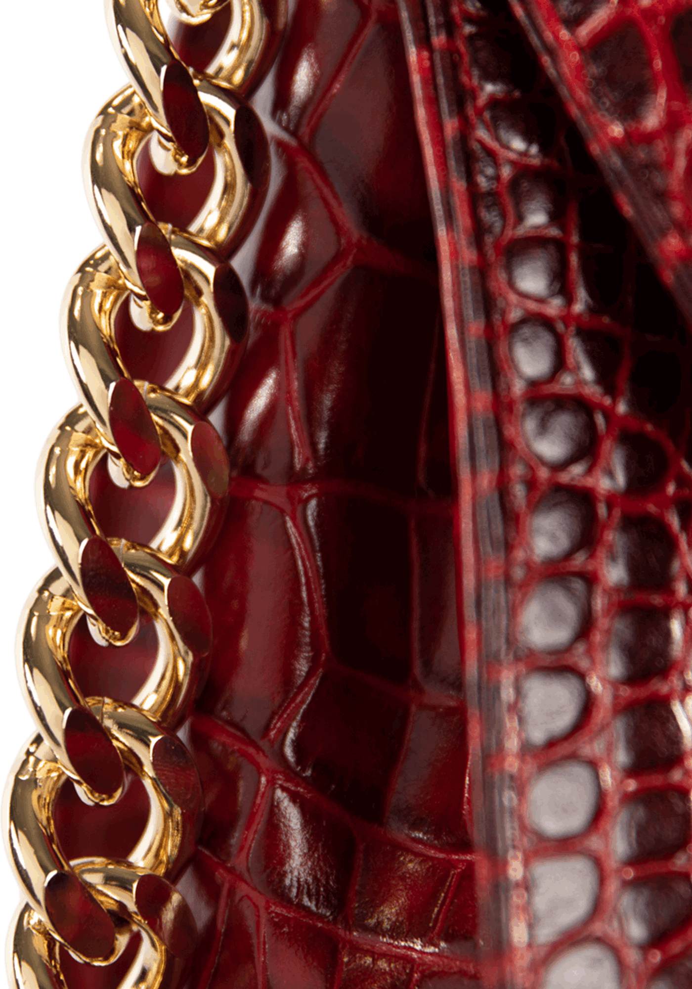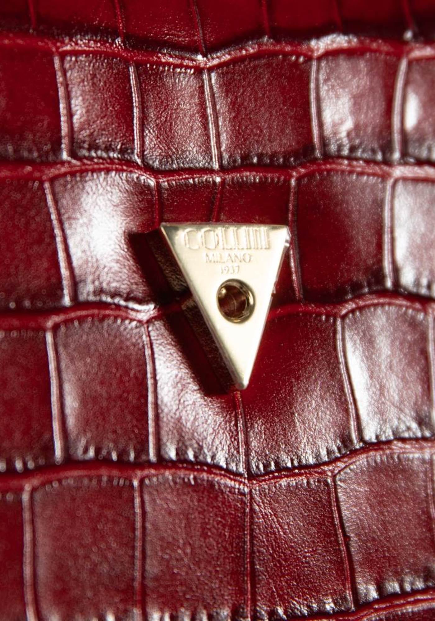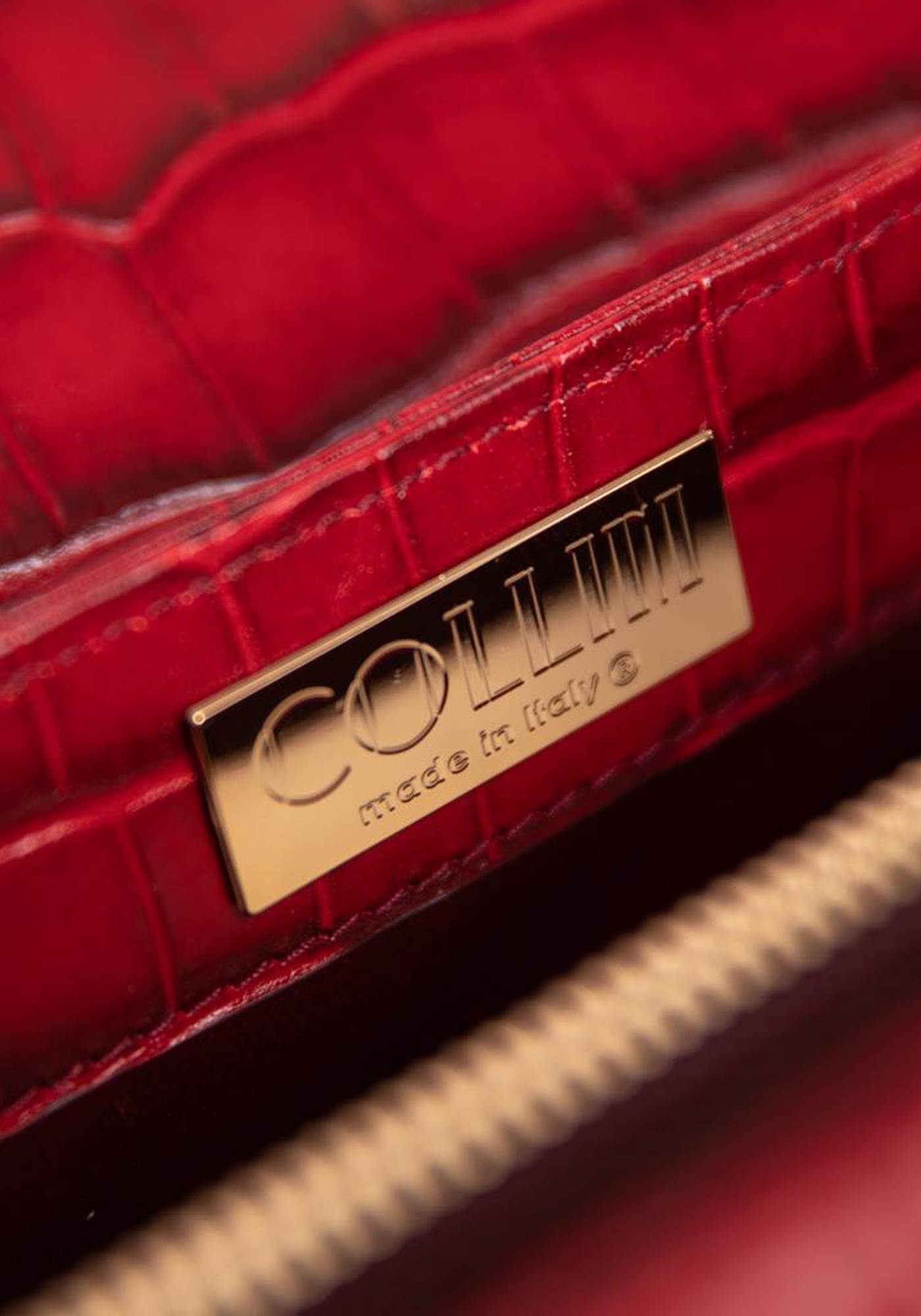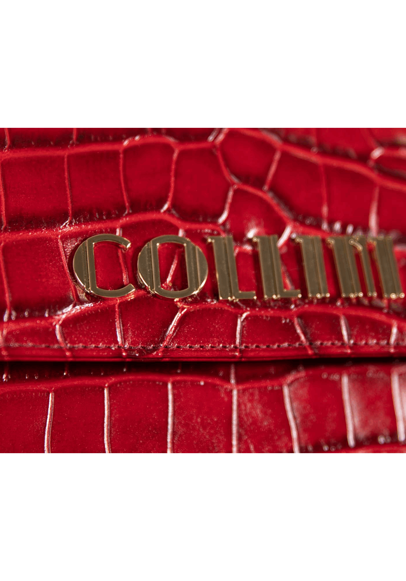 The outstanding façon ‘Croco’ Killer shoulder bag reunites all key elements to a perfect Collini look through daring shapes and details. The deep black design and pattern highlight the golden and sliver spikes in an extraordinary combination of sensuality, sexiness, and power.