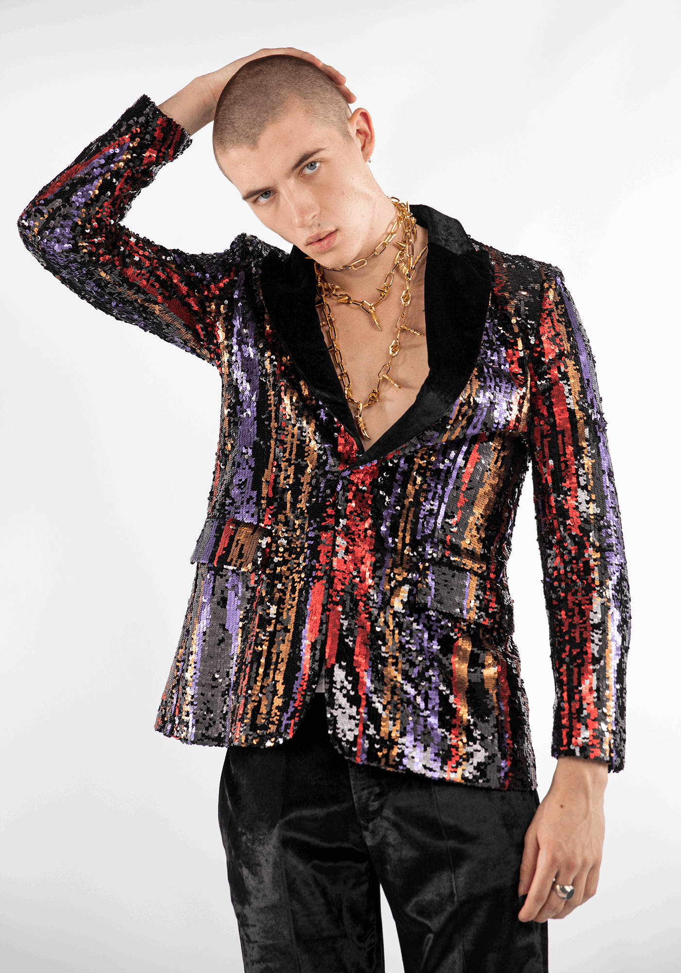 The Kostas blazer becomes the centerpiece, as its uncanny design and texture bring a sense of elegant eccentricity for an exclusive feeling. Its shape and fit hint towards evening wear, with a twist of Collini’s avant-gardism.