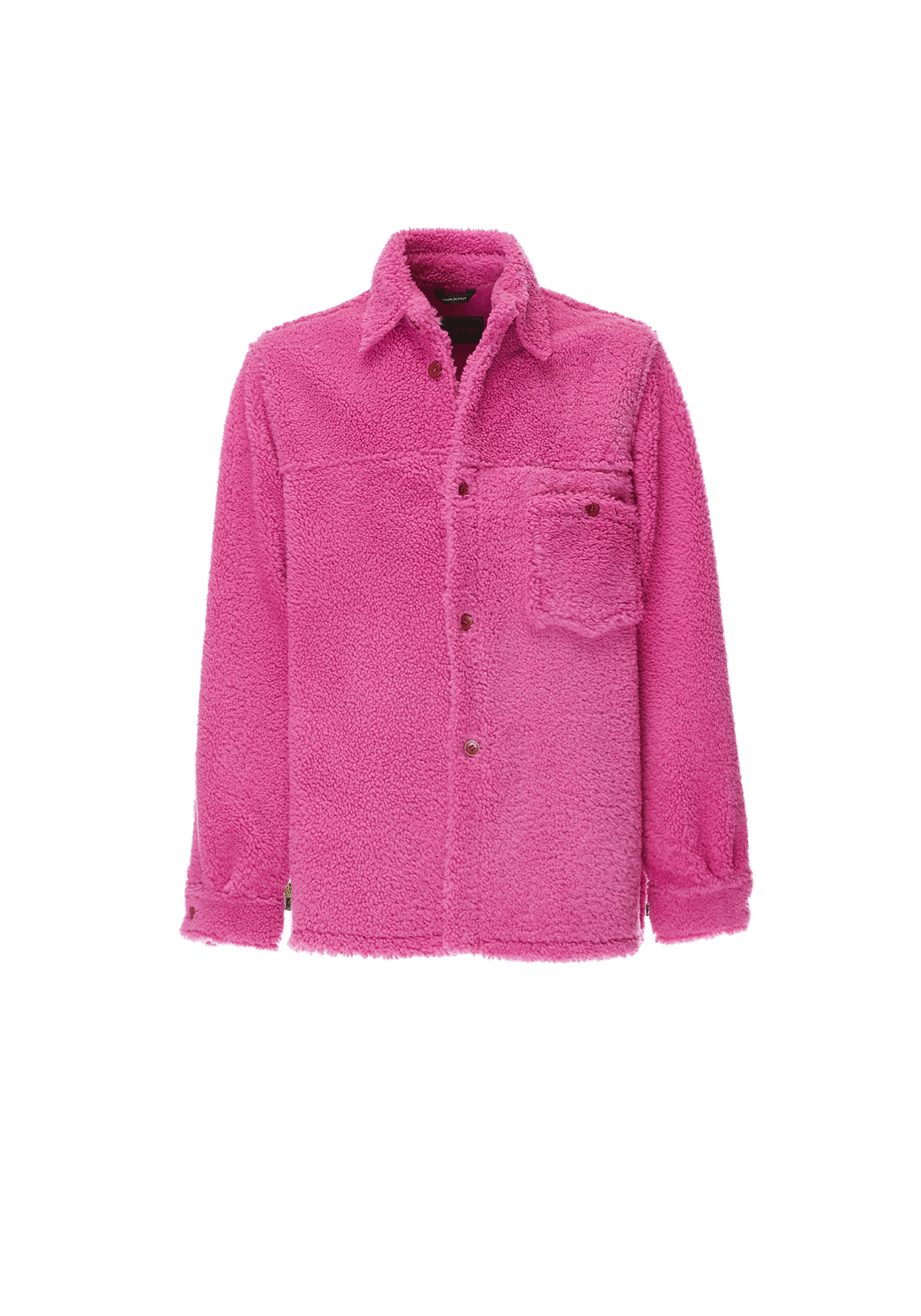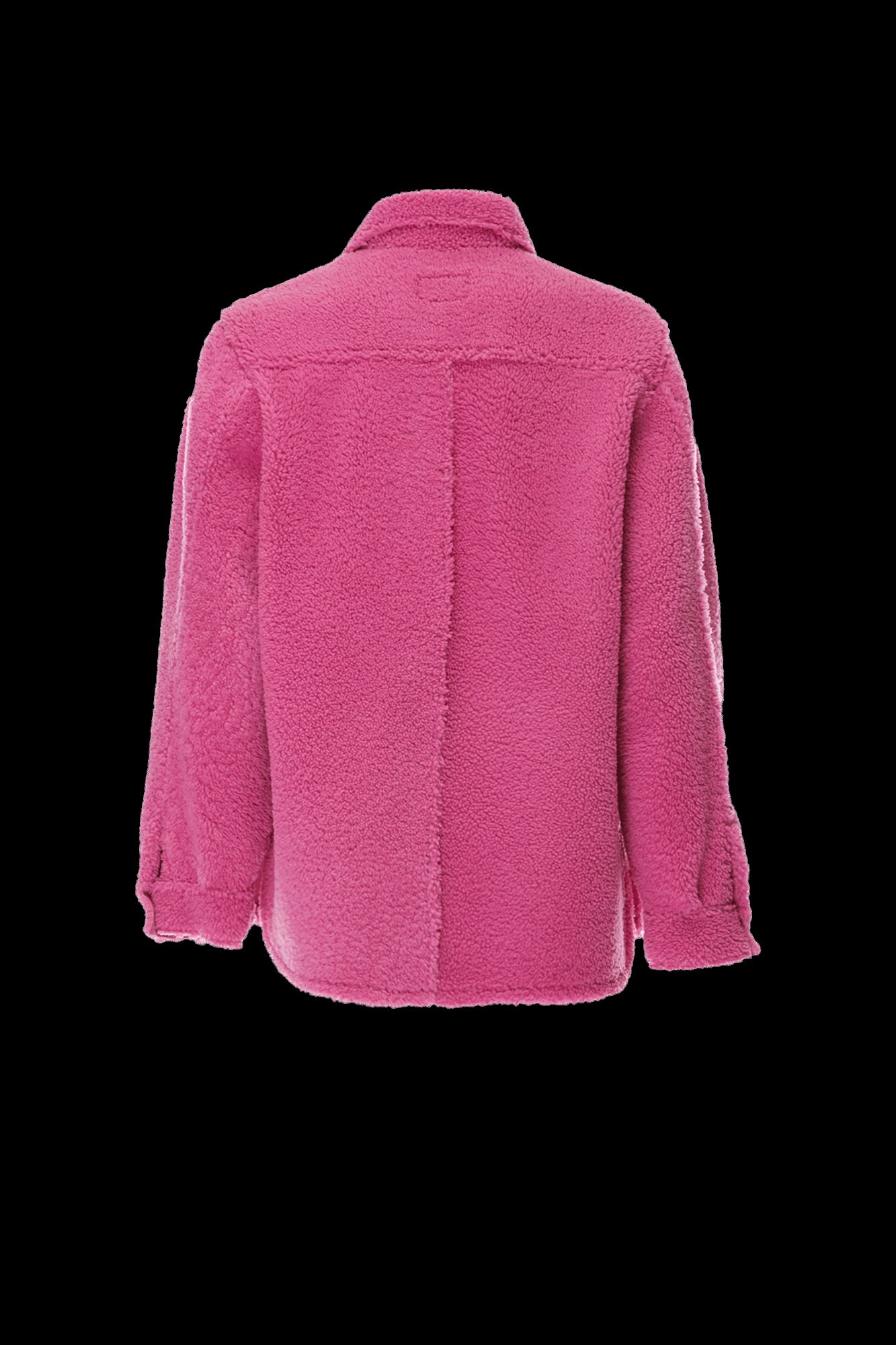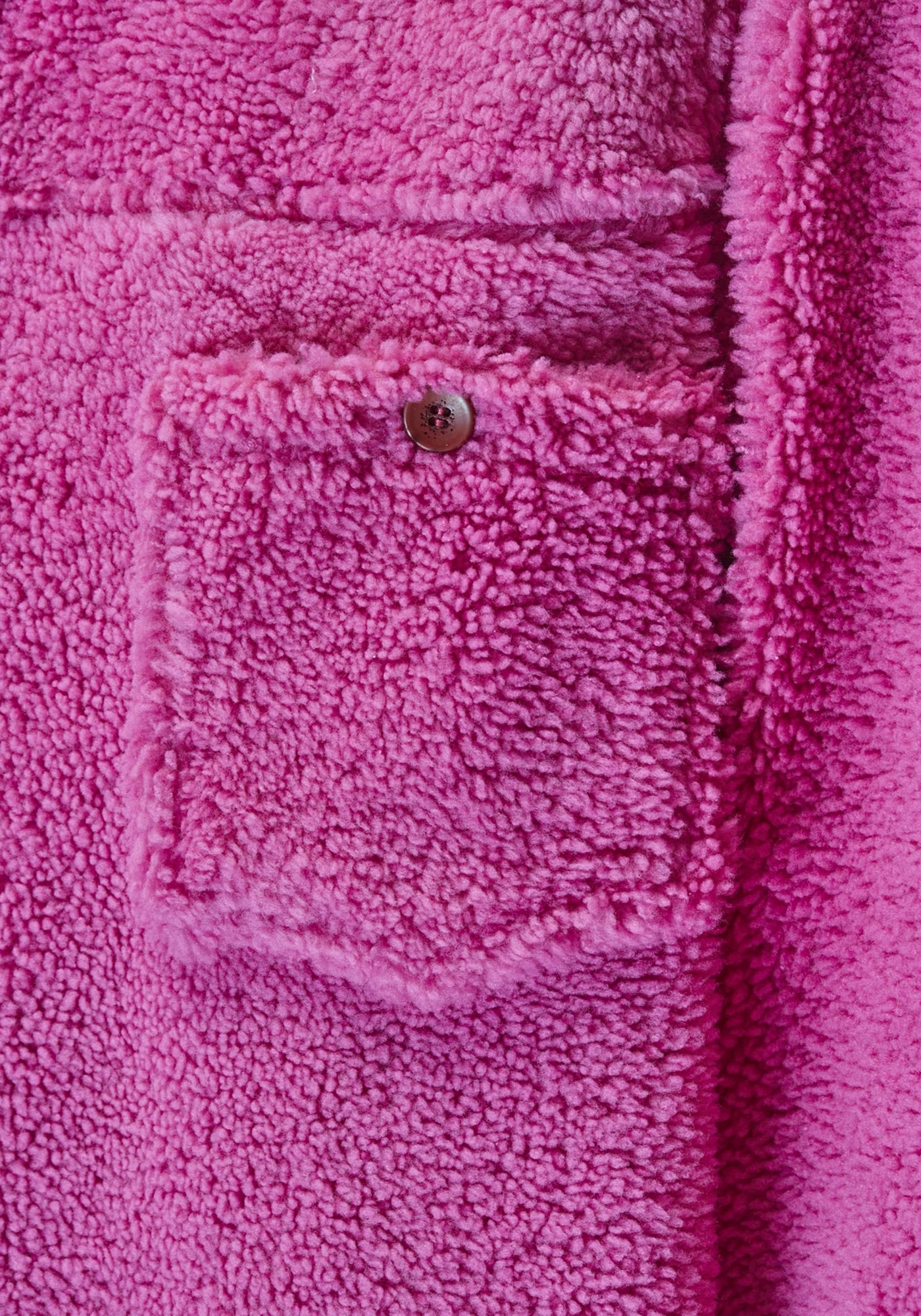 Traditional buttoned jacket with the shearling fur giving it a fresh approach, featuring long sleeves and a functional pocket. The bright pink hue commands attention.