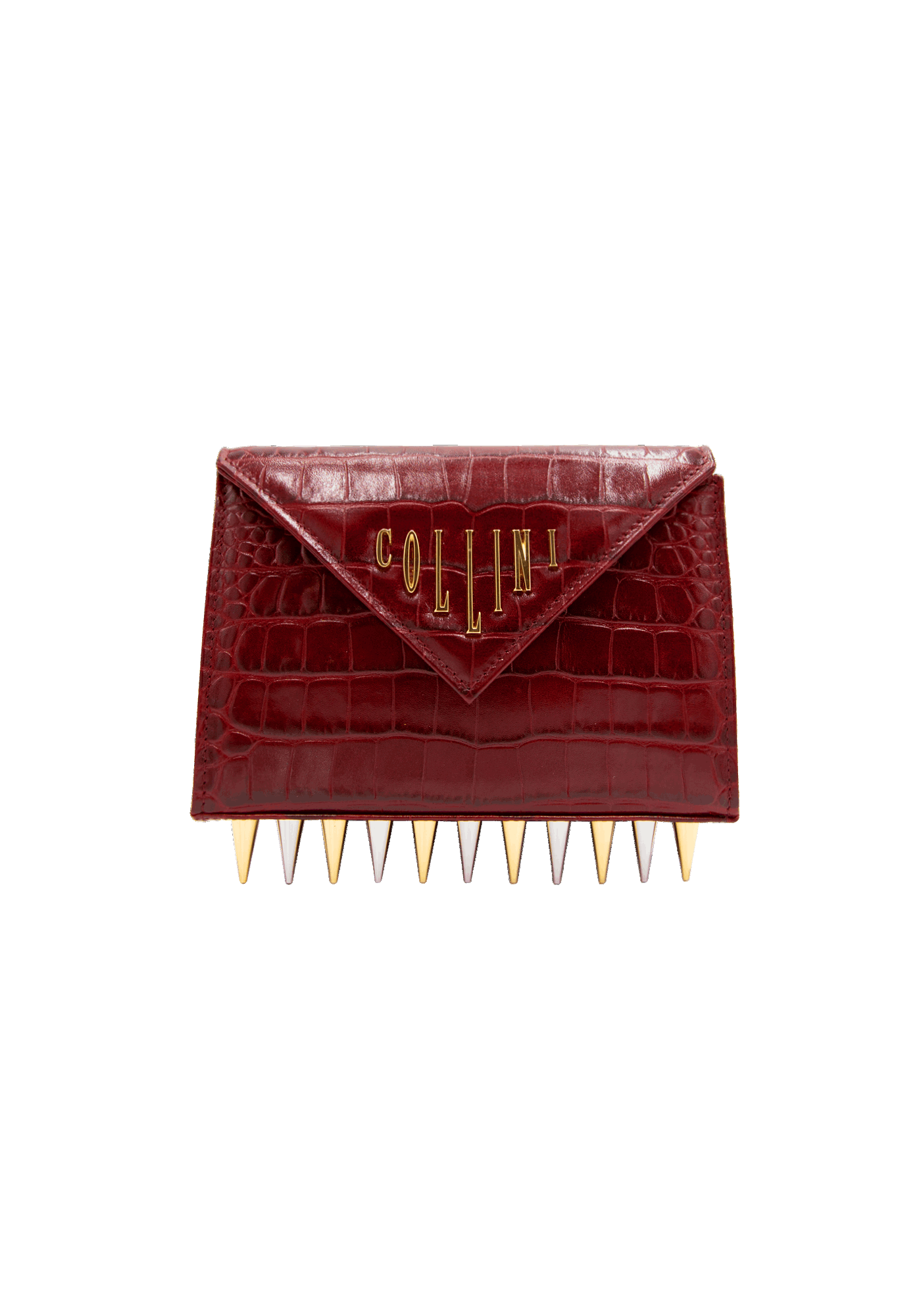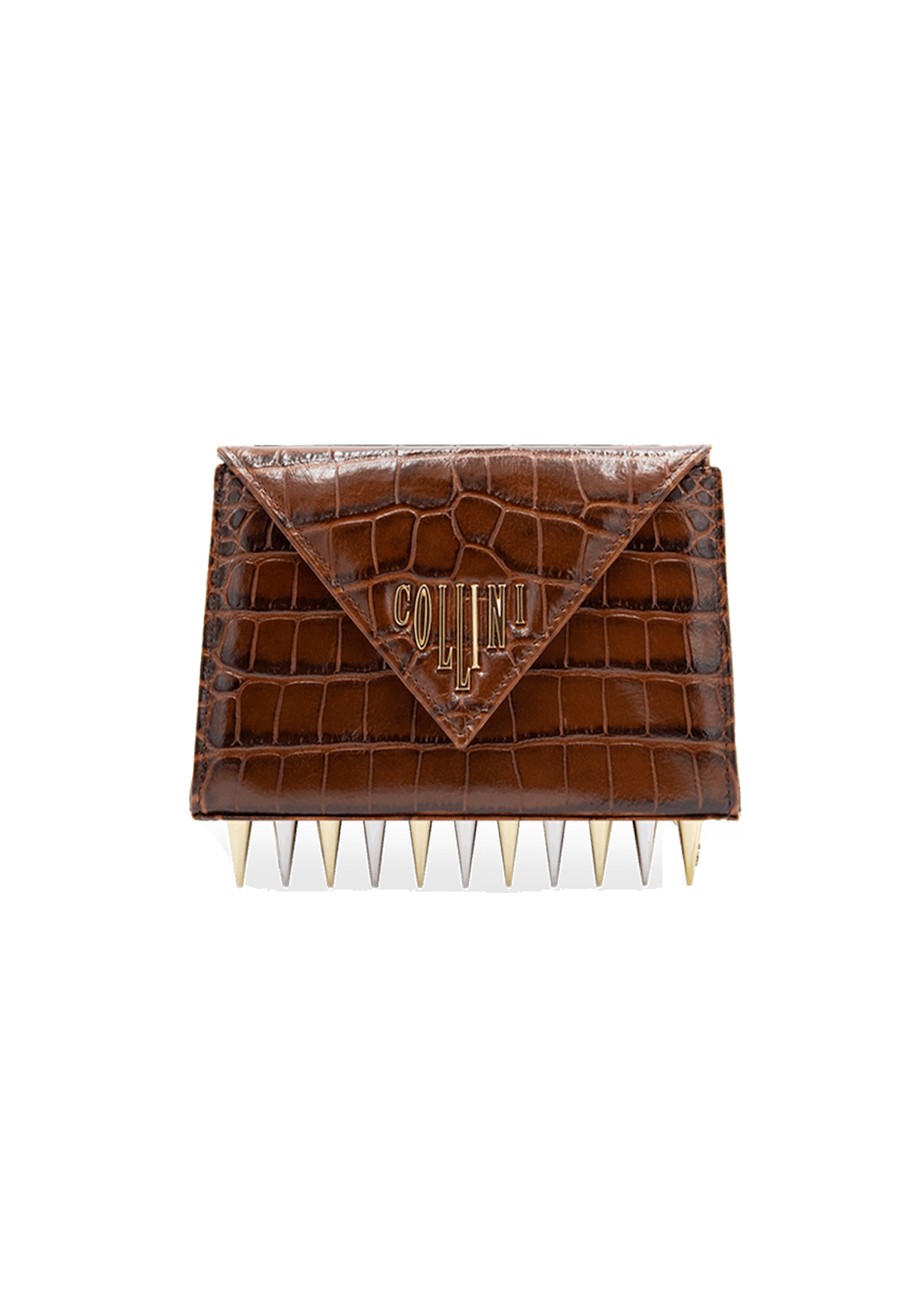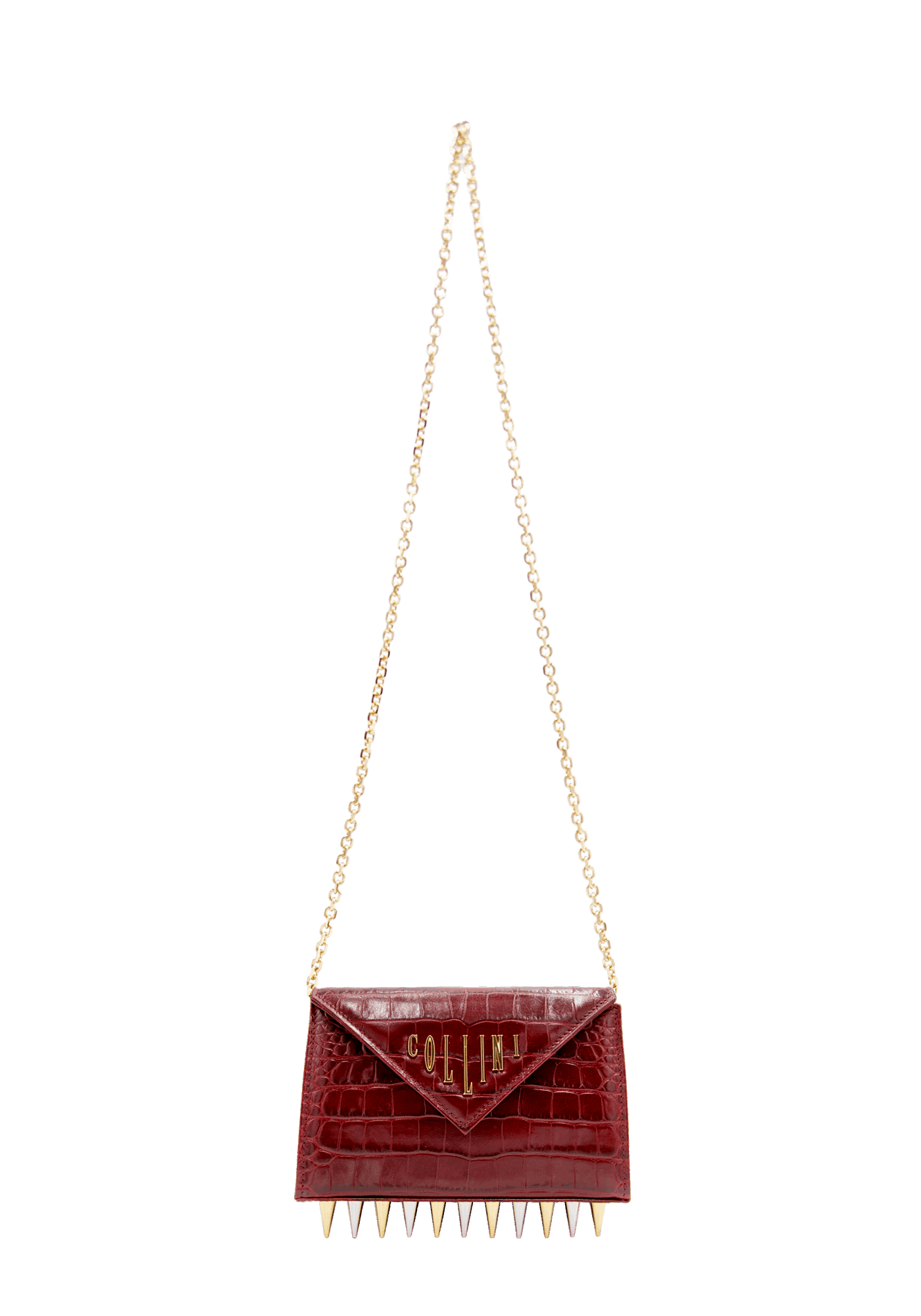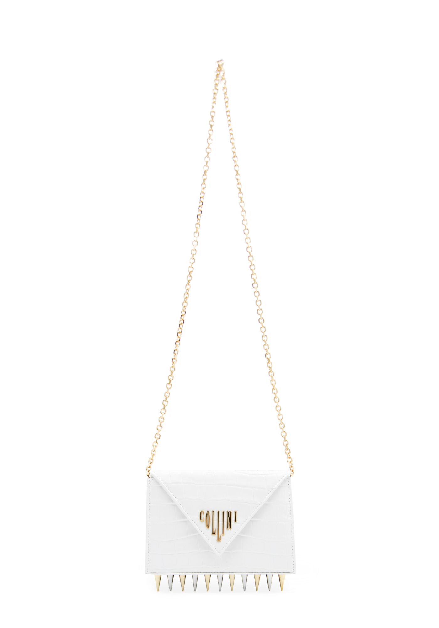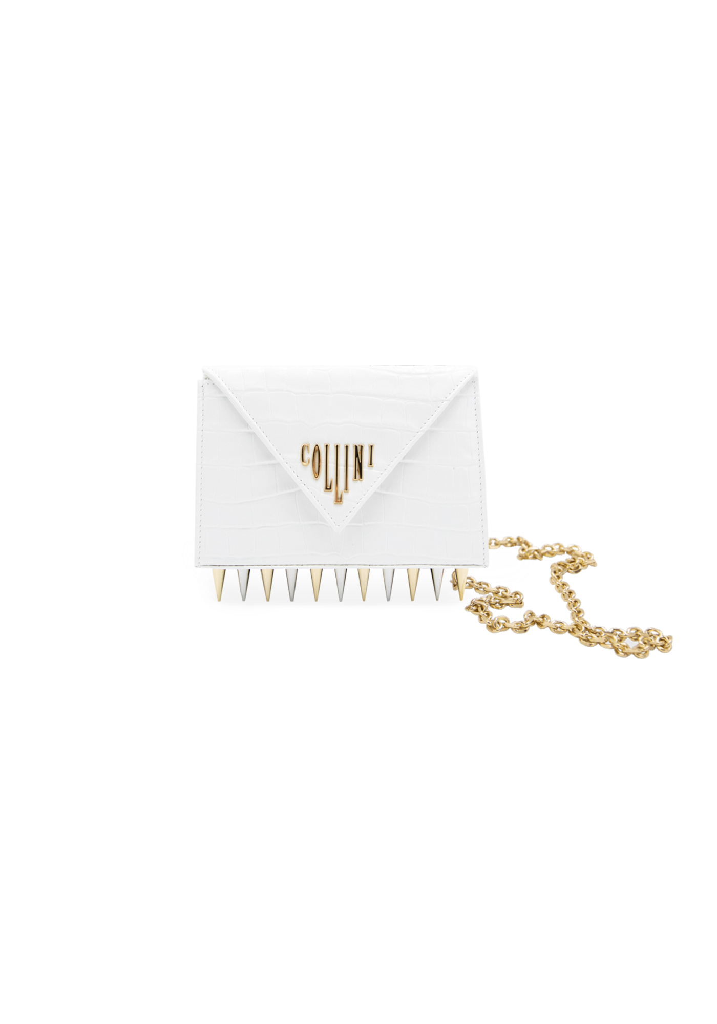 The Mini Killer black shoulder bag features a façon ‘Croco’ leather coating with a centered Collini golden logo. The delicate golden chain reminds the bi-colored spikes adorning the unique envelope shape of the item.