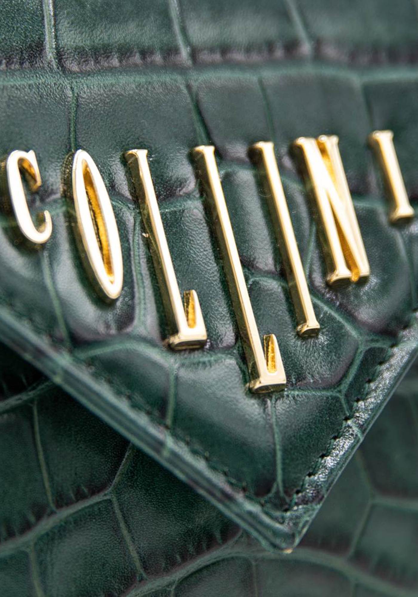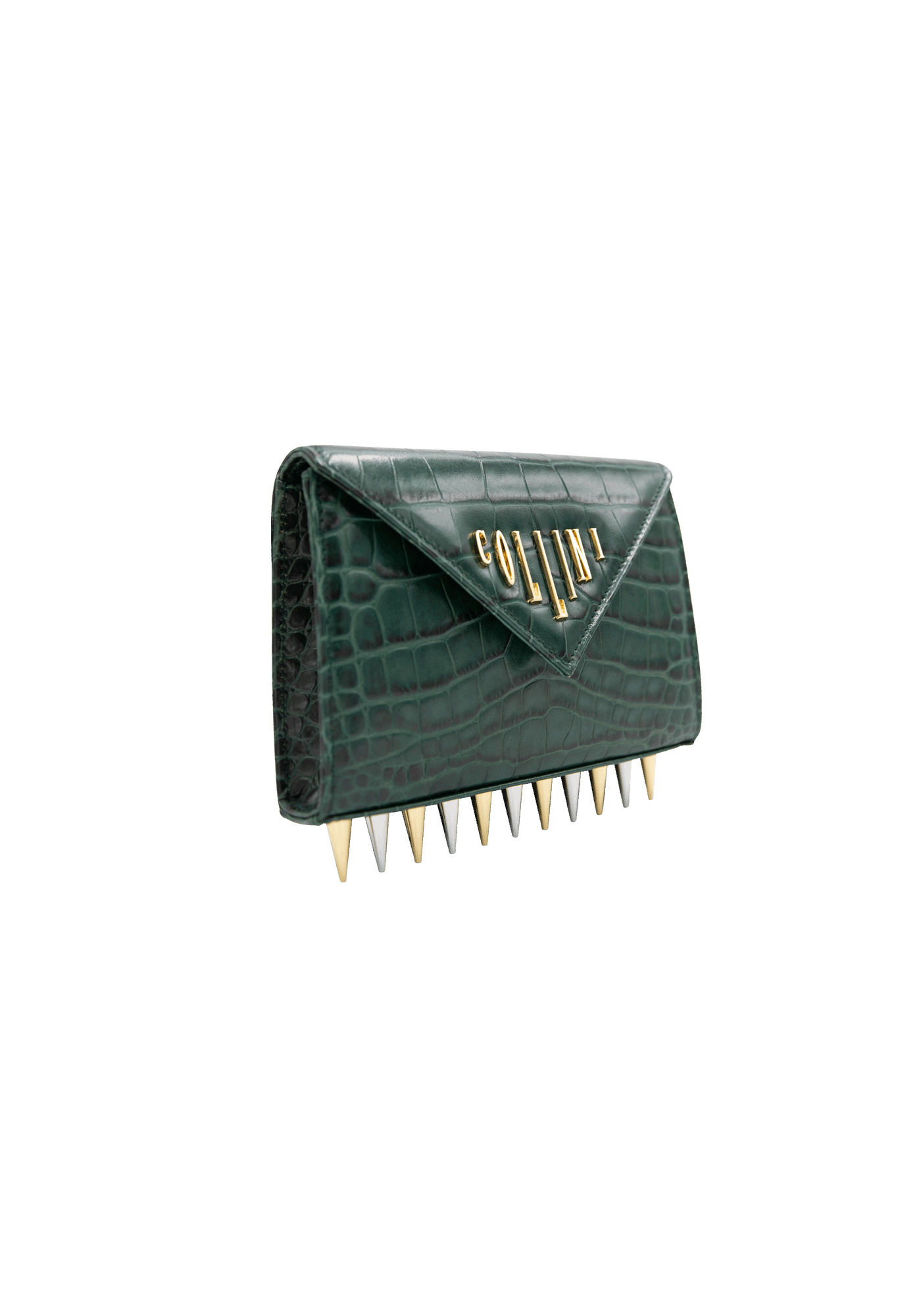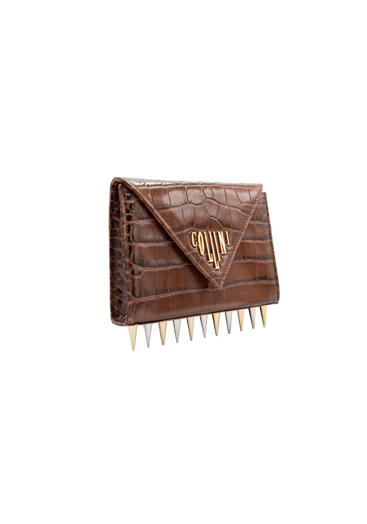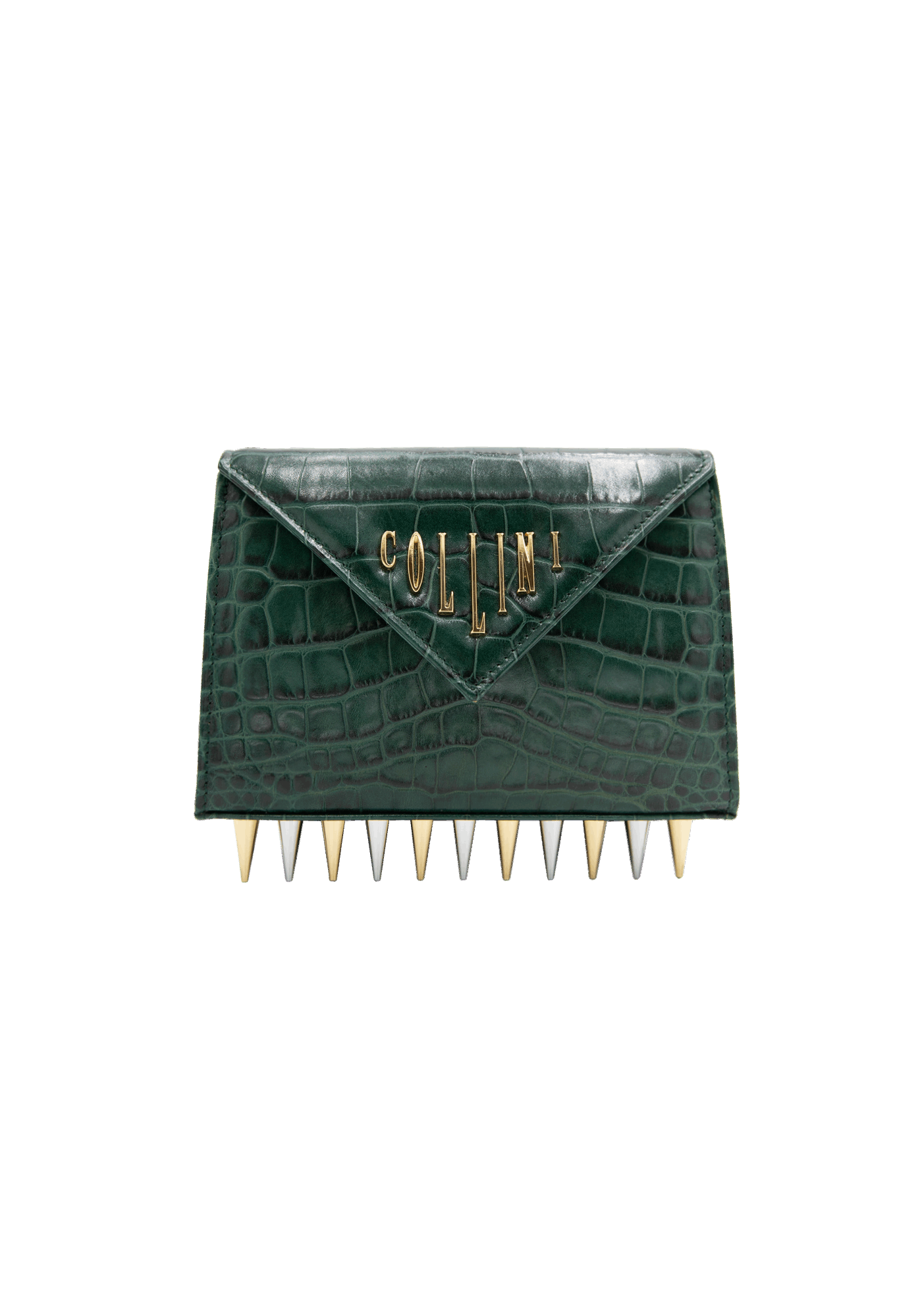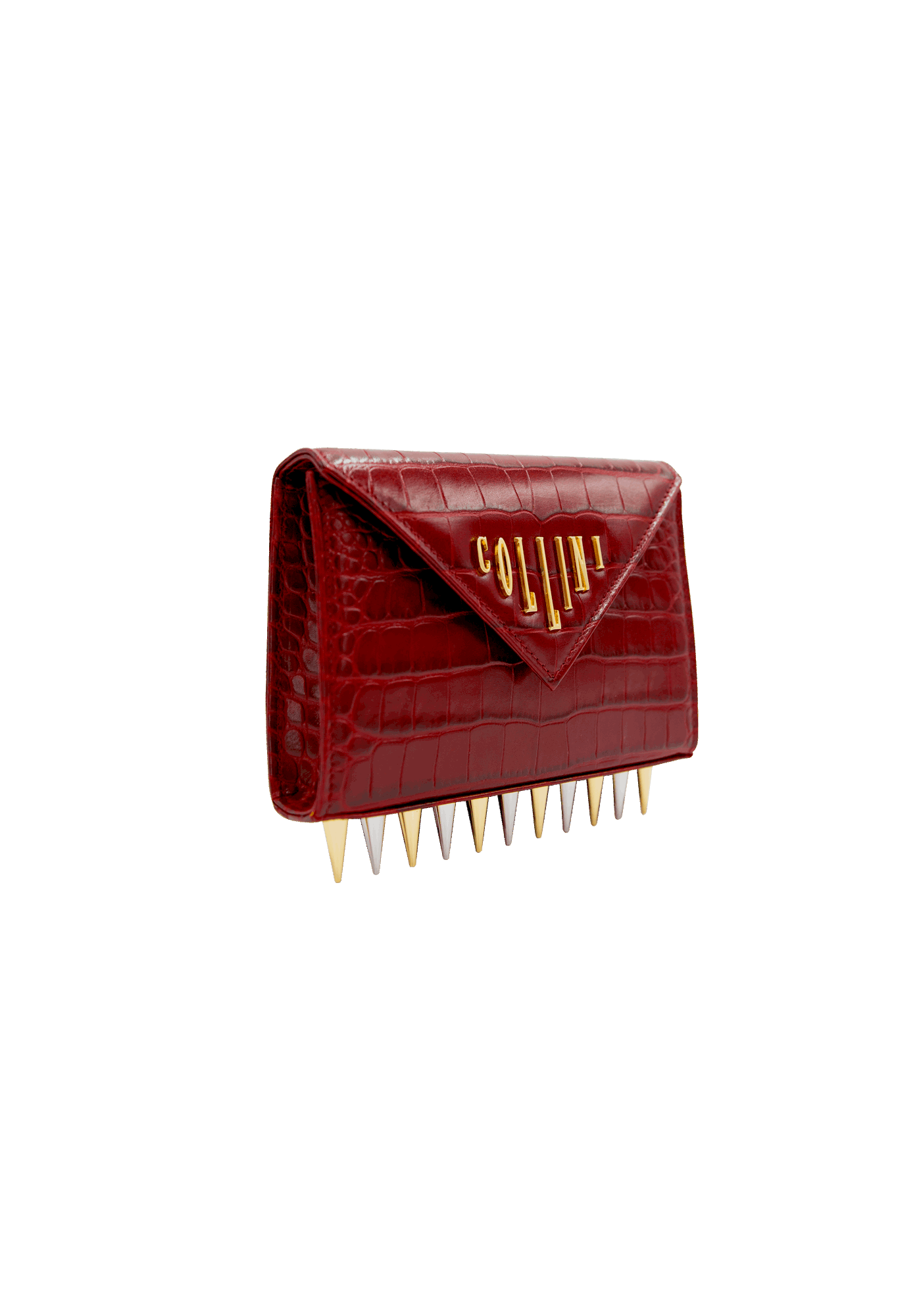 The Mini Killer black shoulder bag features a façon ‘Croco’ leather coating with a centered Collini golden logo. The delicate golden chain reminds the bi-colored spikes adorning the unique envelope shape of the item.