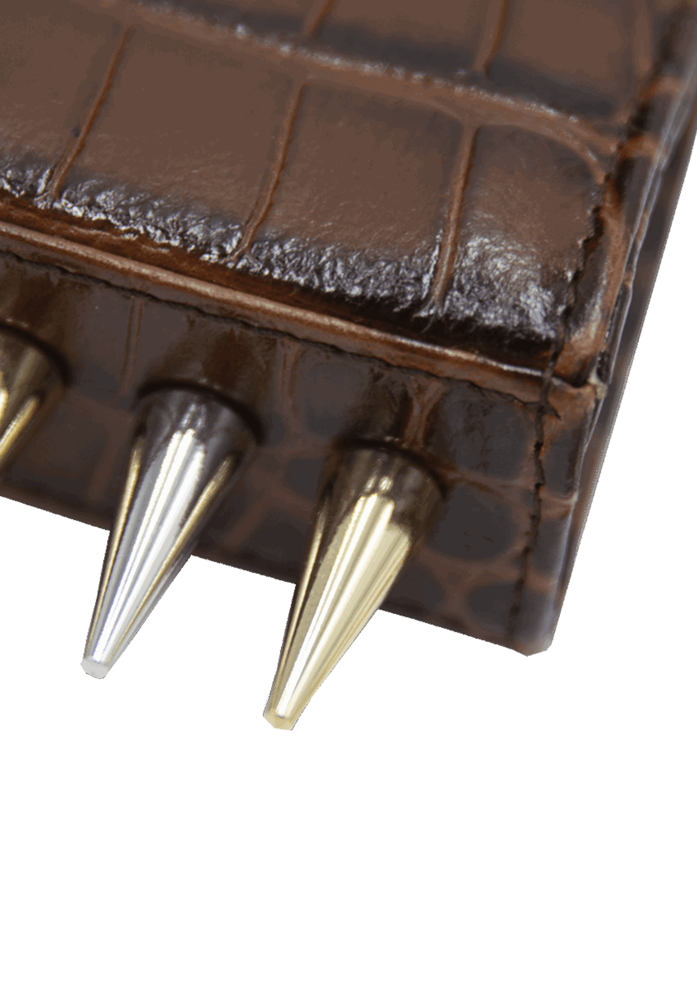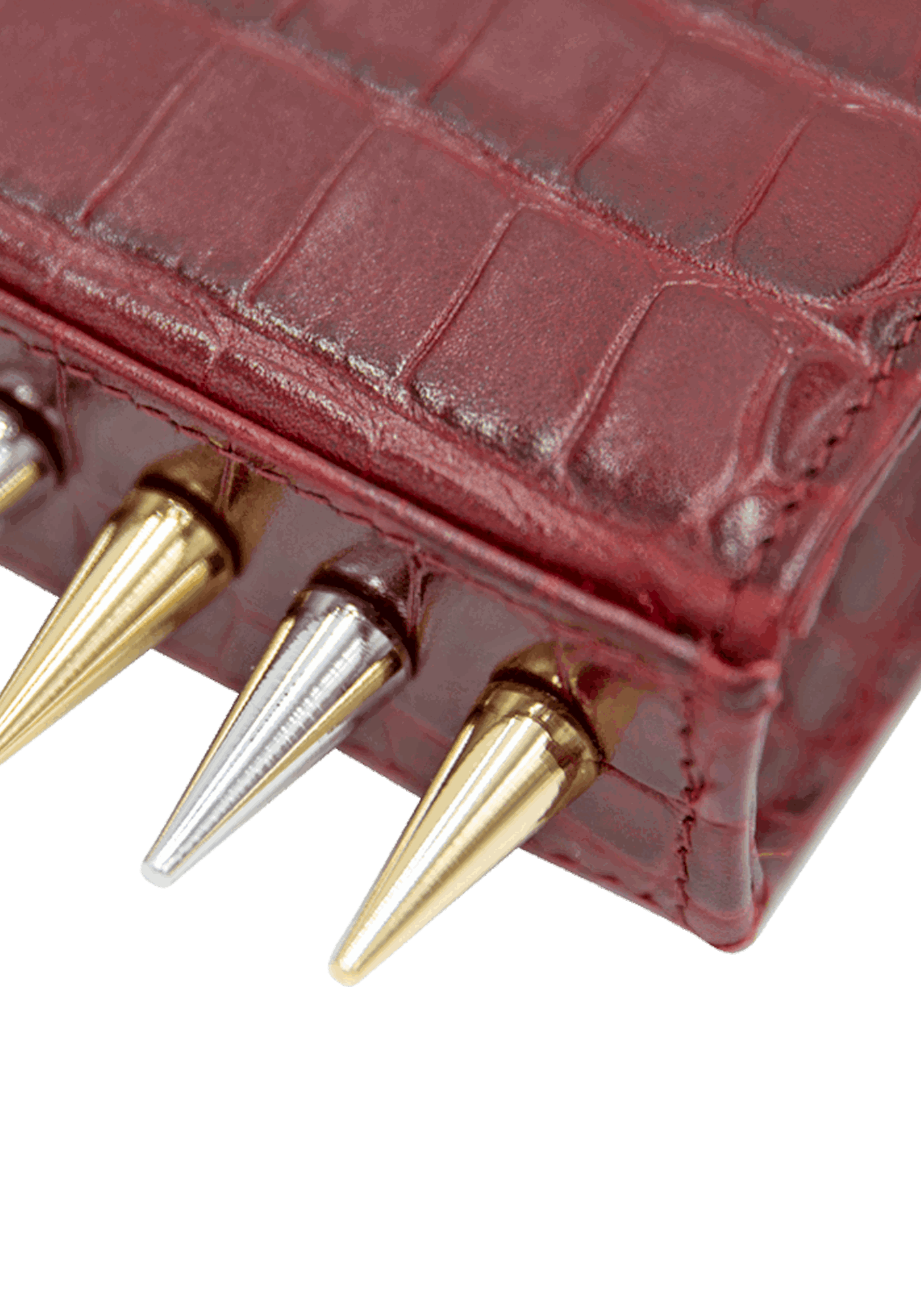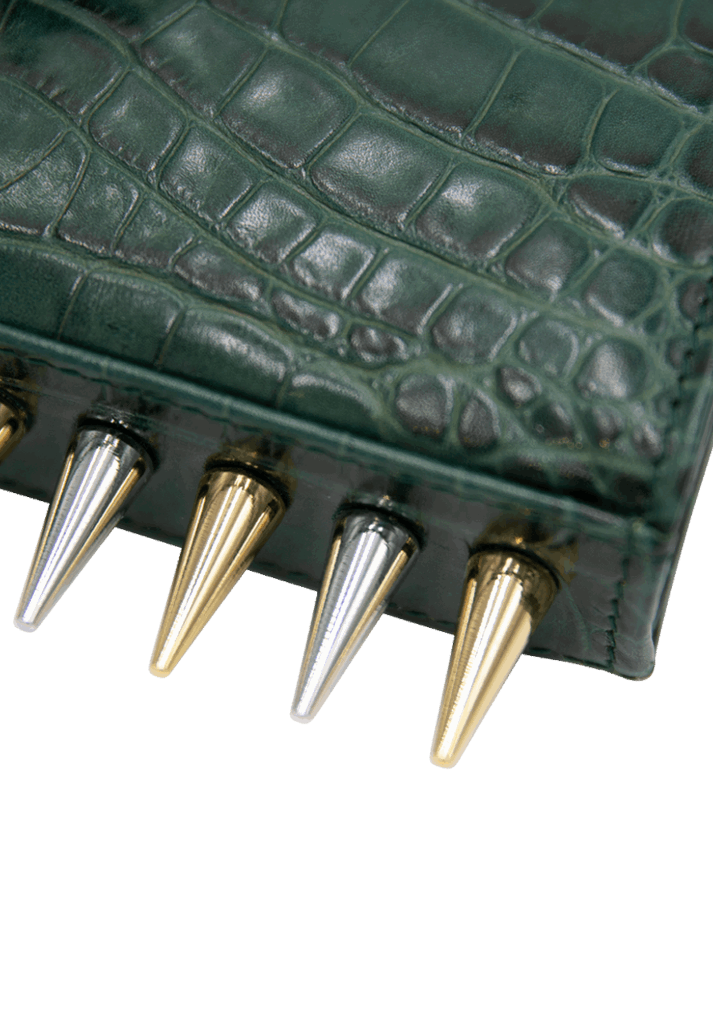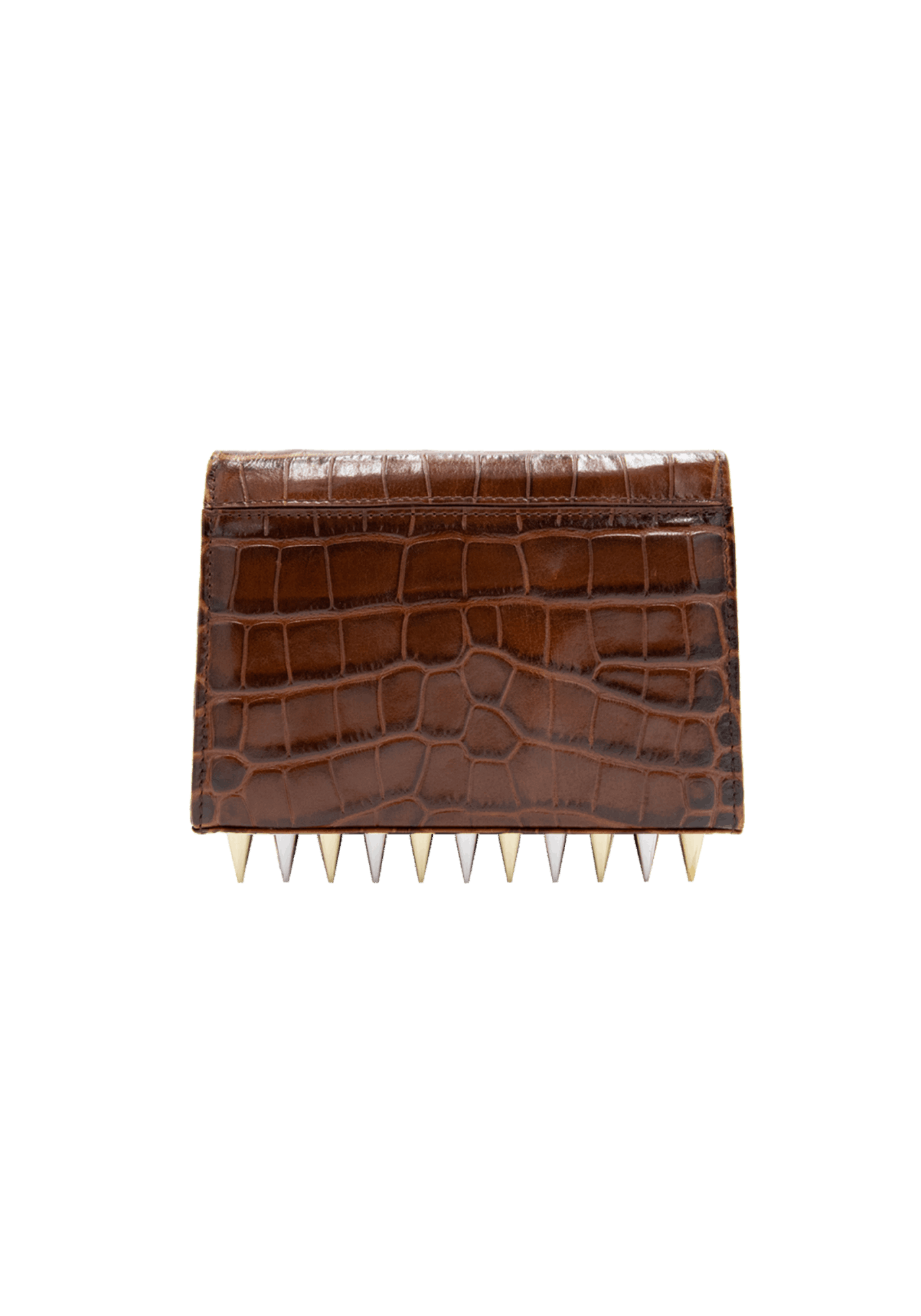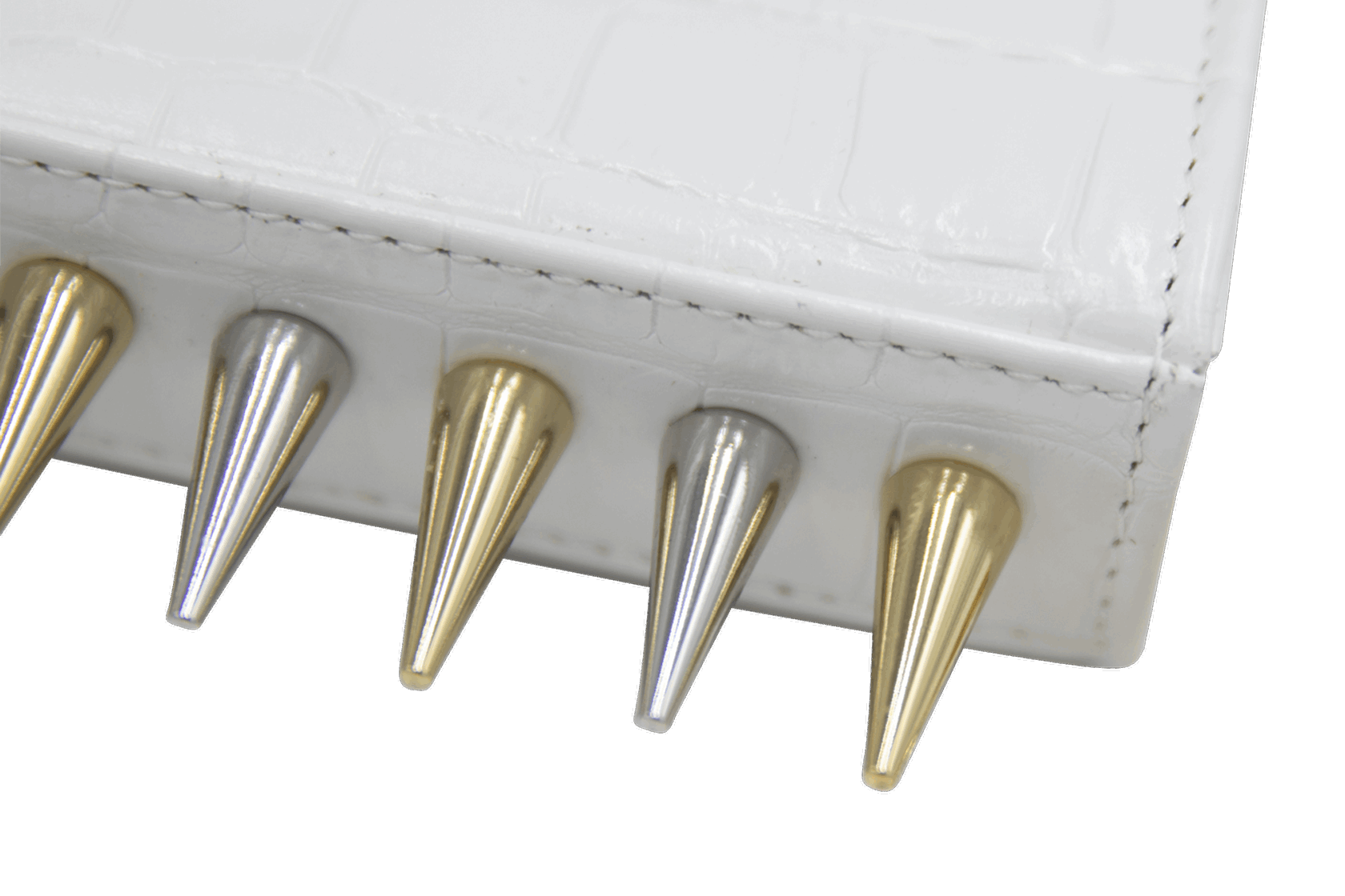 The Mini Killer black shoulder bag features a façon ‘Croco’ leather coating with a centered Collini golden logo. The delicate golden chain reminds the bi-colored spikes adorning the unique envelope shape of the item.