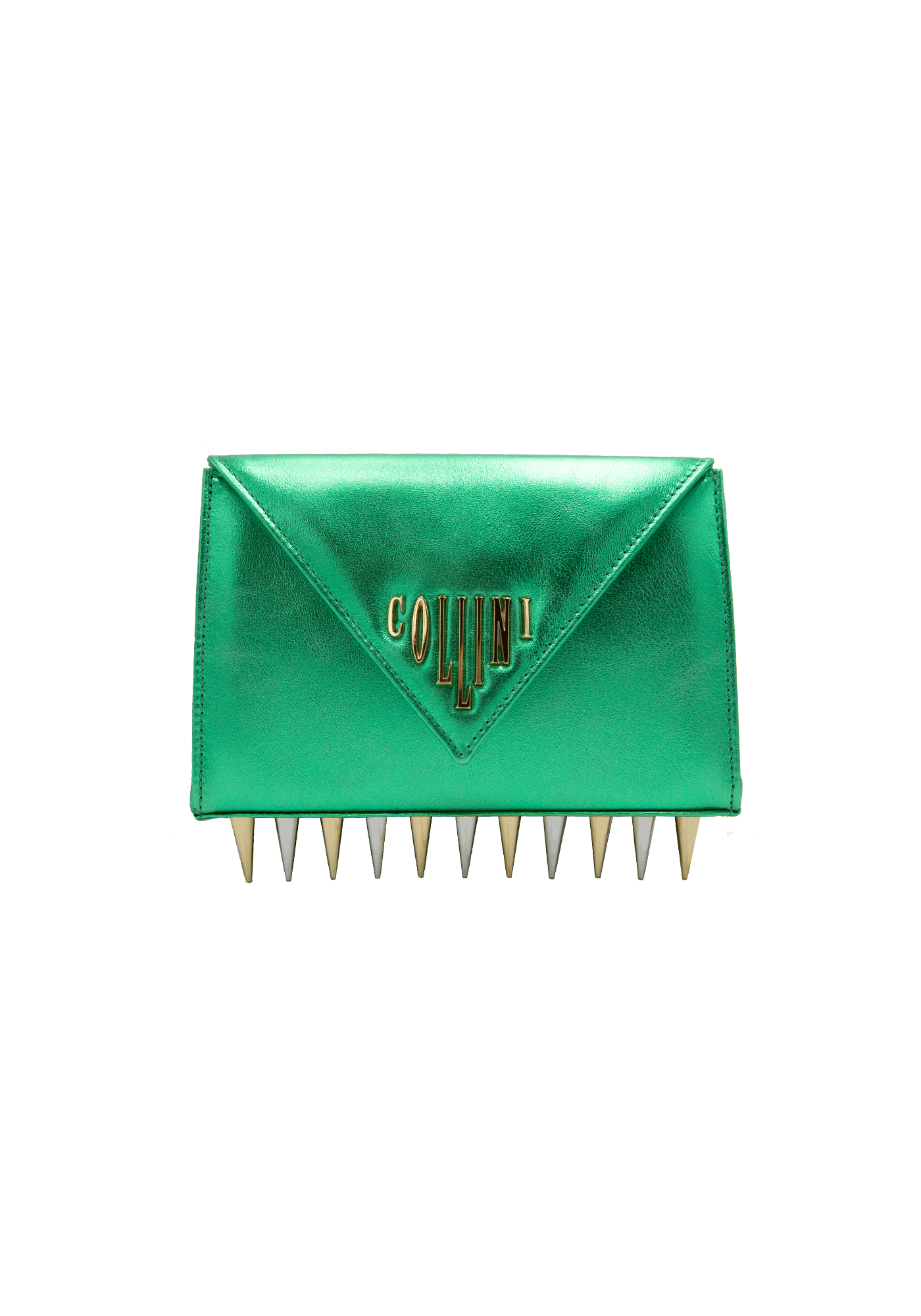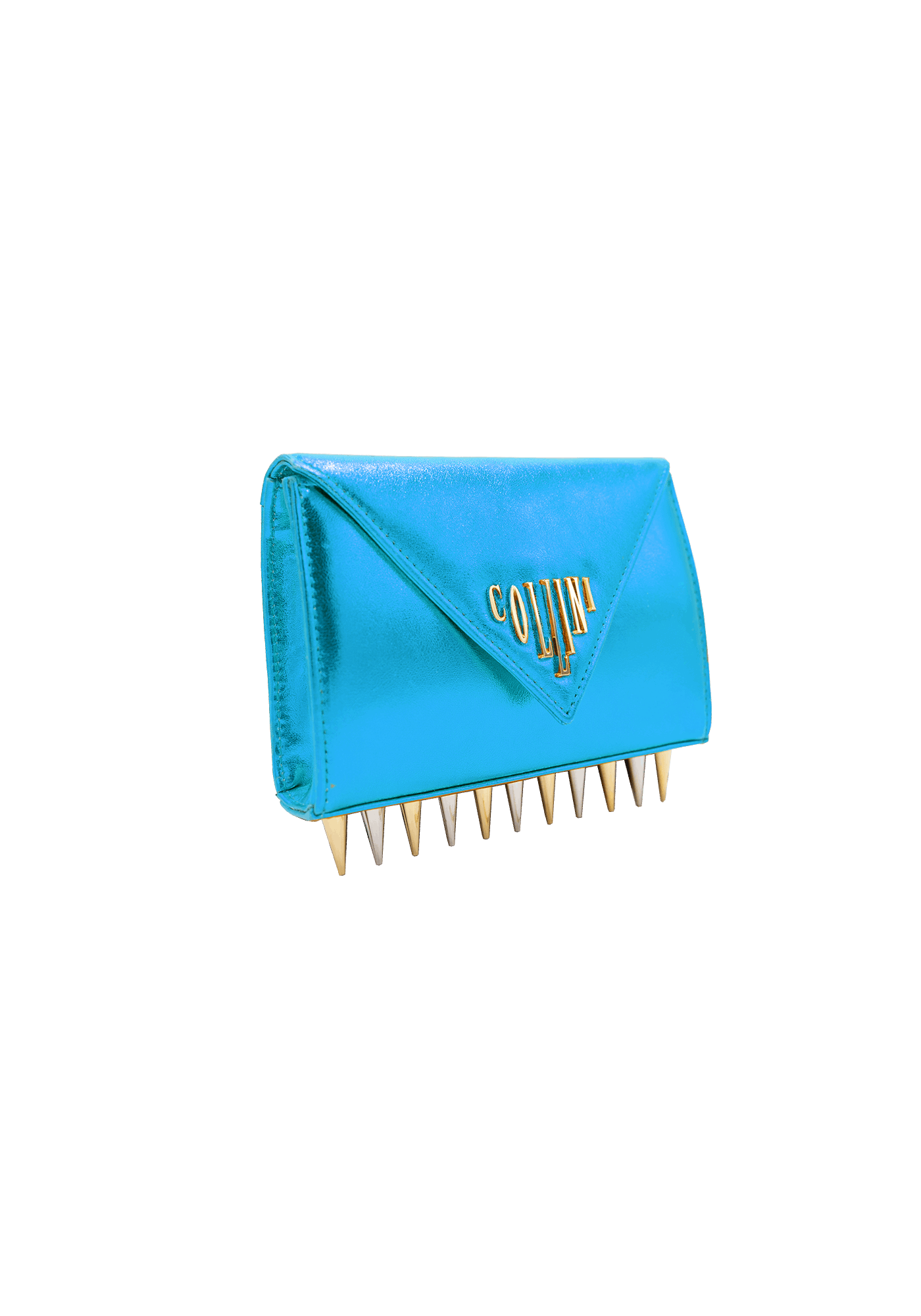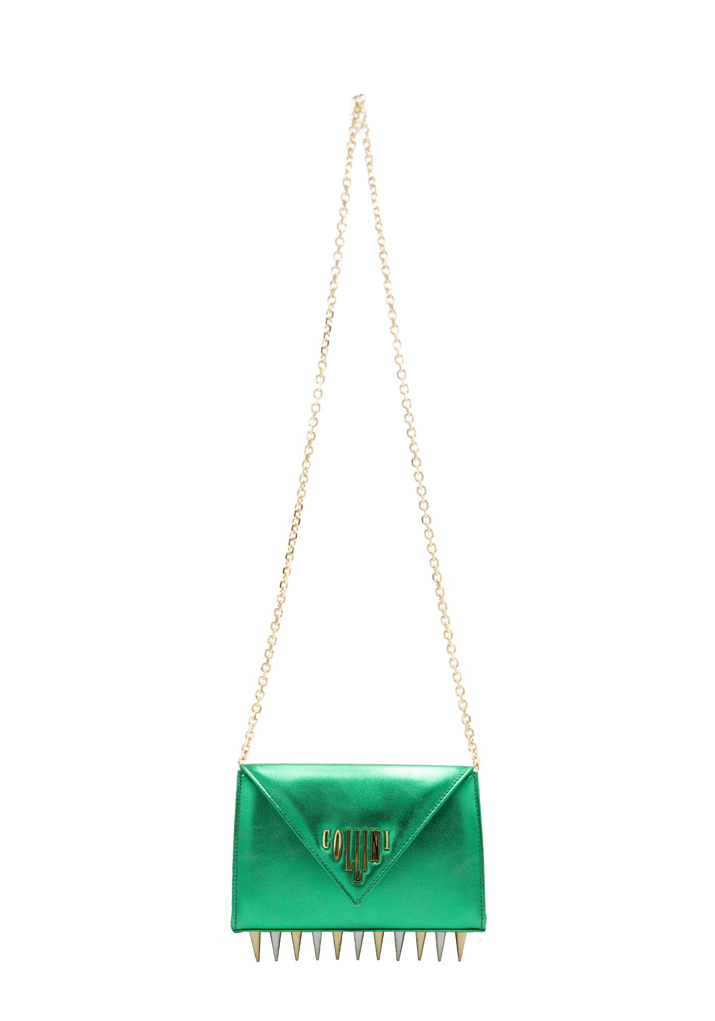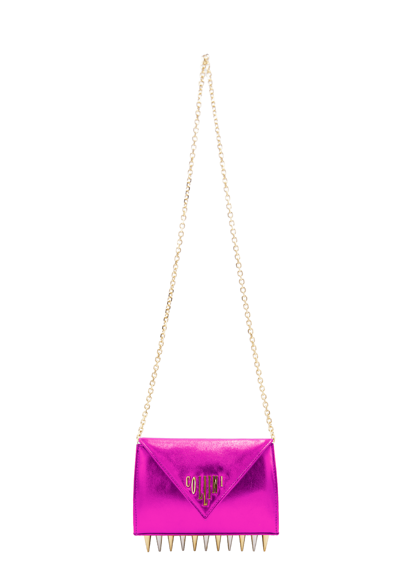 The Mini Killer blue shoulder bag features a bright and colourful leather coating with a centered Collini logo. The delicate golden chain reminds the bi-colored spikes adorning the unique envelope shape of the item.