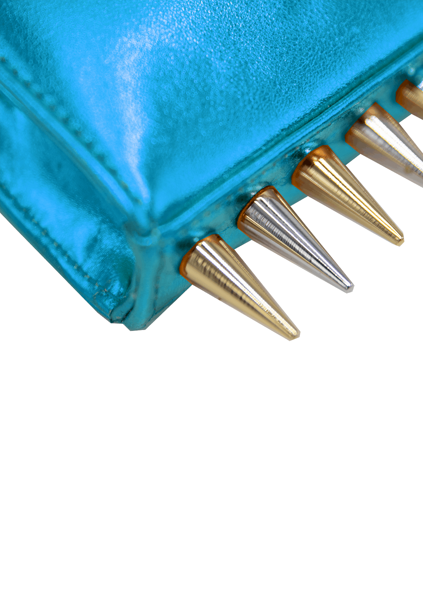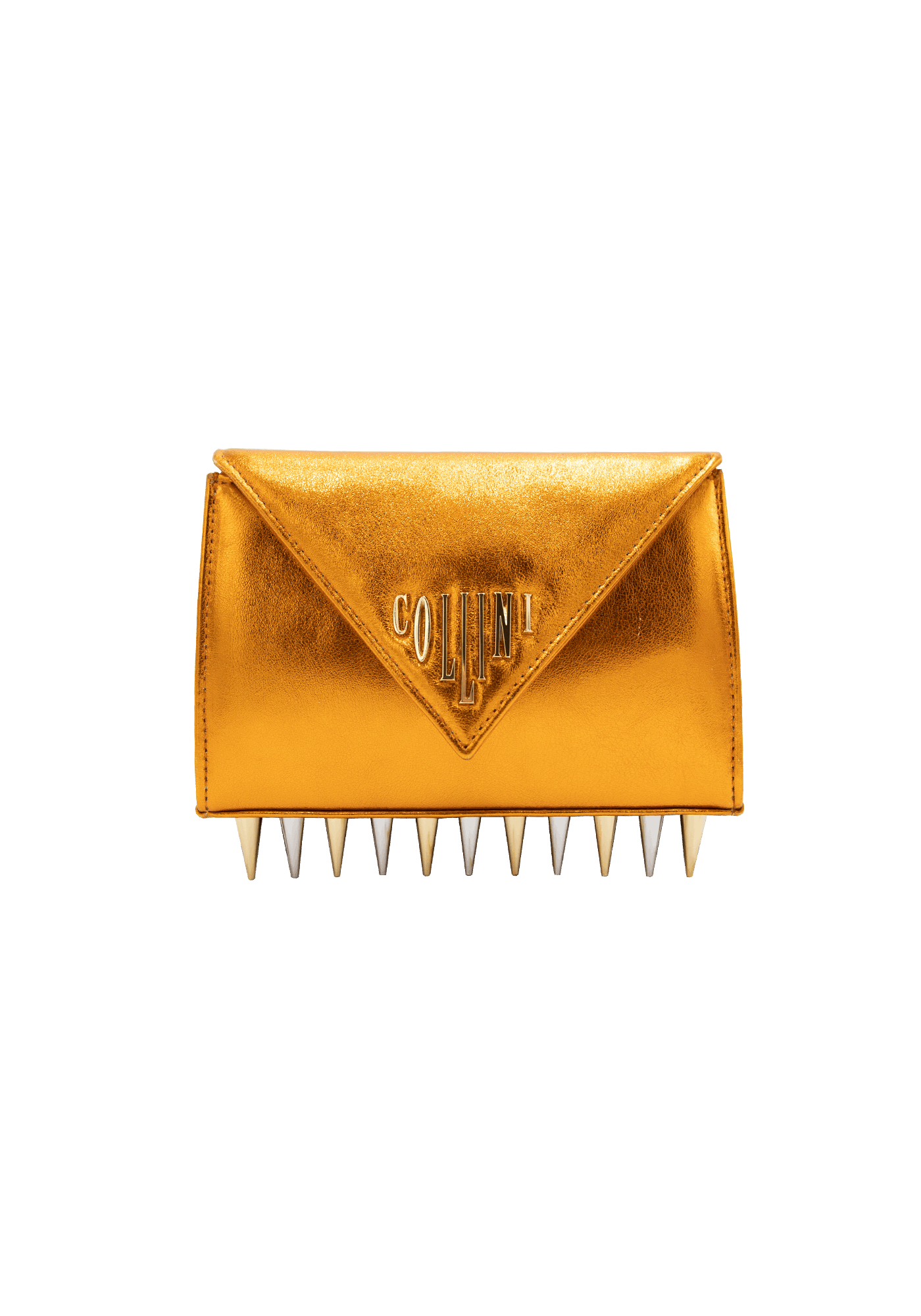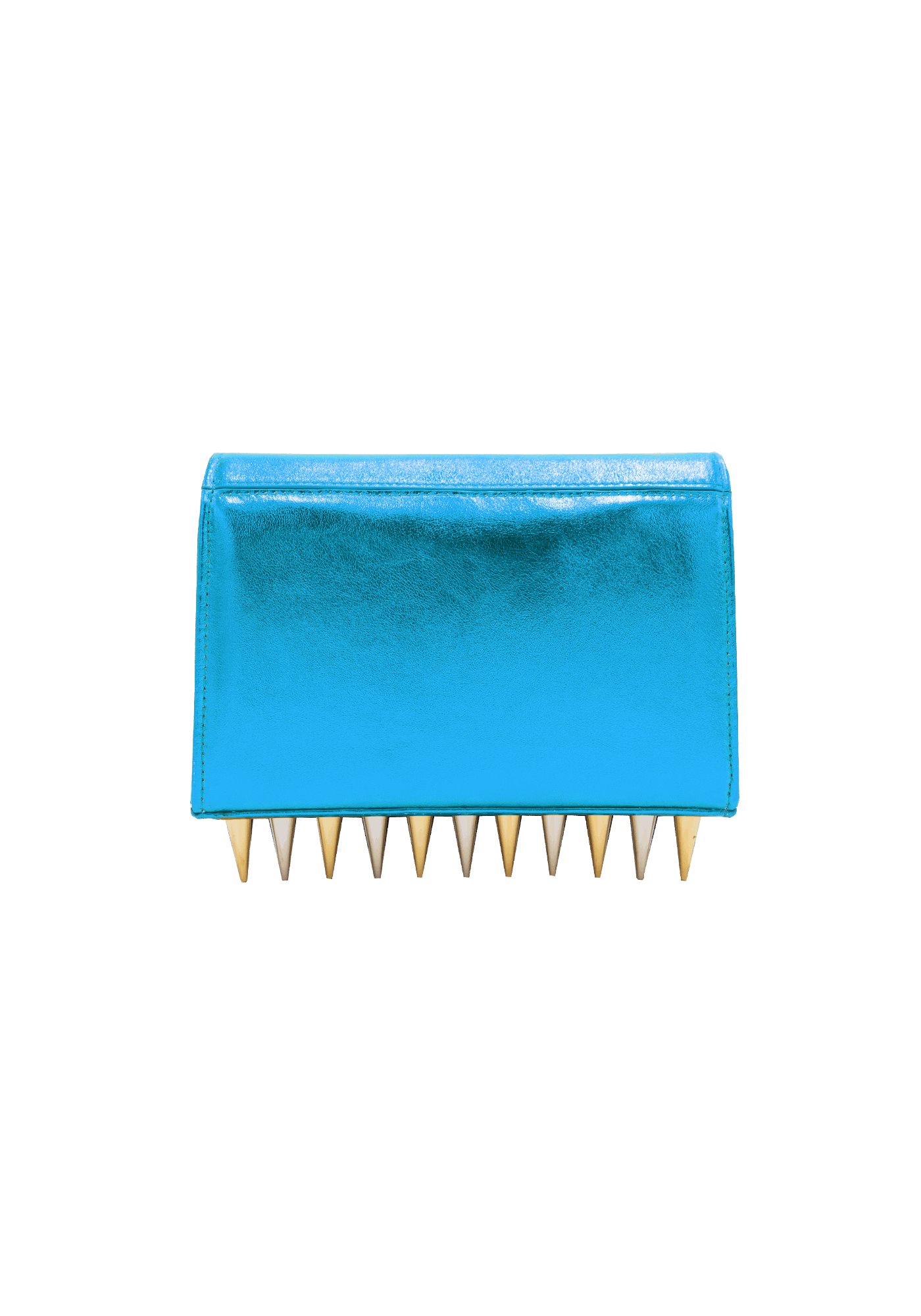 The Mini Killer blue shoulder bag features a bright and colourful leather coating with a centered Collini logo. The delicate golden chain reminds the bi-colored spikes adorning the unique envelope shape of the item.