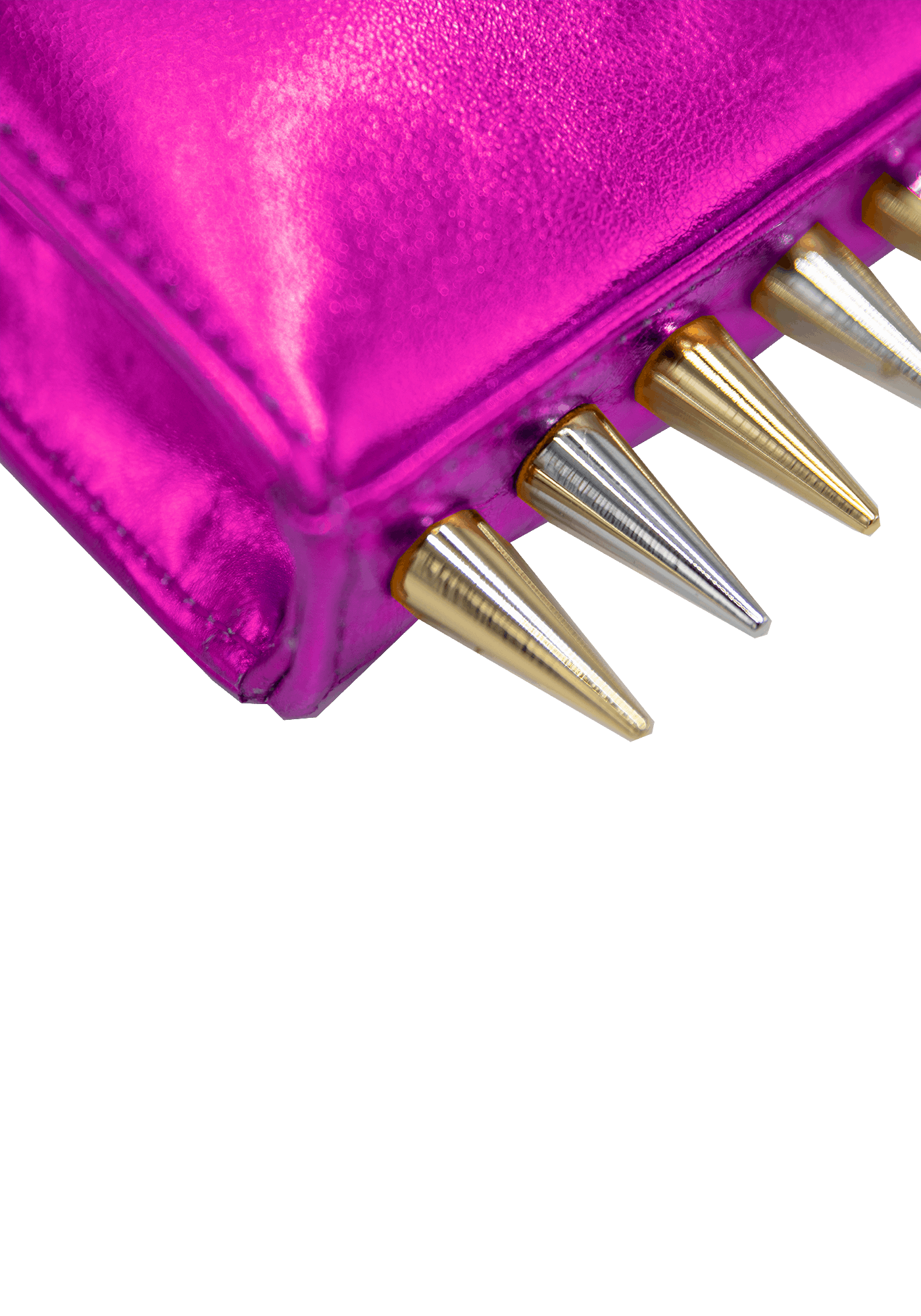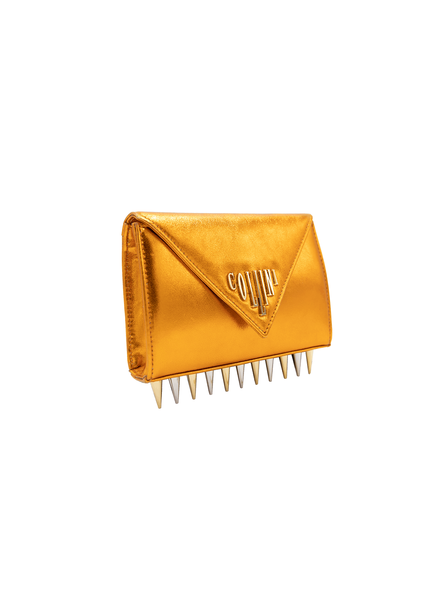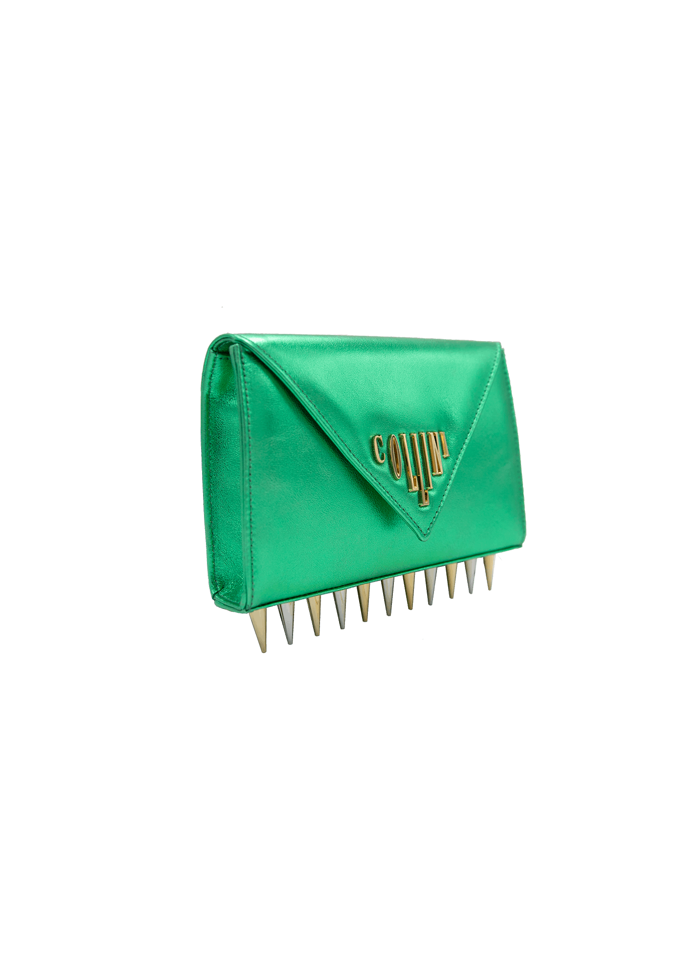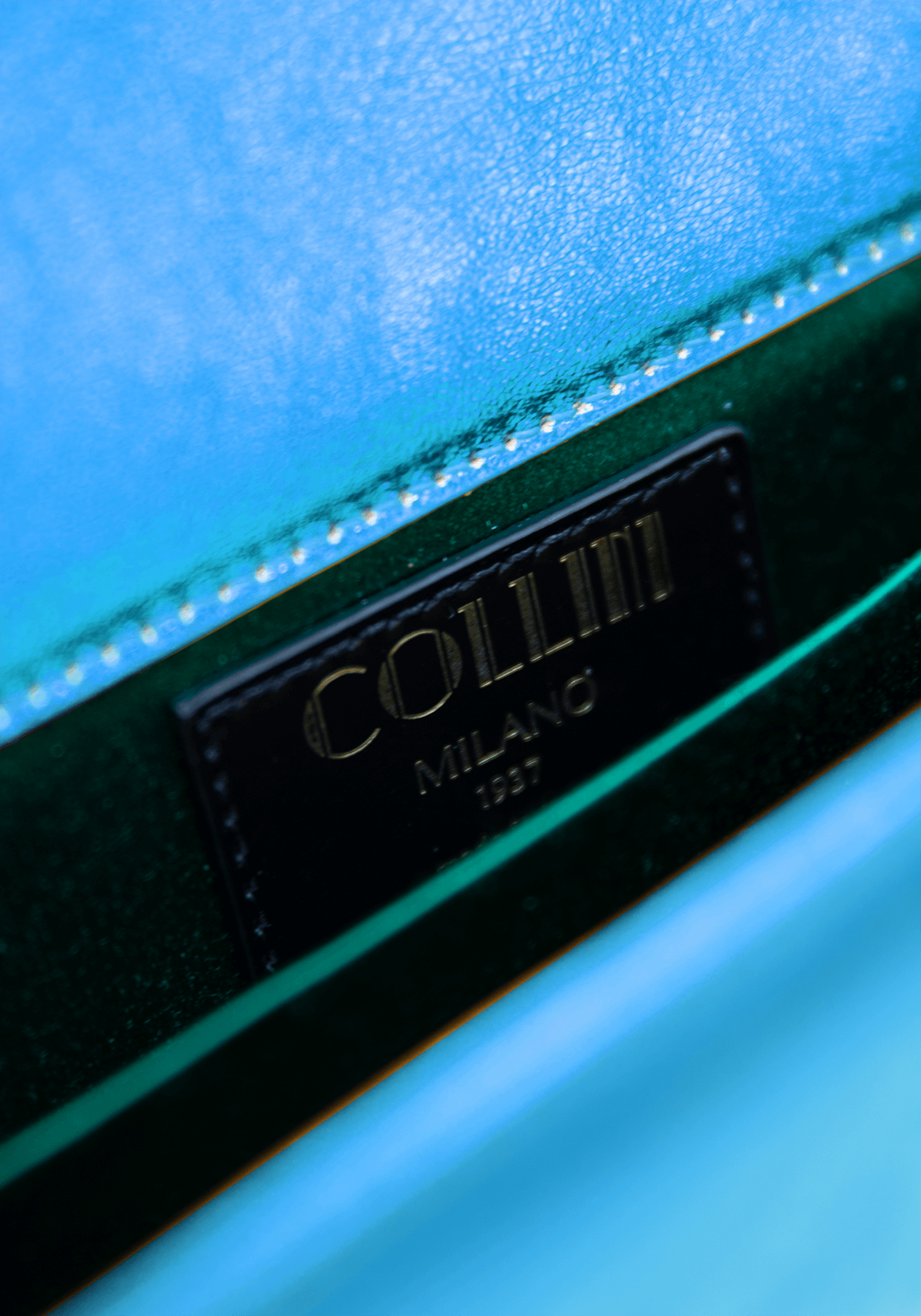 The Mini Killer blue shoulder bag features a bright and colourful leather coating with a centered Collini logo. The delicate golden chain reminds the bi-colored spikes adorning the unique envelope shape of the item.