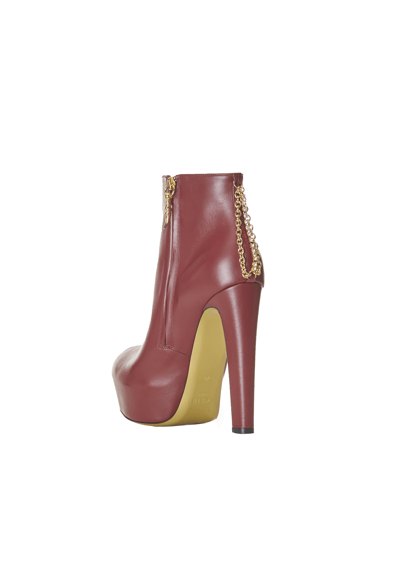 High-heel ankle-boot effortlessly blend elegance and edginess through its all-leather burnt sienna design and the heel chains adding attitude to the overall look. The side-zipper is ensuring easy wear.