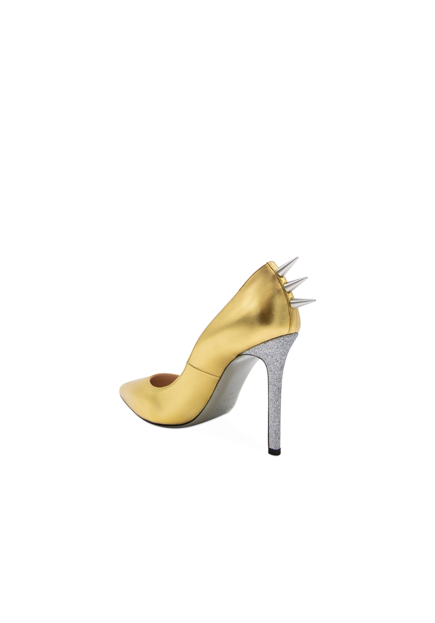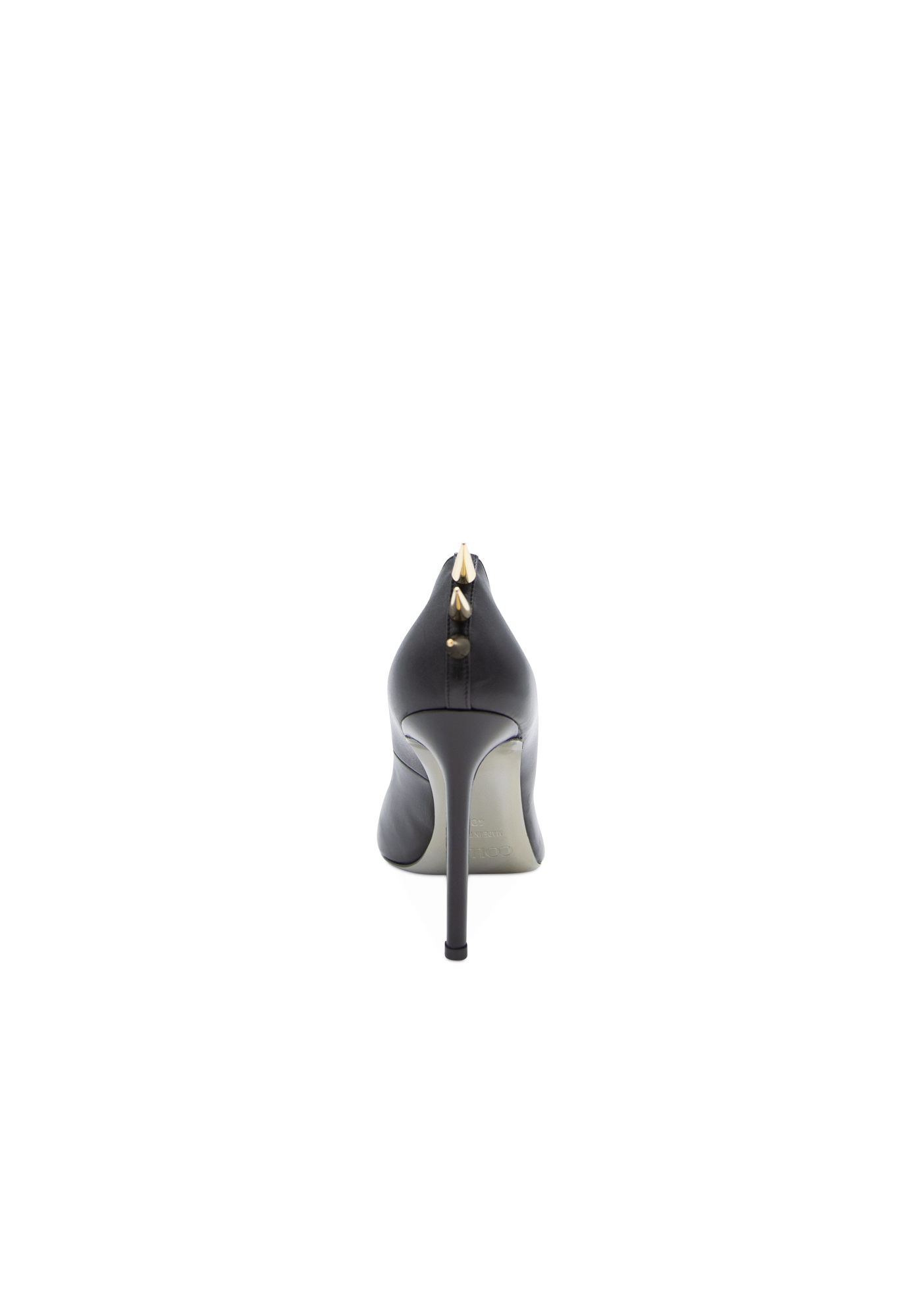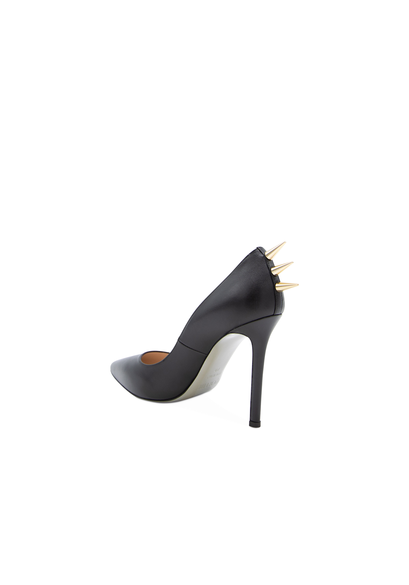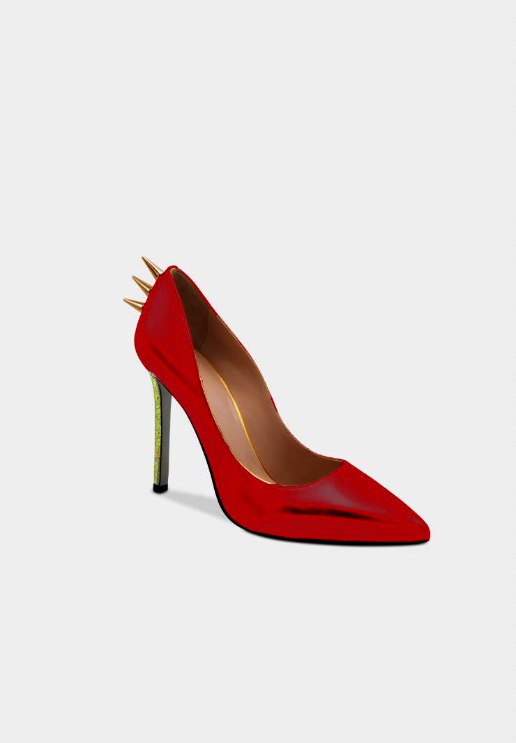 The St Barbara high-heeled leather stilettos with their glossy surface are a key piece of the collection. The golden spikes on the back are the iconic touch of Collini shouting femininity, power, and sexiness.