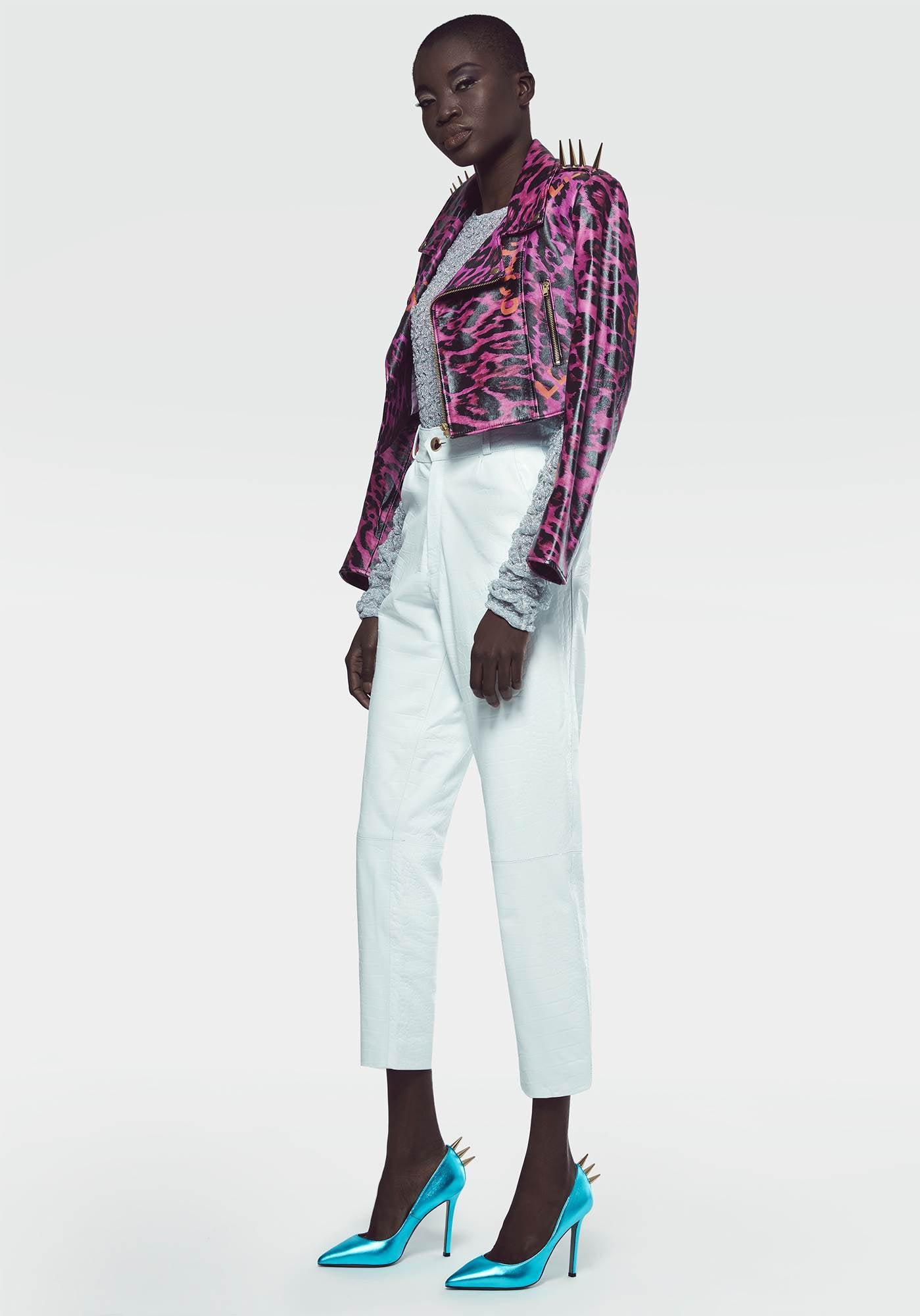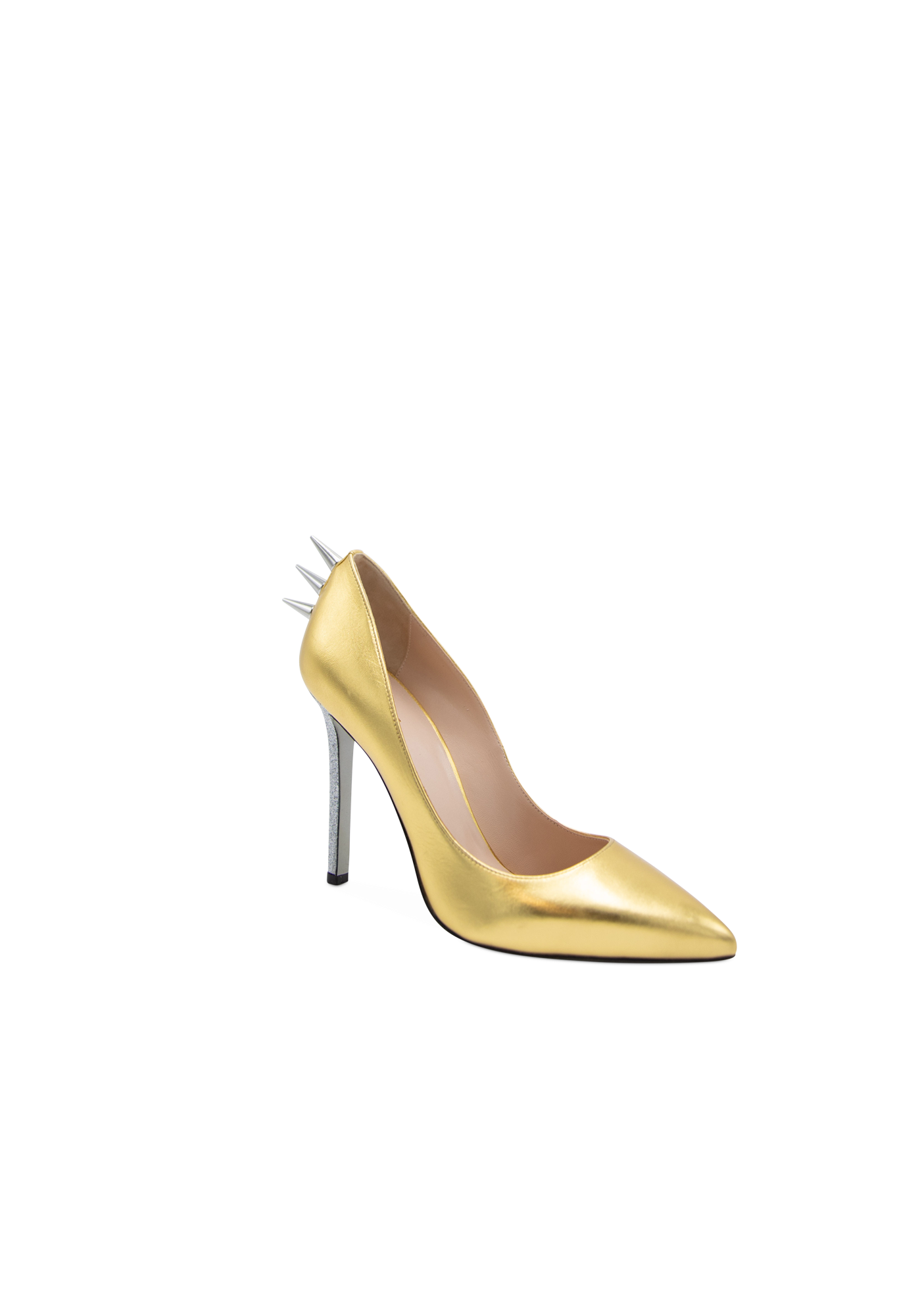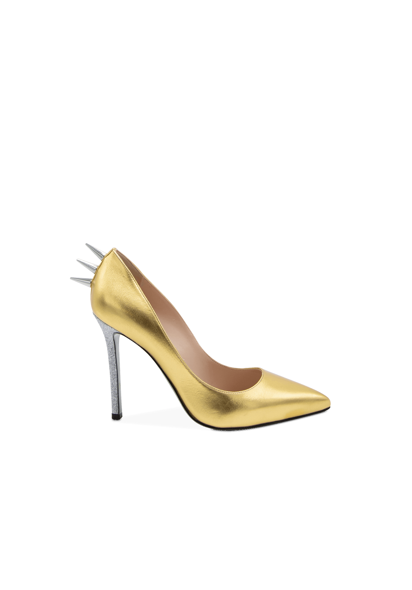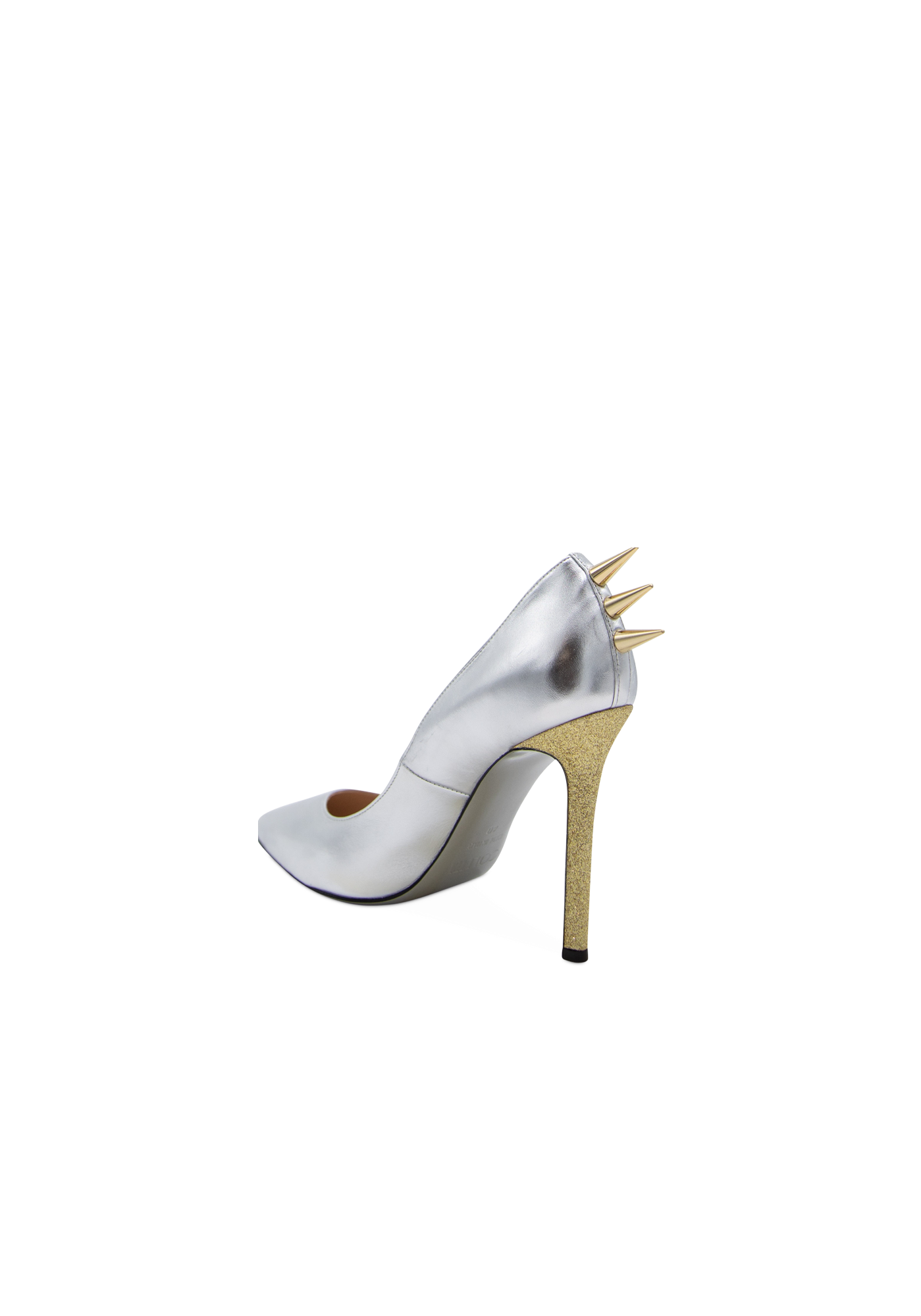 The St Barbara high-heeled leather stilettos with their glossy surface are a key piece of the collection. The golden spikes on the back are the iconic touch of Collini shouting femininity, power, and sexiness.
