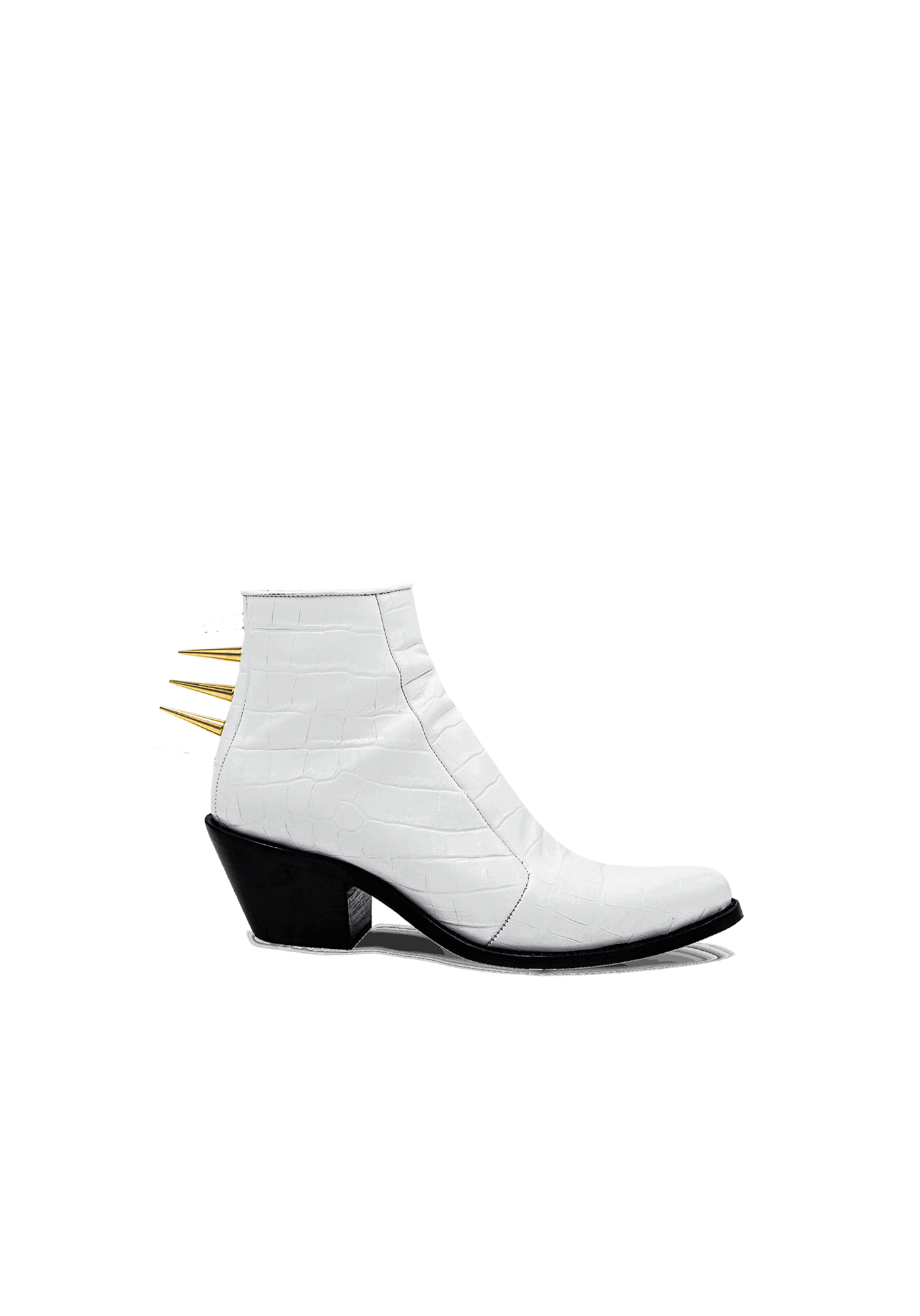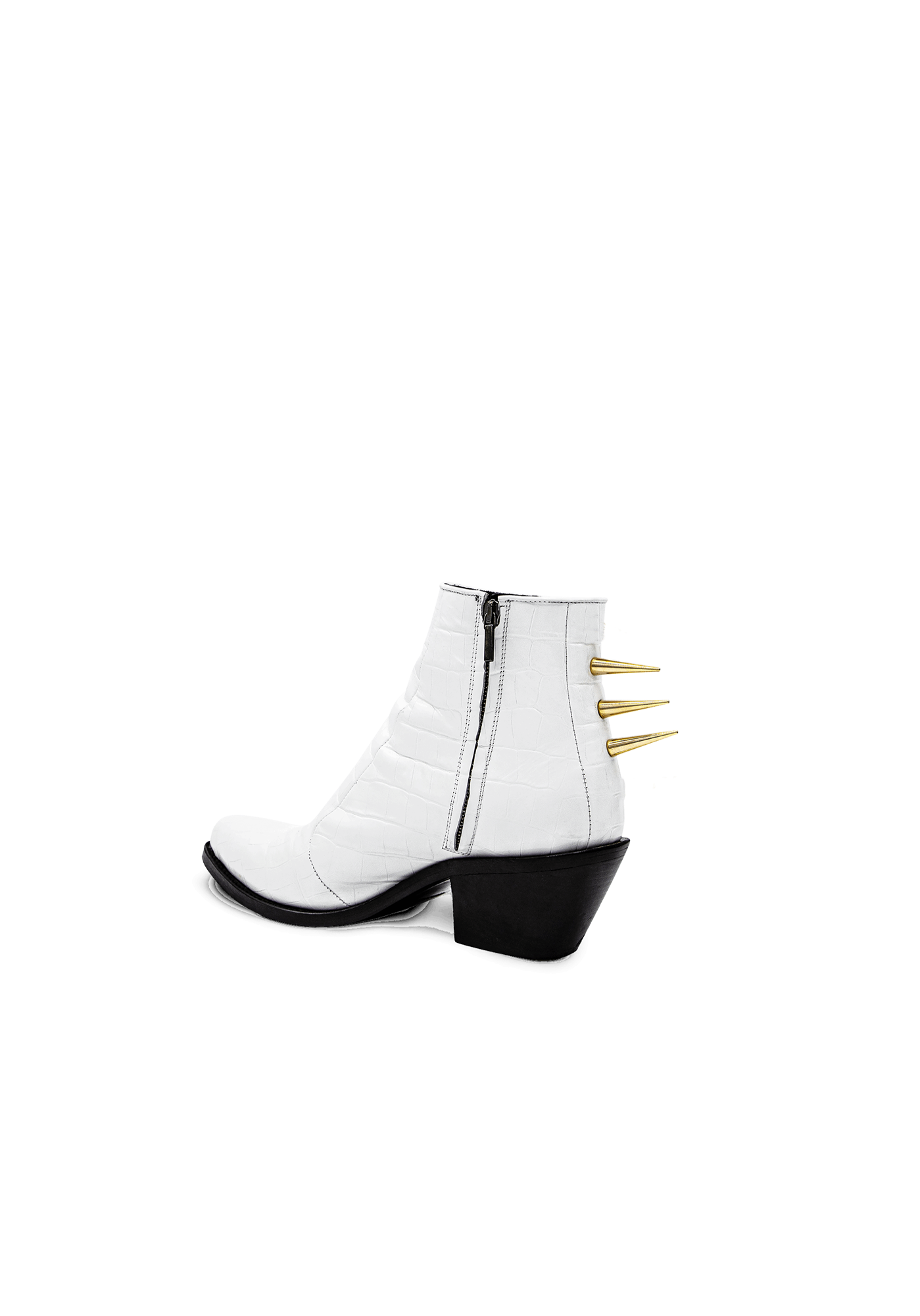The Stellar mid-heeled leather façon ‘Croco’ ankle boots represent one of the key items of the brand. The extravagant and provocative golden spikes are attached to the back of the shoe shouting standing out singularity.