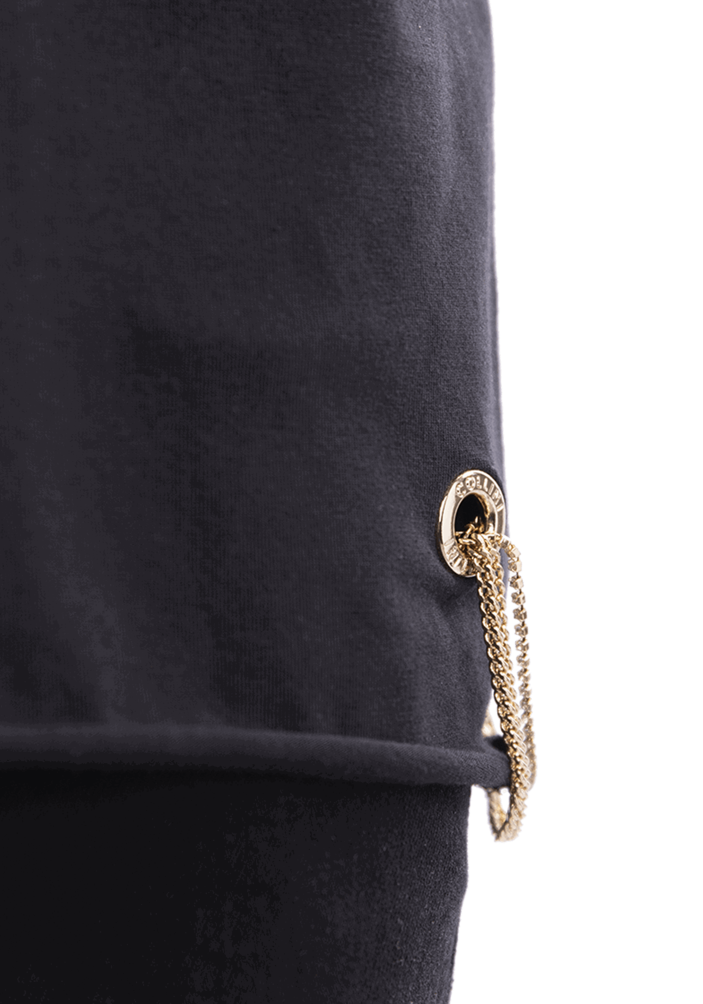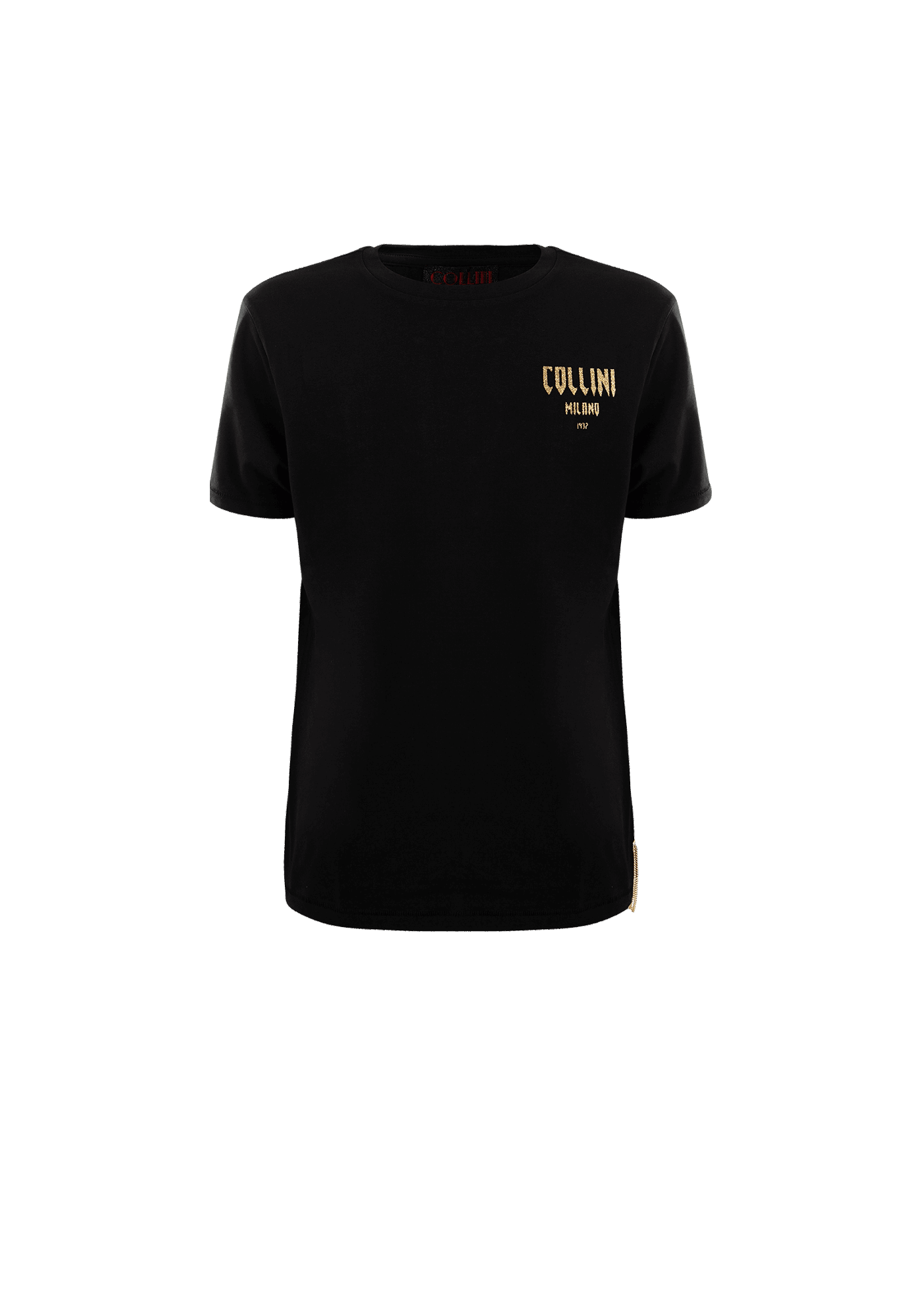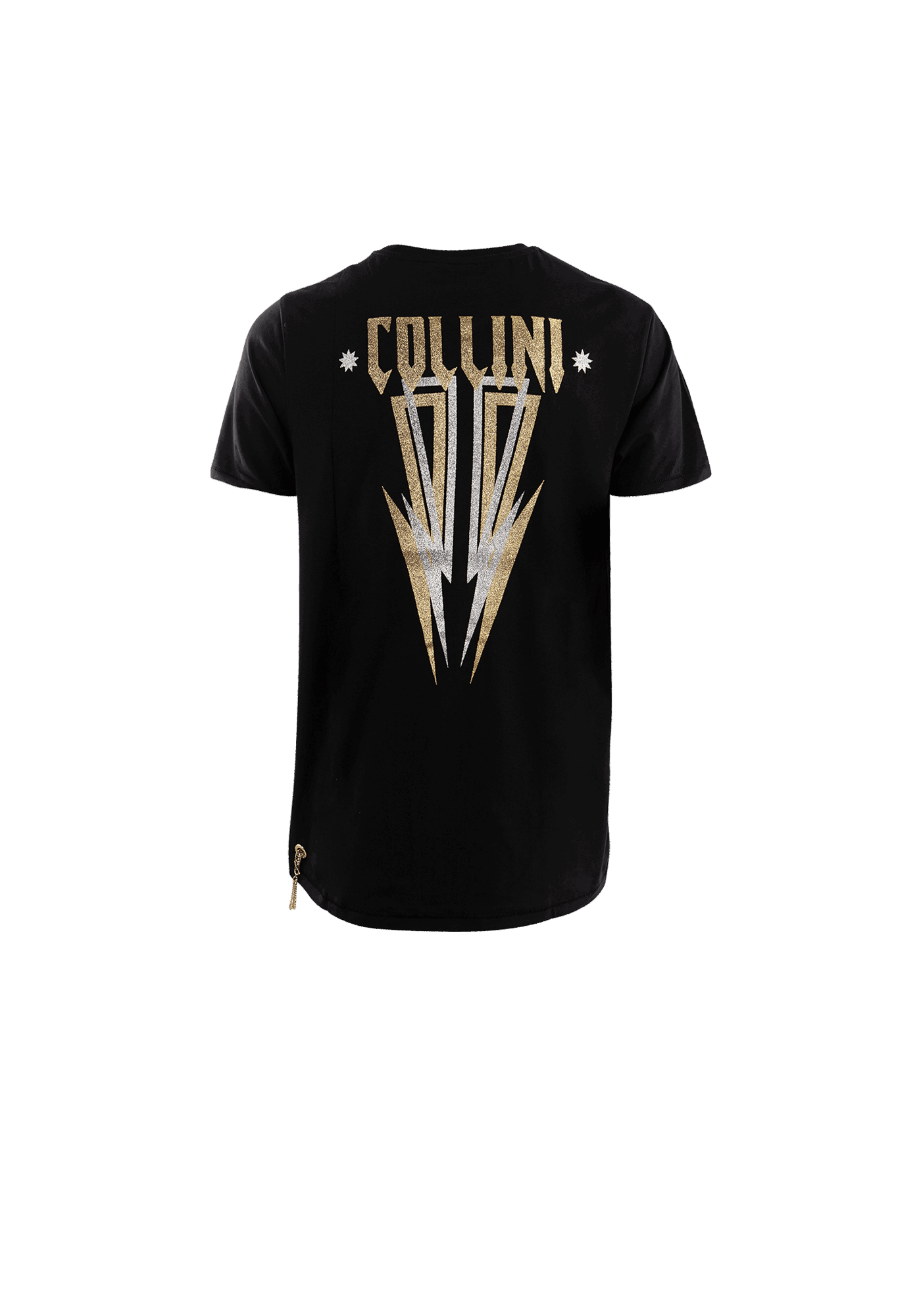 The Thamuz t-shirt features the Collini logo on the upper left side of the garment and a golden and silver Collini design on the back. On the bottom right of the t-shirt is a golden chain passing through two golden rings.