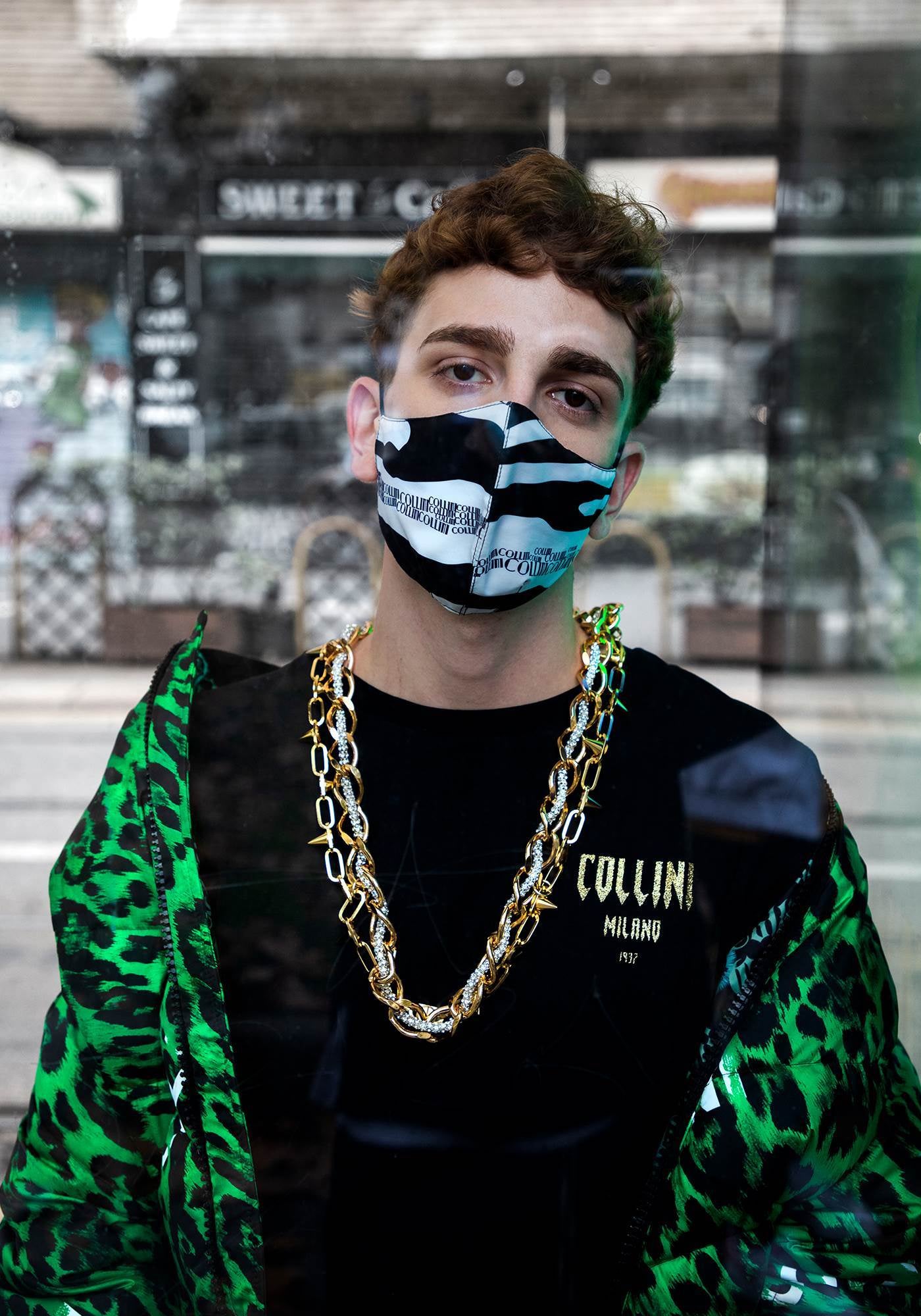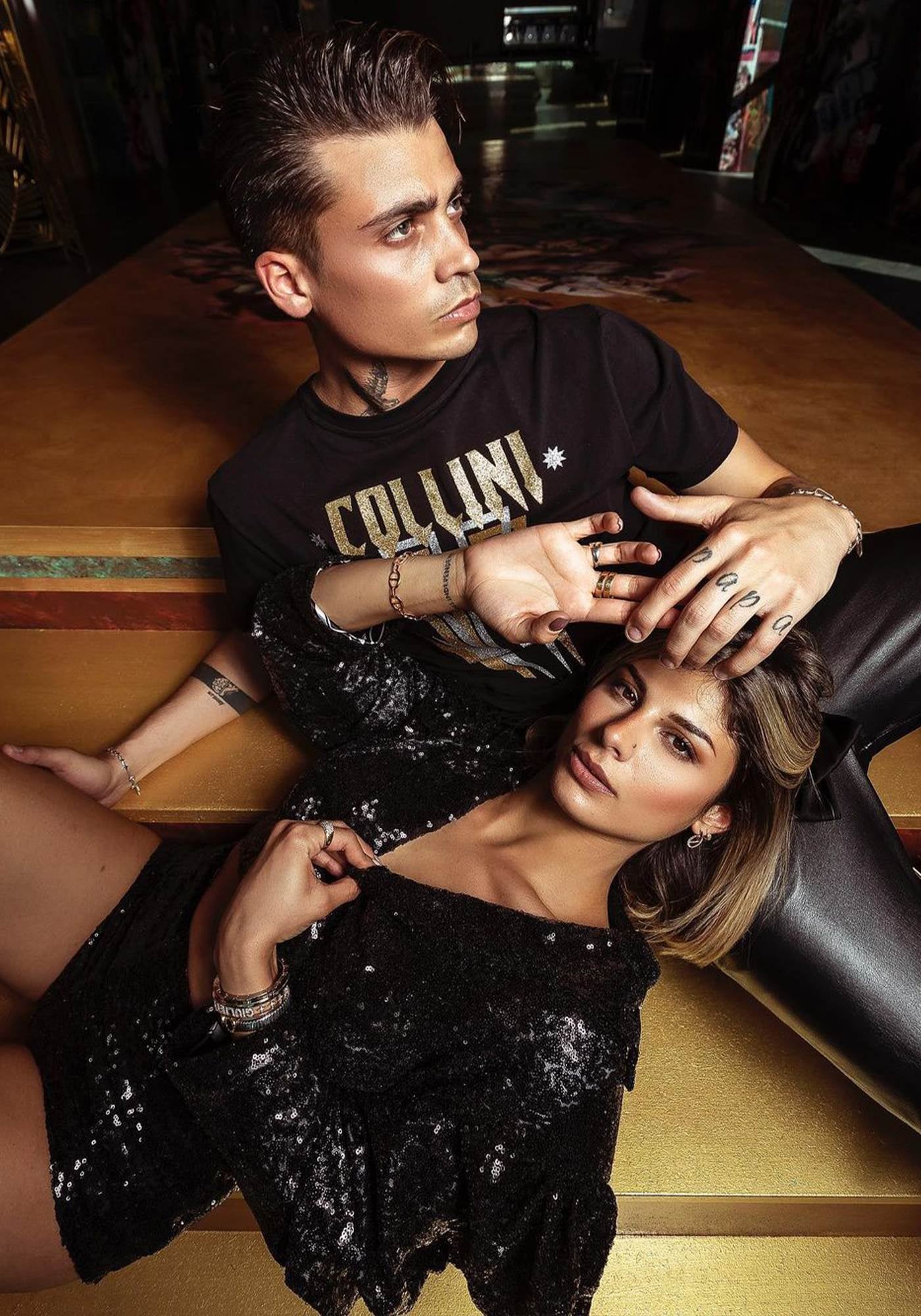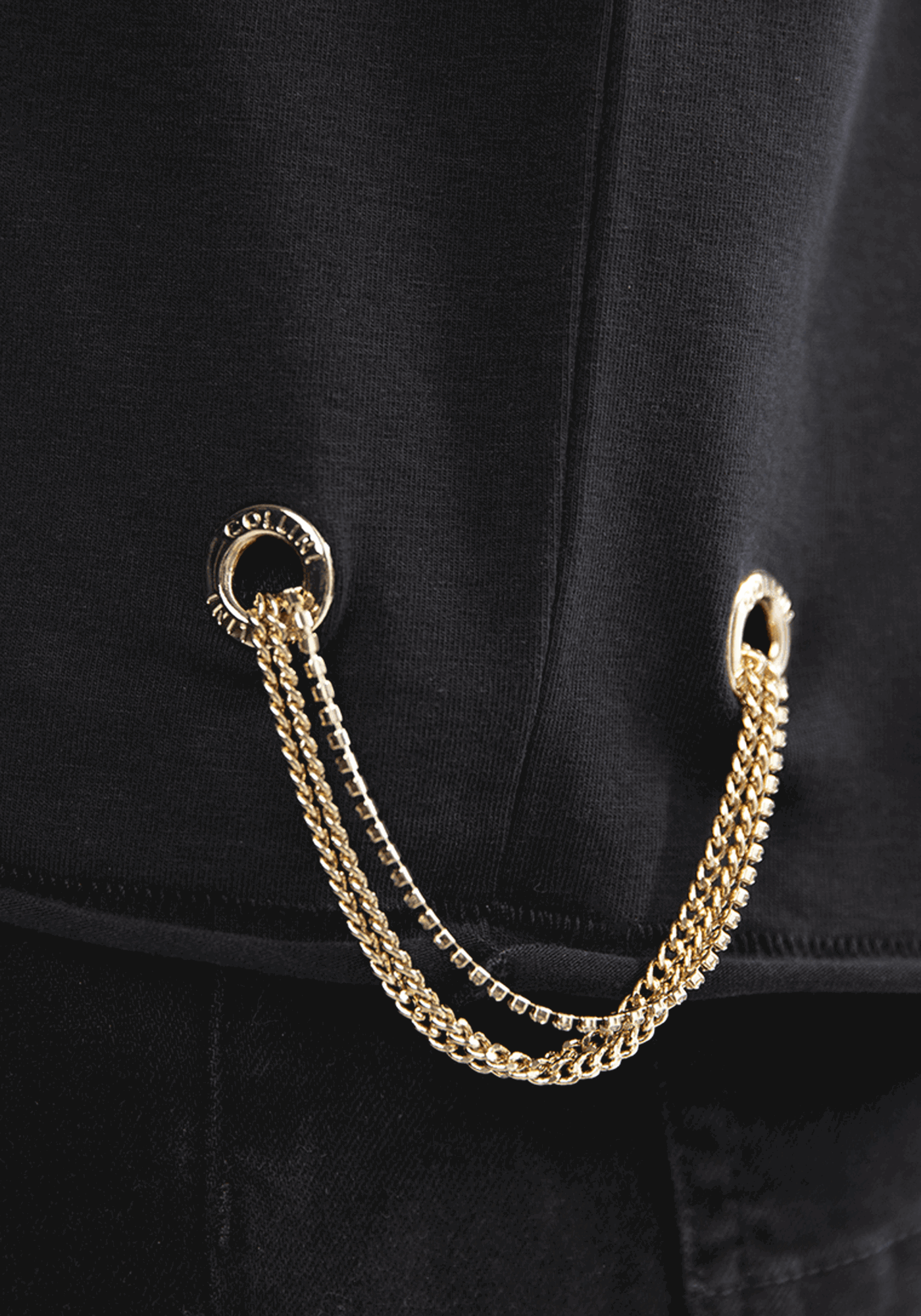 The Thamuz t-shirt features the Collini logo on the upper left side of the garment and a golden and silver Collini design on the back. On the bottom right of the t-shirt is a golden chain passing through two golden rings.