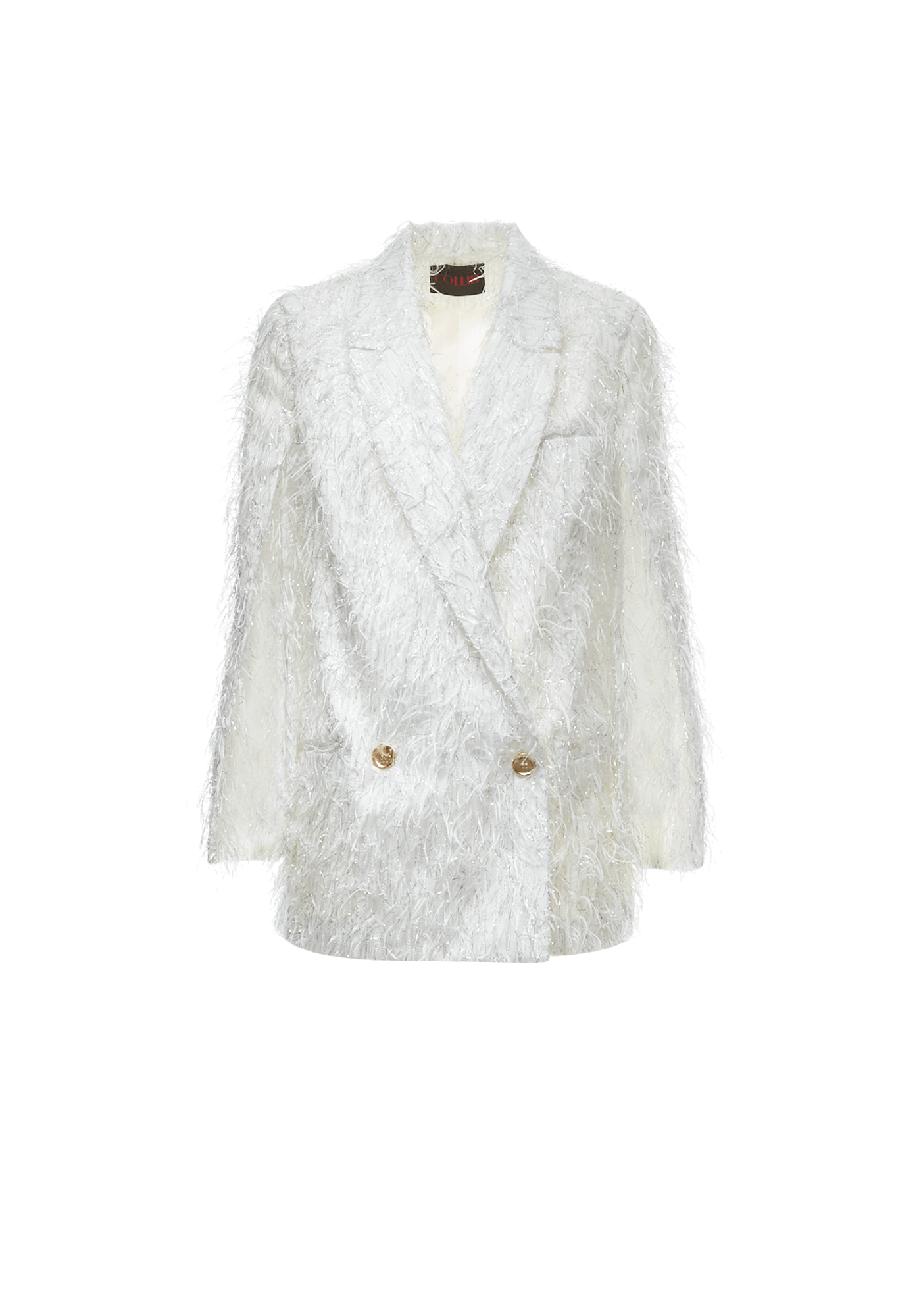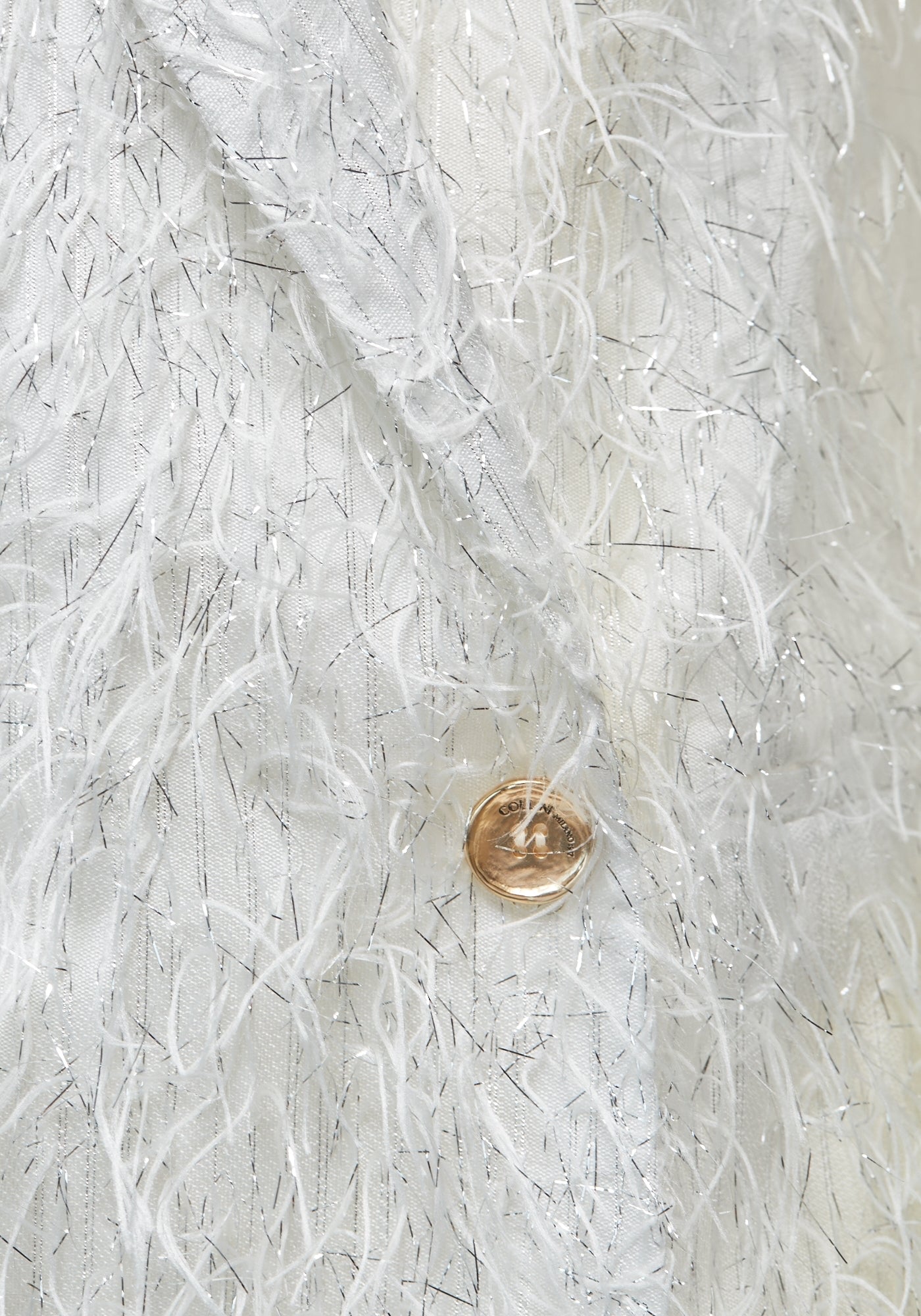 This white blazer that's rewriting the rules of sophistication. The crisp white hue sets the stage for a look that's both timeless and contemporary, while the feather detailing adds a touch of whimsical glamour.